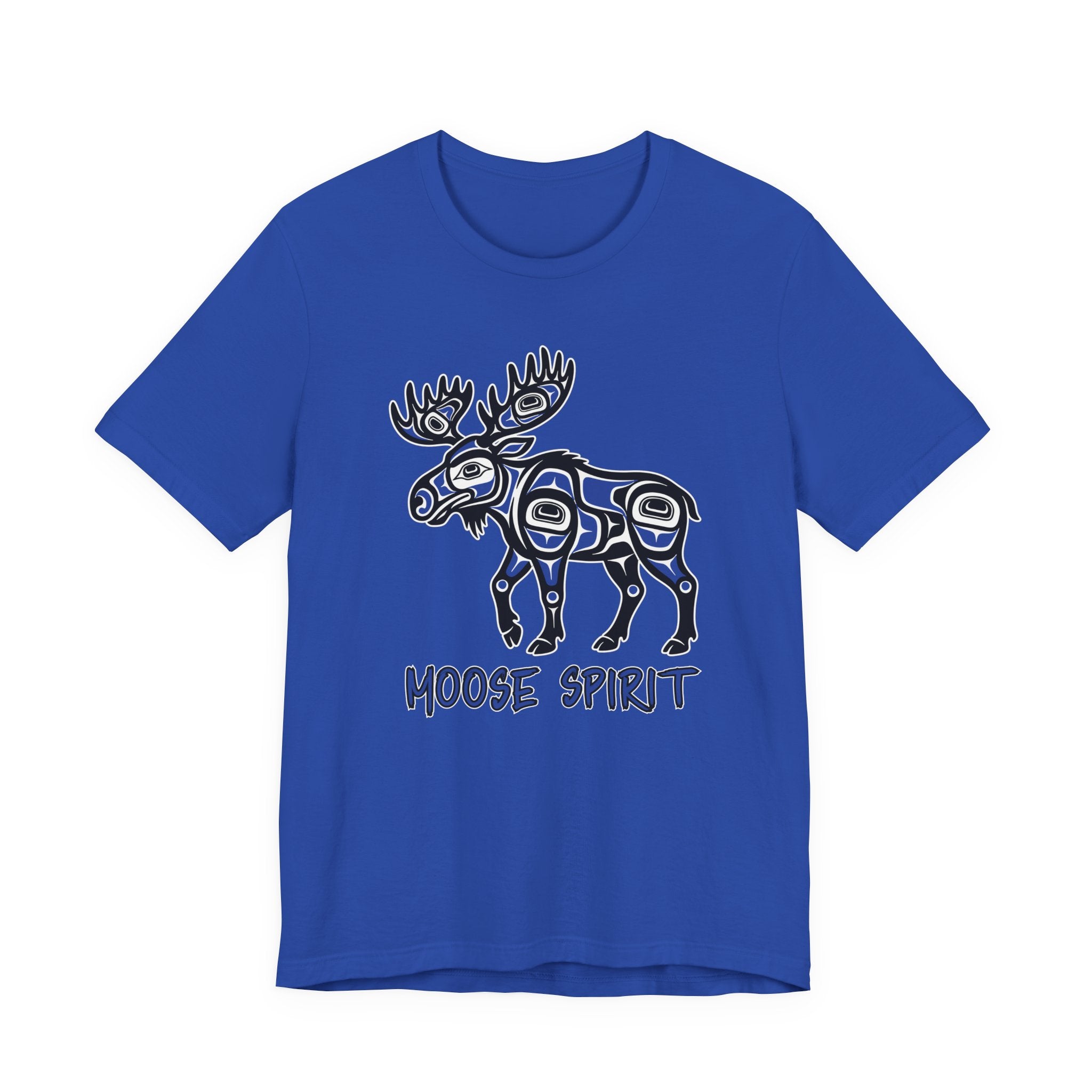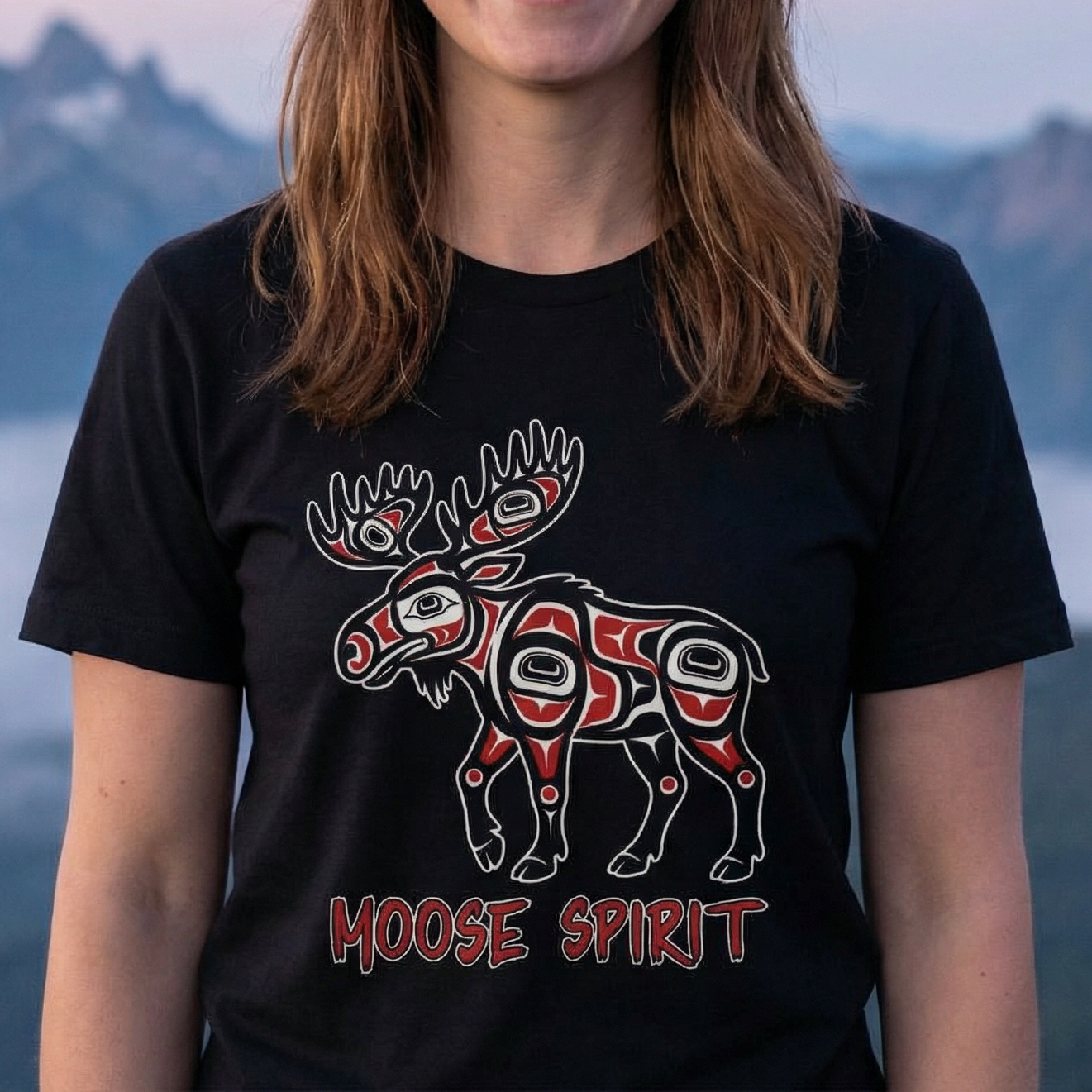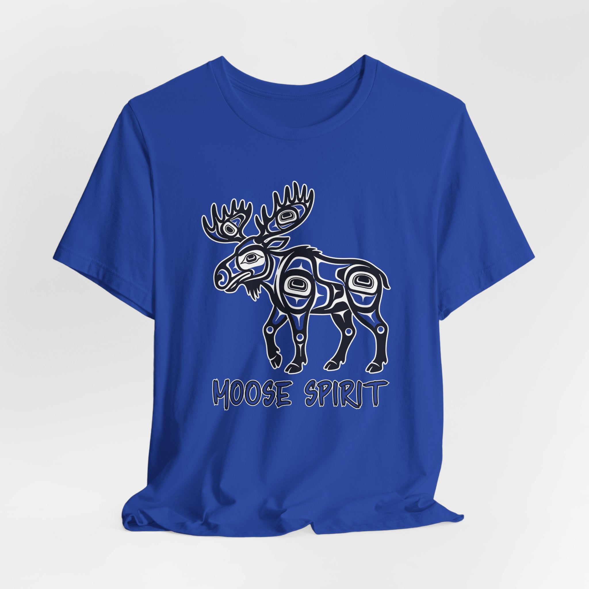 Pair this striking t-shirt with dark wash jeans, cargo pants, or even a casual skirt to let the design take center stage. Layer it under a denim jacket or flannel shirt for an added touch of rugged style. Embrace the profound cultural artistry and the powerful "Moose Spirit" with this unique and meaningful addition to your wardrobe.