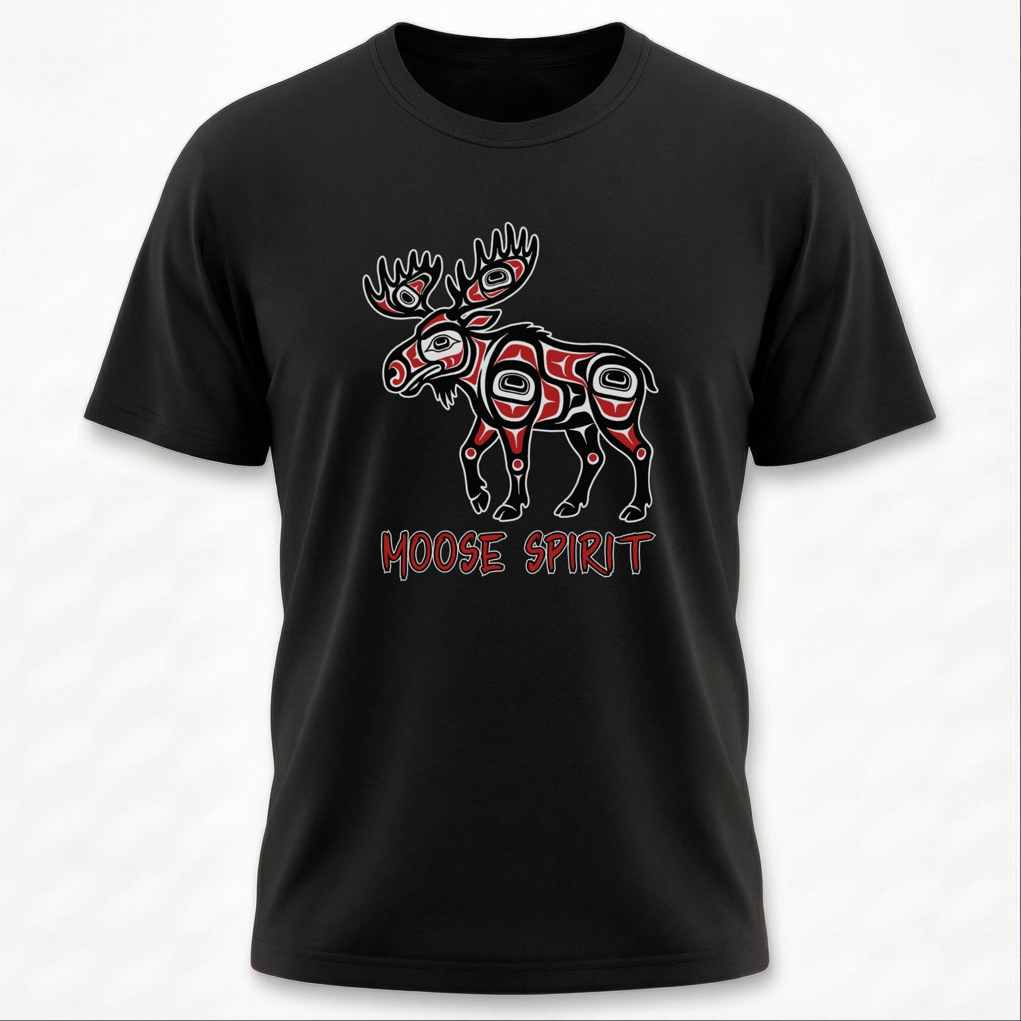 This t-shirt features a majestic moose depicted in the iconic formline art style, characterized by its intricate black outlines, vibrant red accents, and classic ovoid and U-shapes. Inspired by Indigenous art traditions, the moose symbolizes strength, wisdom, and the resilient spirit of the wilderness. The accompanying text "MOOSE SPIRIT" emphasizes a connection to these powerful attributes. This unique graphic is a powerful statement piece, perfect for those who appreciate cultural art, spiritual animal symbolism, and eye-catching designs.