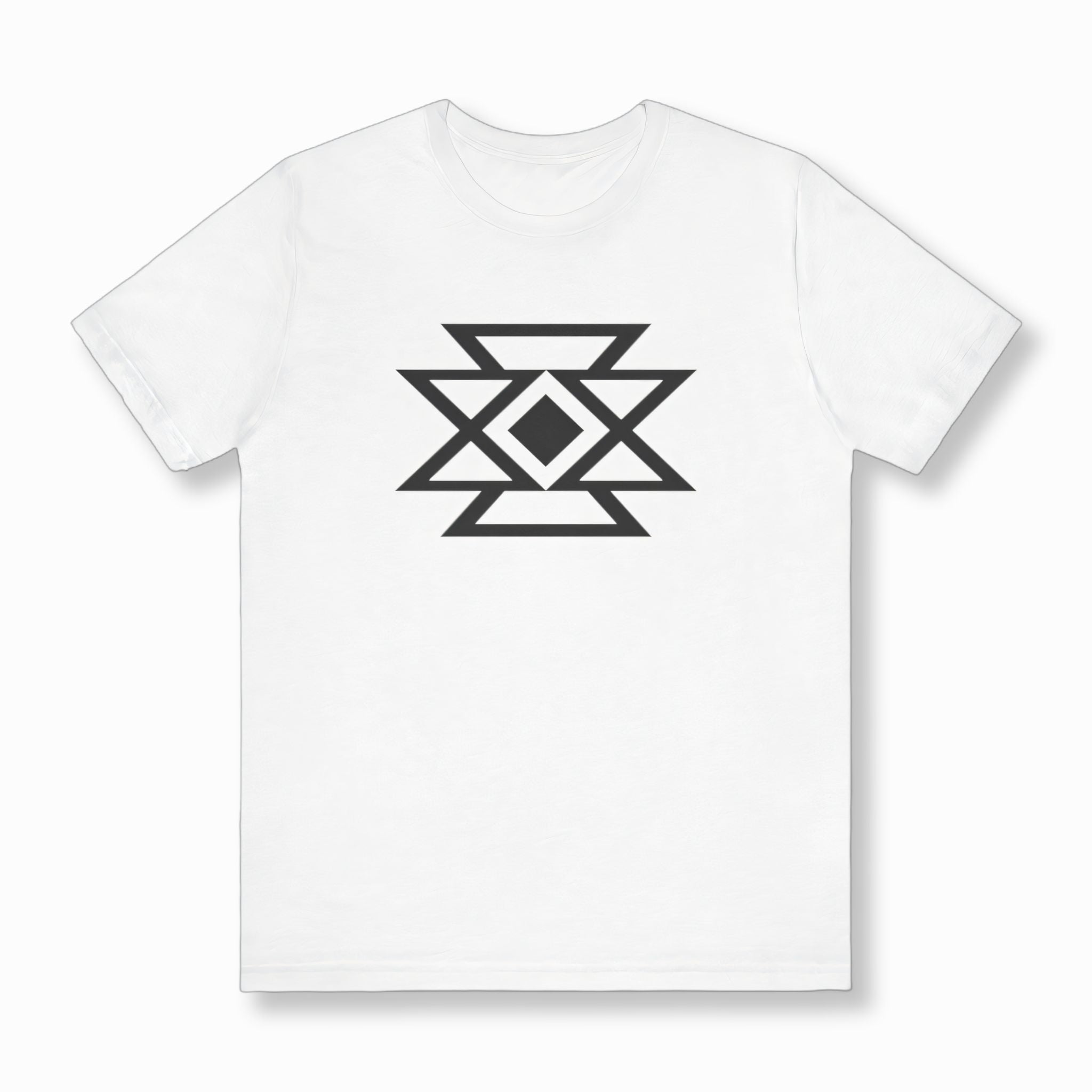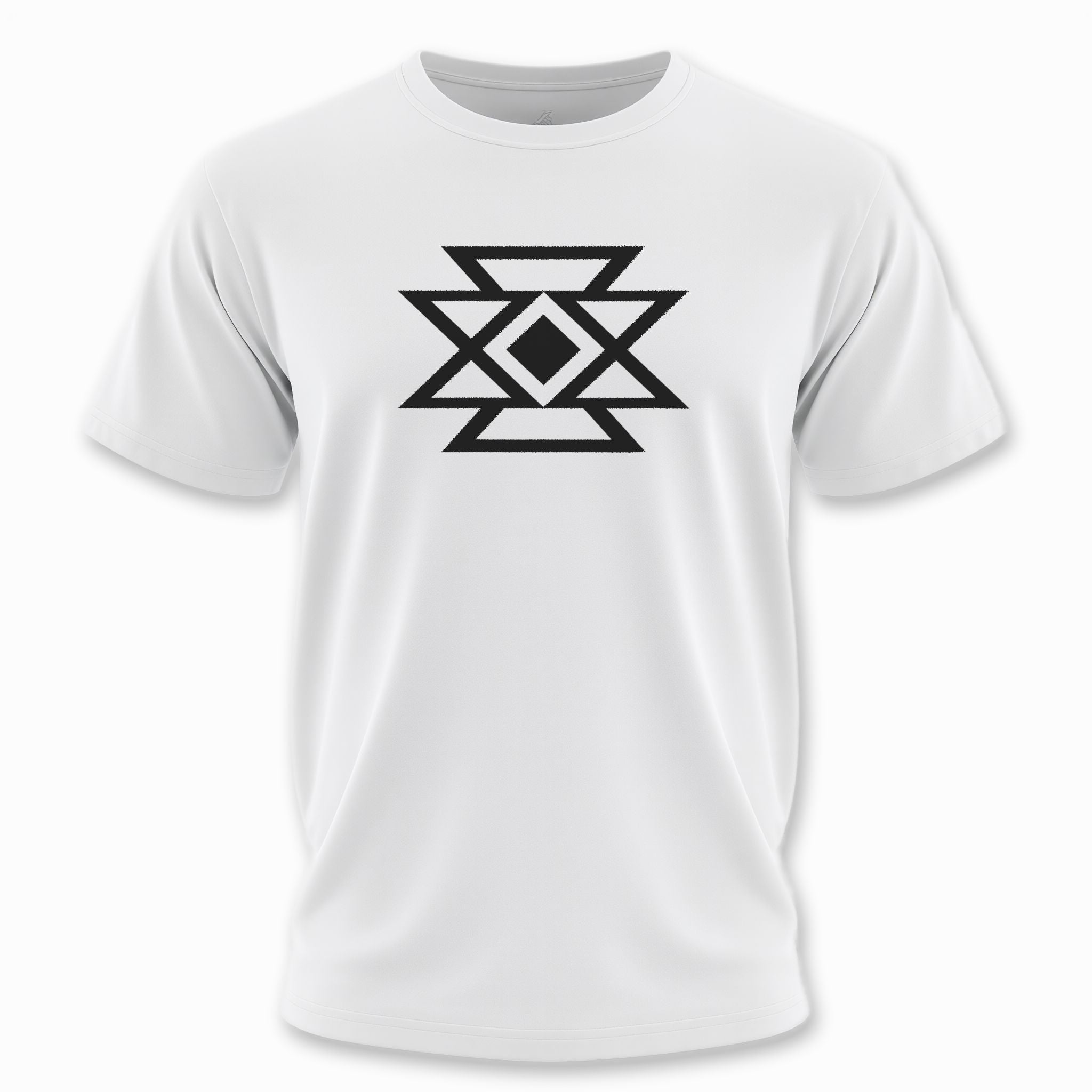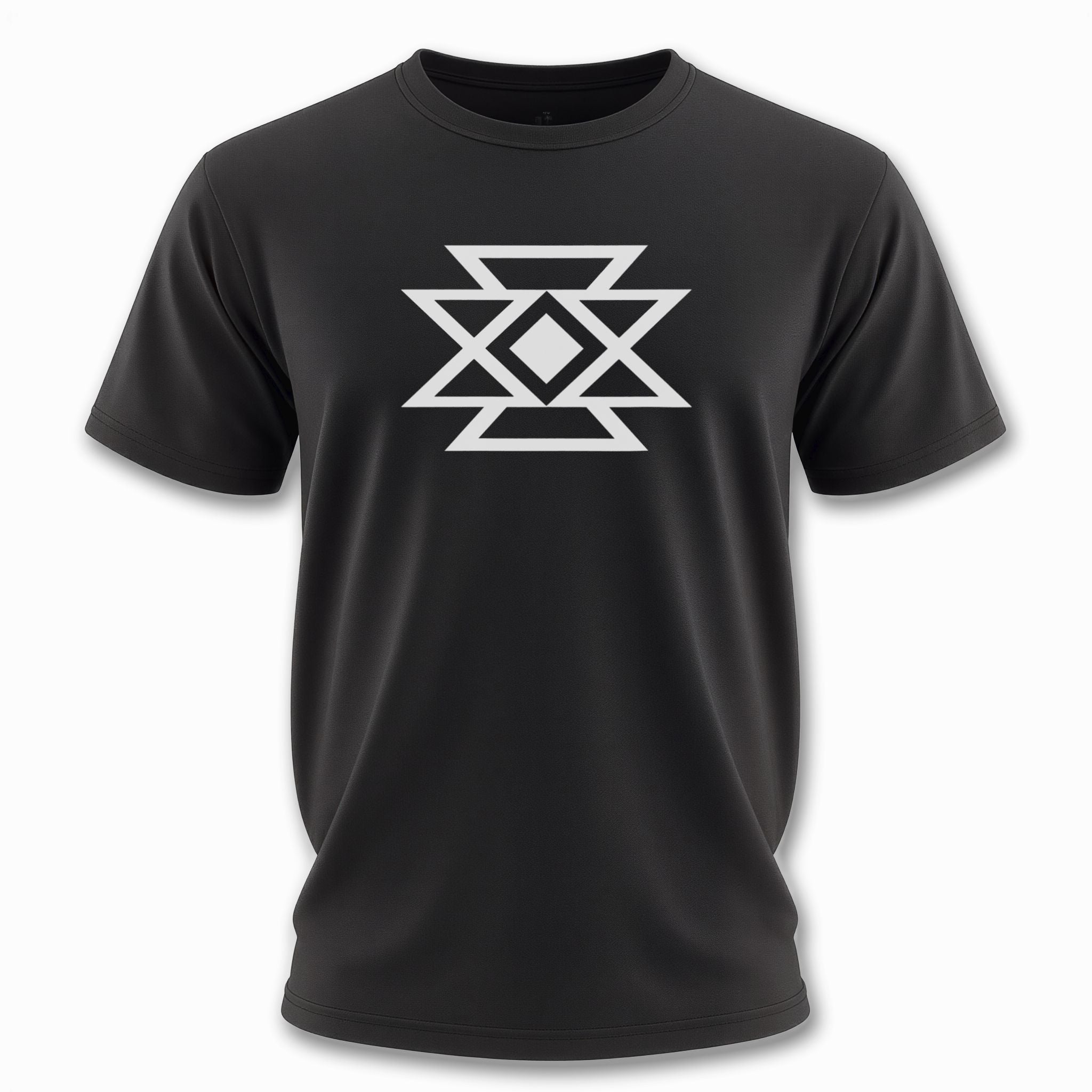 This t-shirt features a striking white geometric design on a classic black background. The intricate pattern centers around a crisp diamond shape, enveloped by bold, angular lines that form a symmetrical and abstract silhouette. Drawing inspiration from the enigmatic 'Occult Butterfly' symbol, this design embodies themes of profound transformation, spiritual evolution, and hidden wisdom. While abstract, its compelling form subtly evokes the journey of metamorphosis and the unfolding of inner truths. It's a powerful and thought-provoking graphic, perfect for those who appreciate unique artistic symbolism and the allure of esoteric meaning, making a profound statement with its clean lines and compelling narrative.