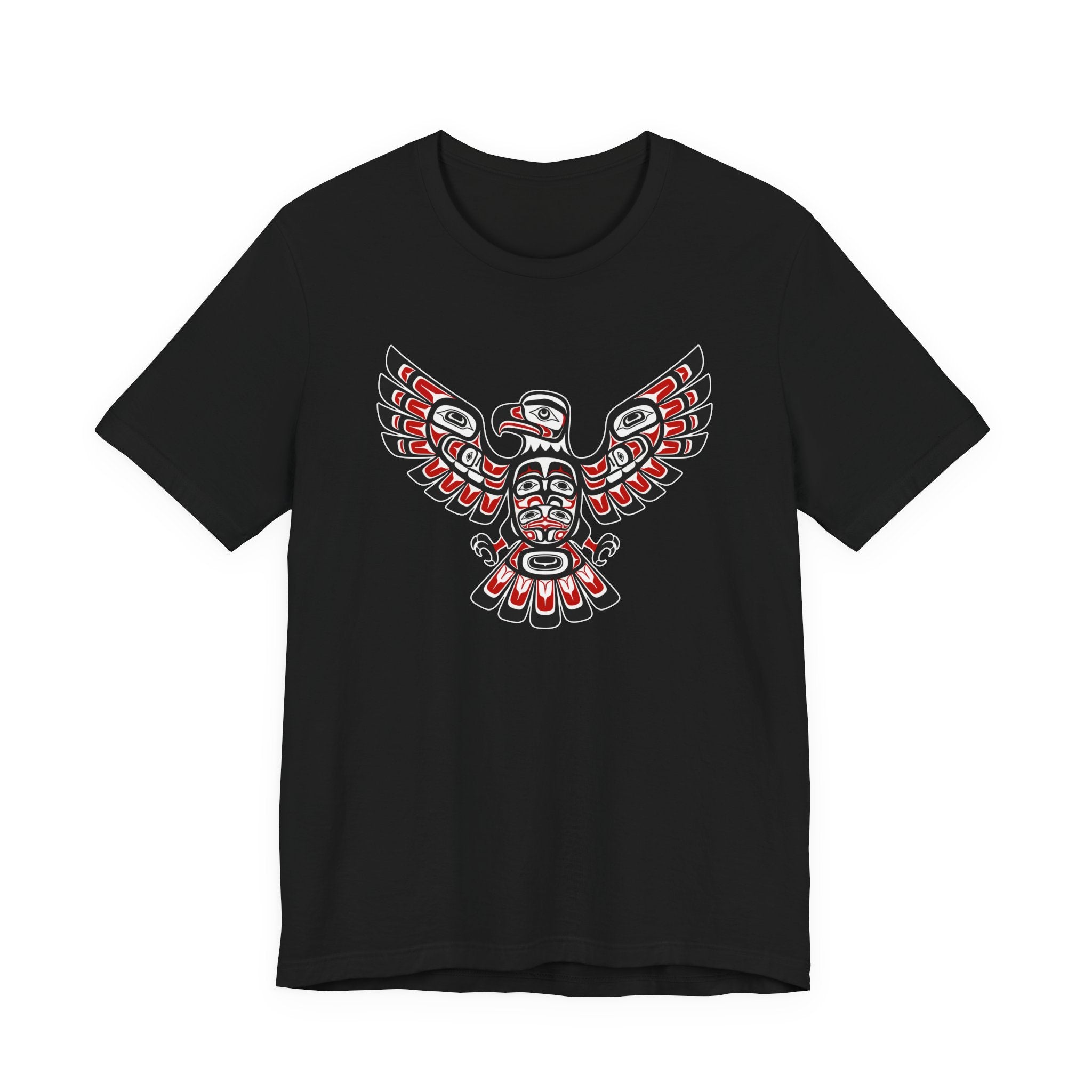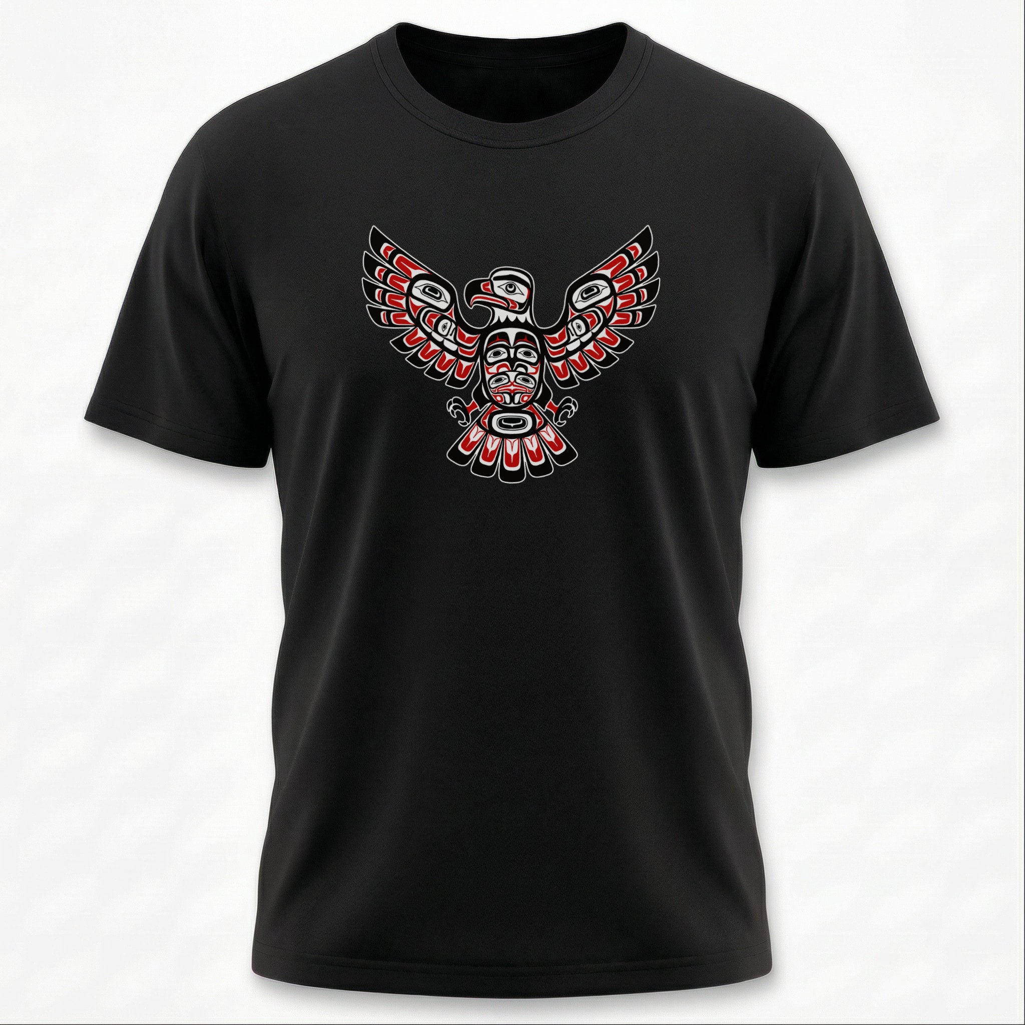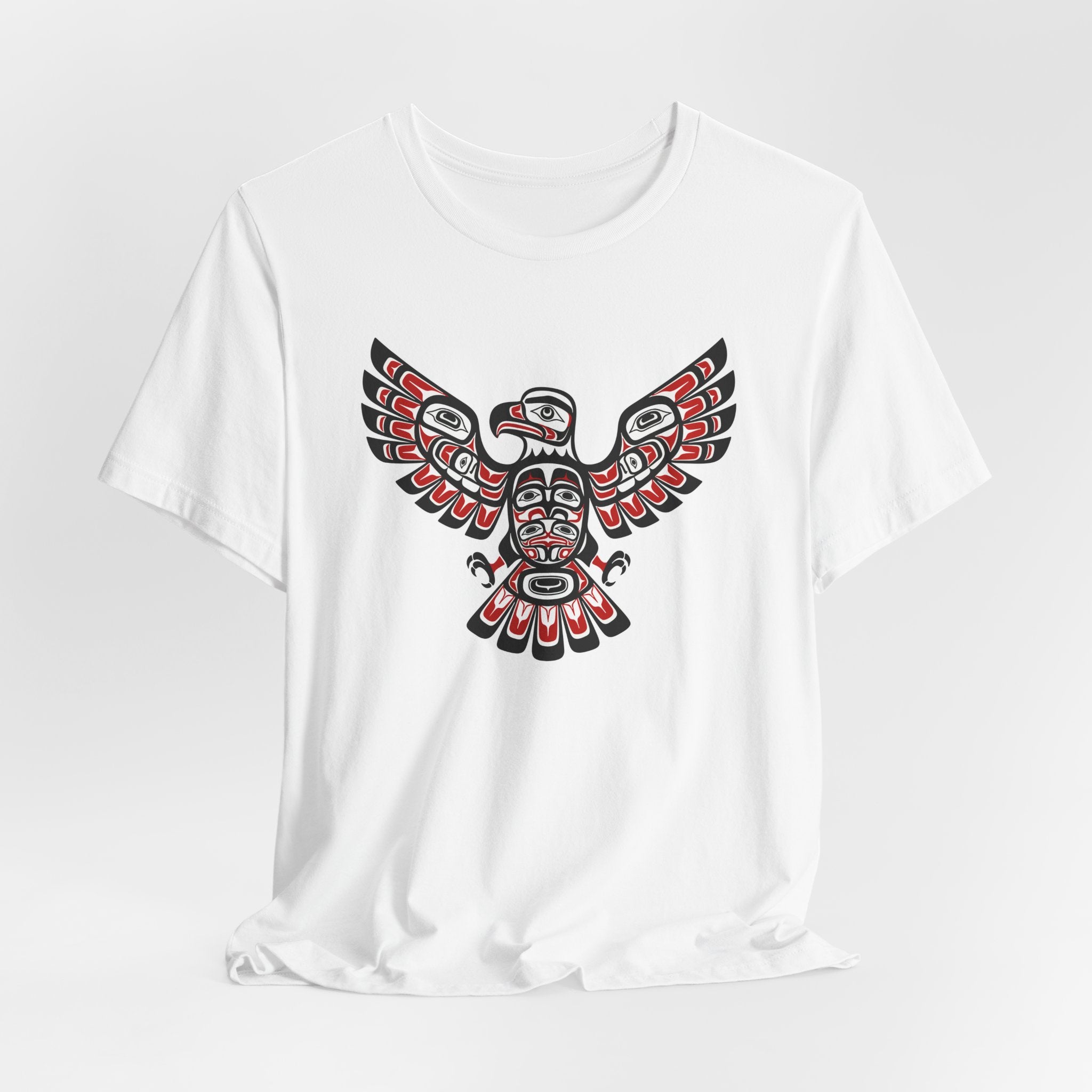 This t-shirt showcases a majestic eagle design rendered in the distinctive style of Northwest Coast Indigenous art. Known for its rich cultural heritage, Northwest Coast formline art uses characteristic ovoids, U-forms, and S-forms to create powerful and intricate figures. The eagle, a revered crest figure in many Indigenous cultures, symbolizes power, prestige, wisdom, and friendship. The striking red, black, and white palette, combined with the intricate details, makes this design a bold and eye-catching statement piece, perfect for those who appreciate unique cultural artwork.