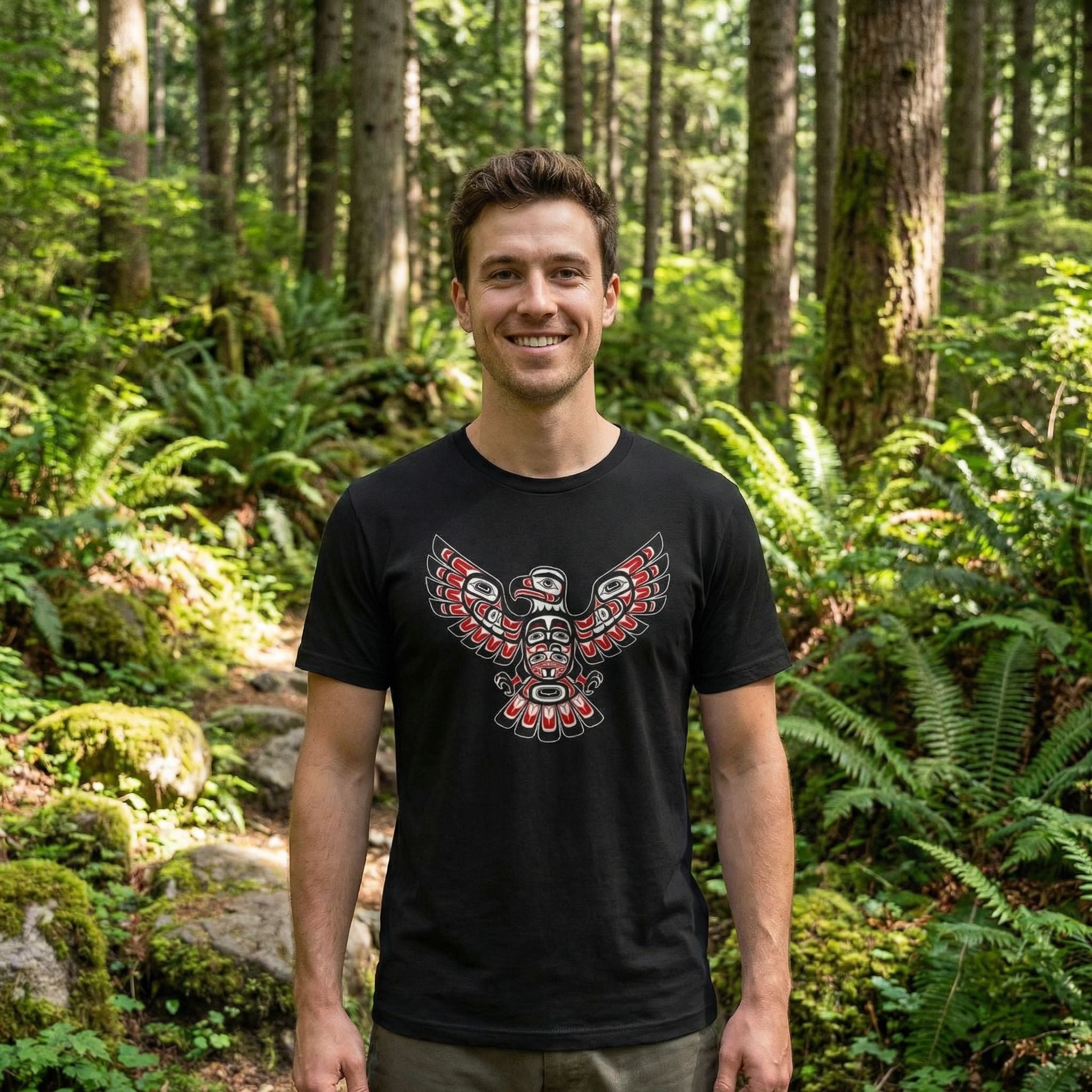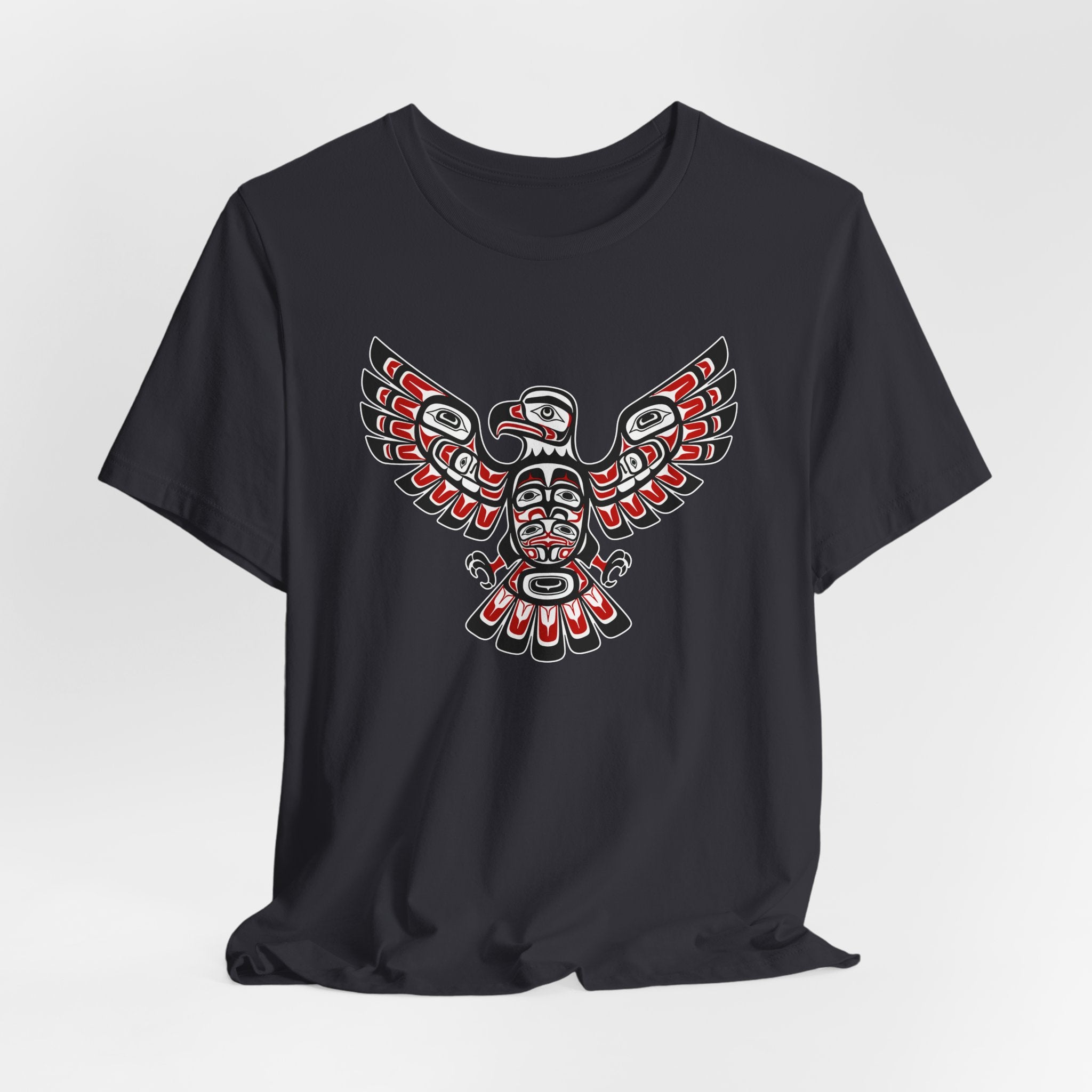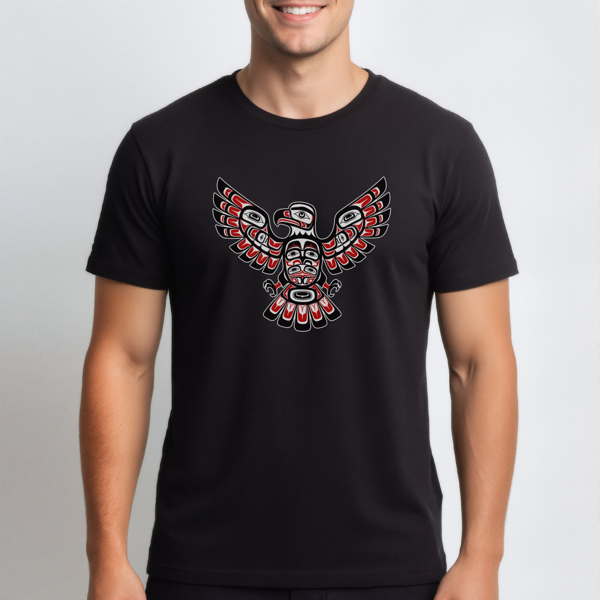 This t-shirt showcases a majestic eagle design rendered in the distinctive style of Northwest Coast Indigenous art. Known for its rich cultural heritage, Northwest Coast formline art uses characteristic ovoids, U-forms, and S-forms to create powerful and intricate figures. The eagle, a revered crest figure in many Indigenous cultures, symbolizes power, prestige, wisdom, and friendship. The striking red, black, and white palette, combined with the intricate details, makes this design a bold and eye-catching statement piece, perfect for those who appreciate unique cultural artwork.
