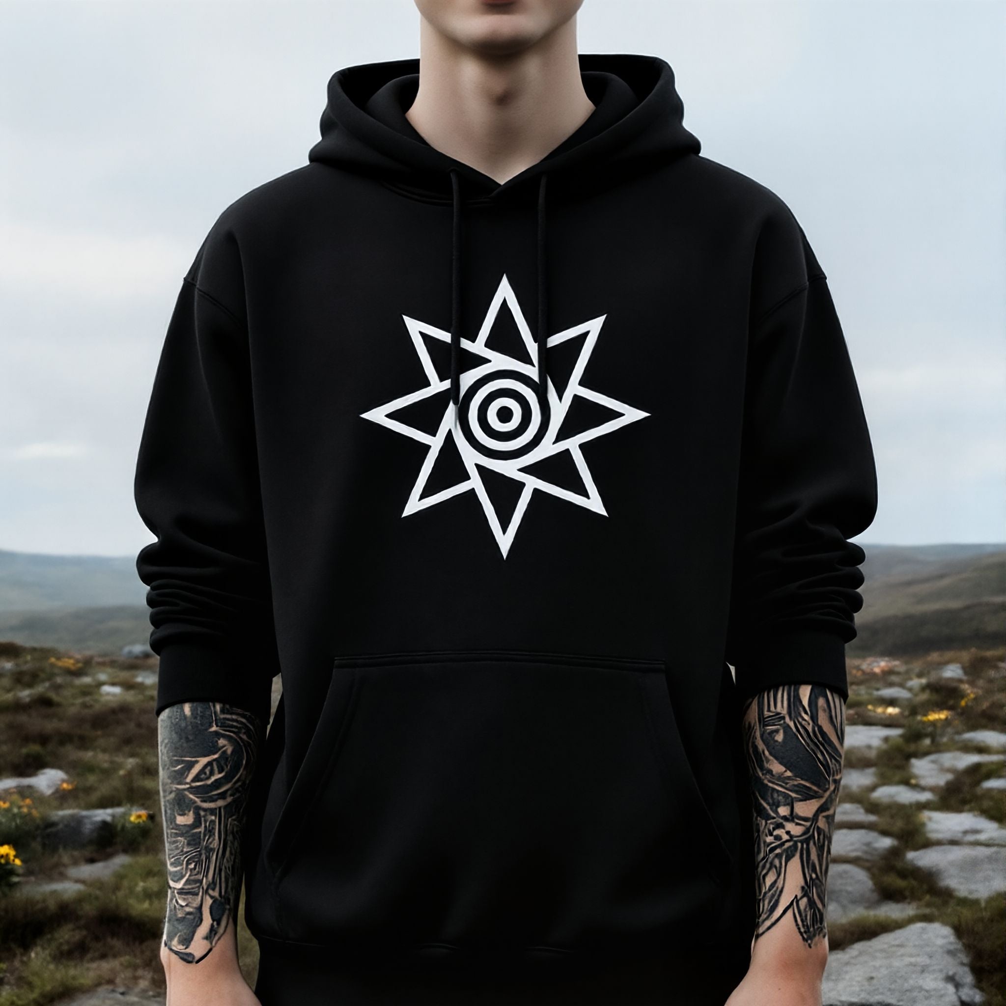 This hoodie features a striking white graphic of a stylized eight-pointed sun or star symbol, prominently displayed against the dark fabric. Drawing inspiration from Native American symbolism, this "Sunstar" design embodies themes of life, energy, warmth, and divine guidance. The central concentric circles often represent cosmic energy, the eye of the spirit, or the cycles of existence, offering a deeper connection to nature and self. Its intricate geometric pattern is both bold and meaningful, making it a powerful statement piece that connects the wearer to ancient wisdom and natural forces.