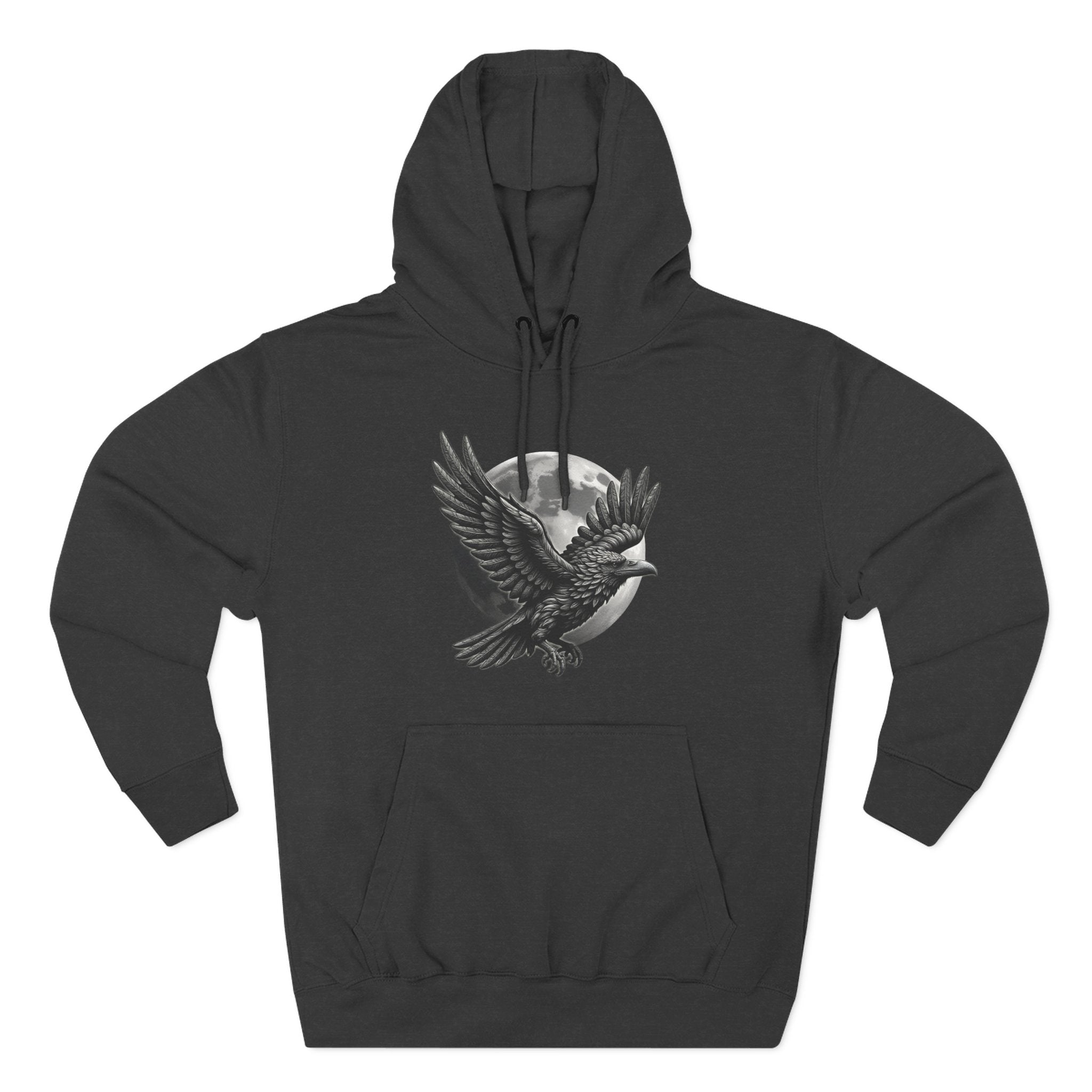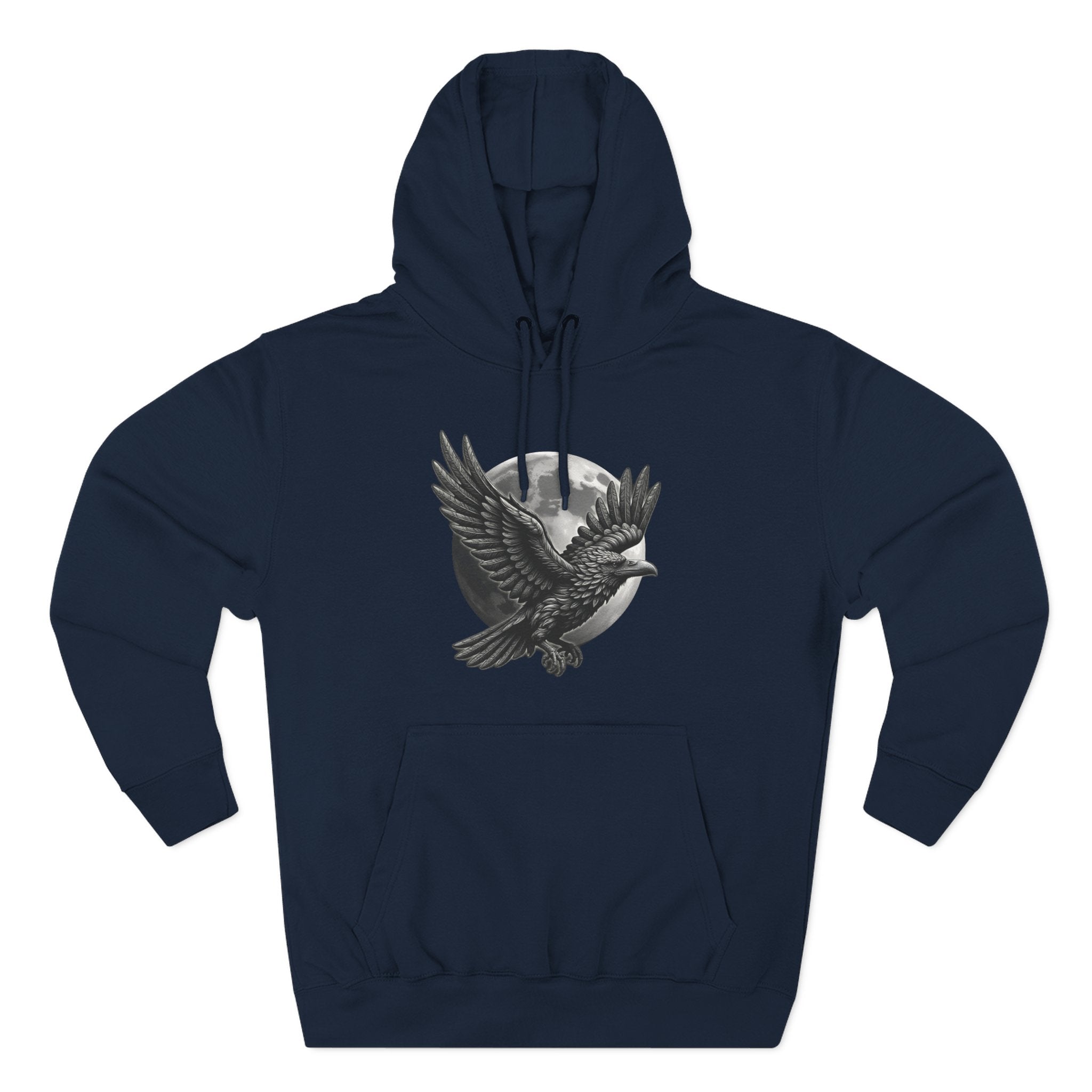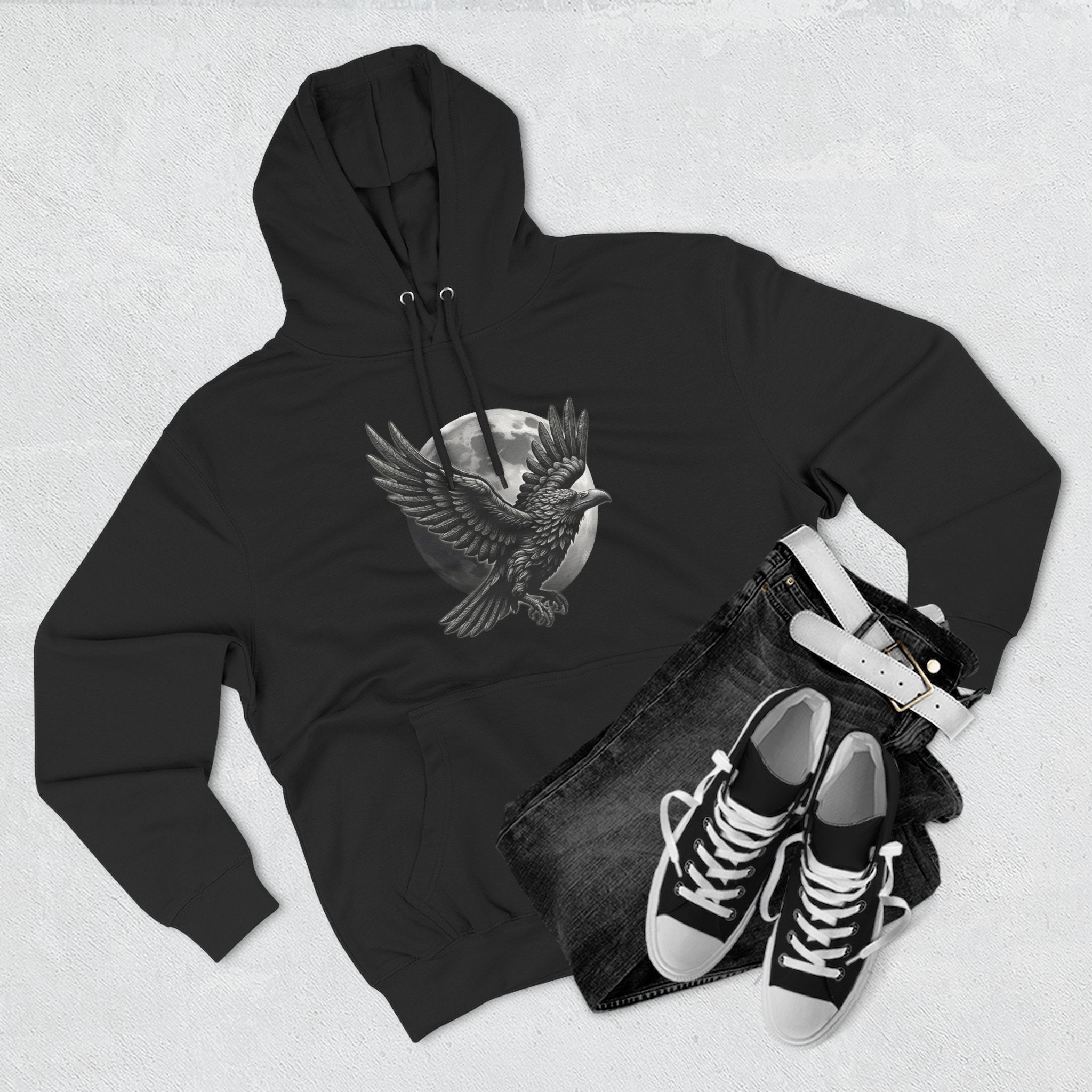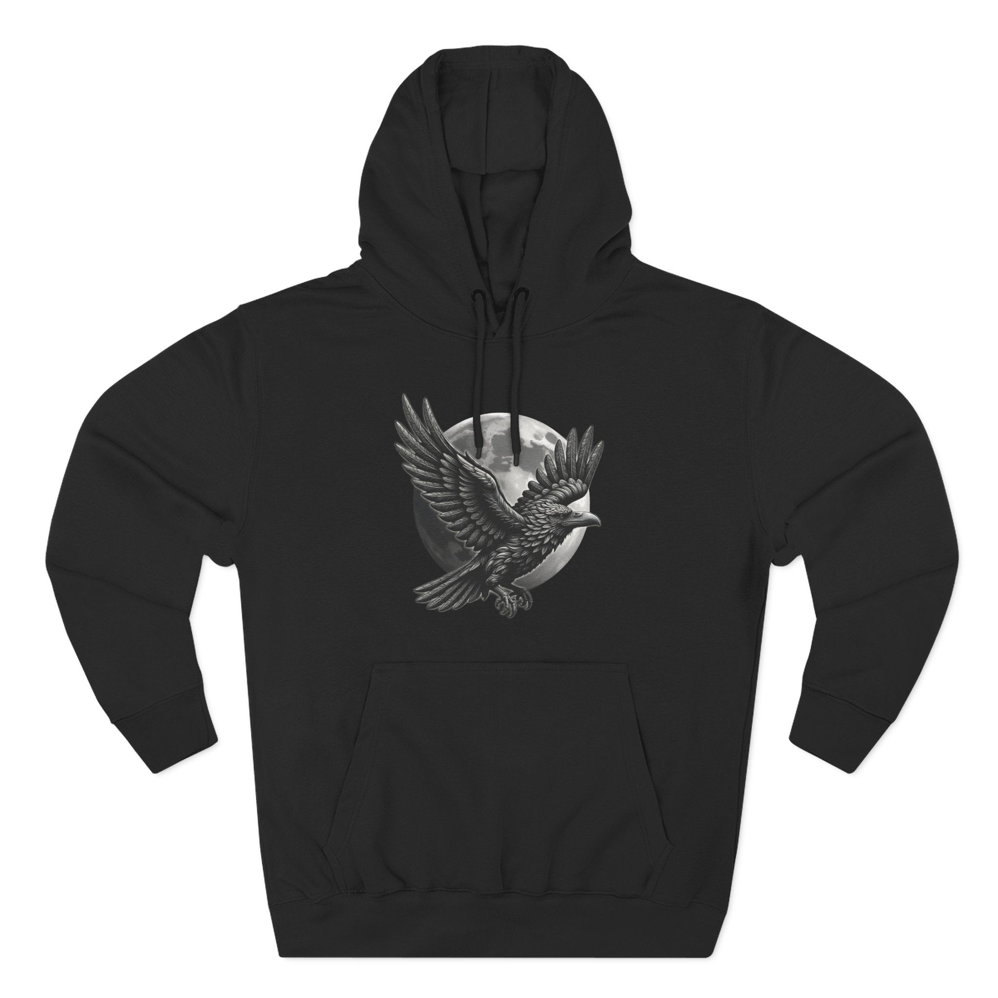 This striking hoodie features a majestic eagle with wings spread wide, soaring against the backdrop of a luminous full moon. Rendered in a captivating grayscale, the intricate details highlight the bird's powerful presence. The eagle, a universal symbol of strength, freedom, and clear vision, is beautifully contrasted with the mysterious and guiding full moon, representing intuition, cycles, and illumination. Together, they evoke a sense of majestic power, spiritual guidance, and unwavering spirit. This unique graphic is perfect for those who are drawn to the wild spirit of nature and celestial wonder. It’s a powerful and eye-catching design, making it a standout piece for any wardrobe.