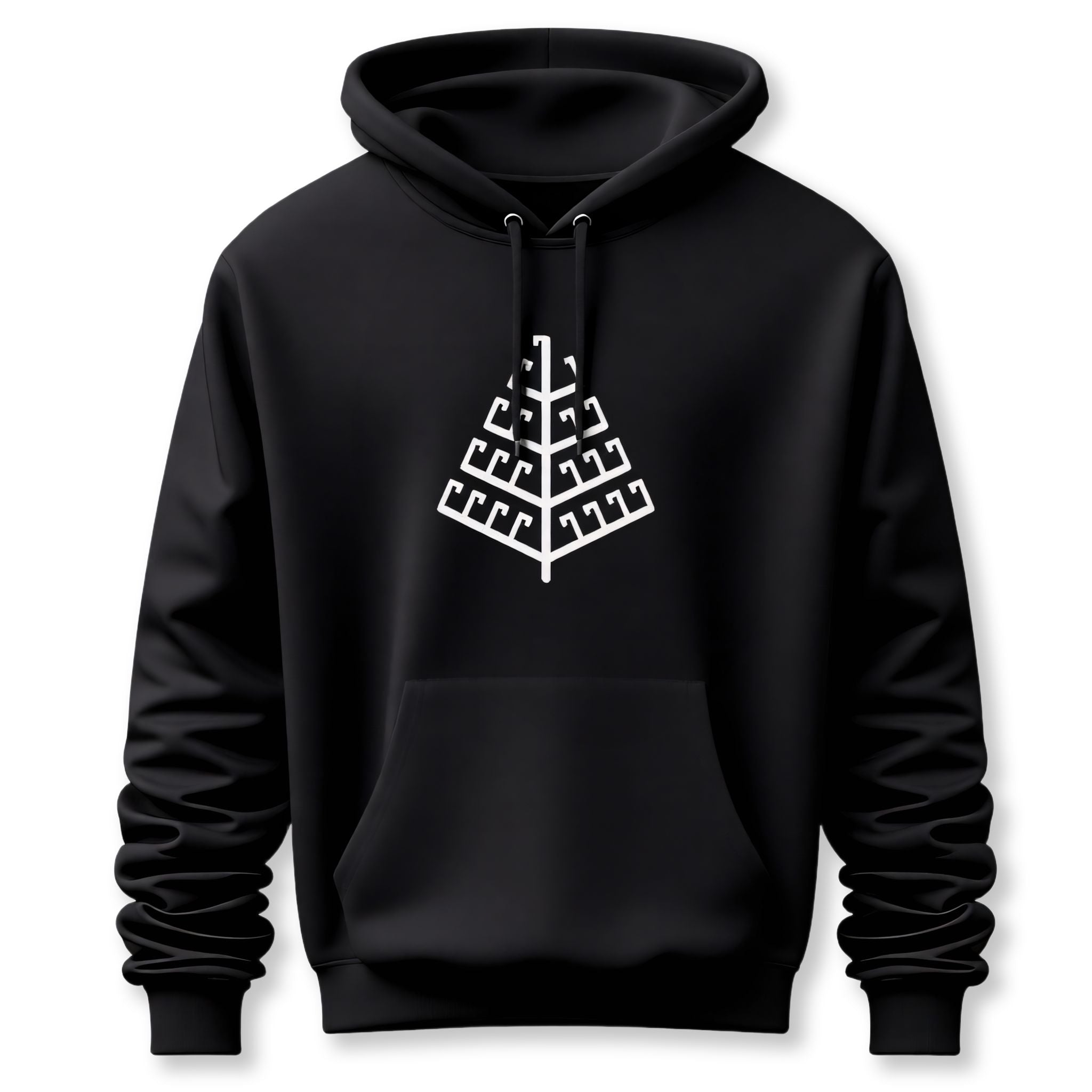 This hoodie features a striking white, geometric representation of the Yggdrasil World Tree, presented with clean lines and a modern, minimalist aesthetic. In Norse mythology, Yggdrasil is the sacred World Tree, connecting the nine realms and symbolizing the interconnectedness of all life, growth, wisdom, and the cycle of existence. This unique graphic transforms the ancient symbol into a contemporary art piece, perfect for those who appreciate both deep spiritual meaning and modern design. The design is subtly powerful and eye-catching, making it a conversation starter and a standout piece for any wardrobe.