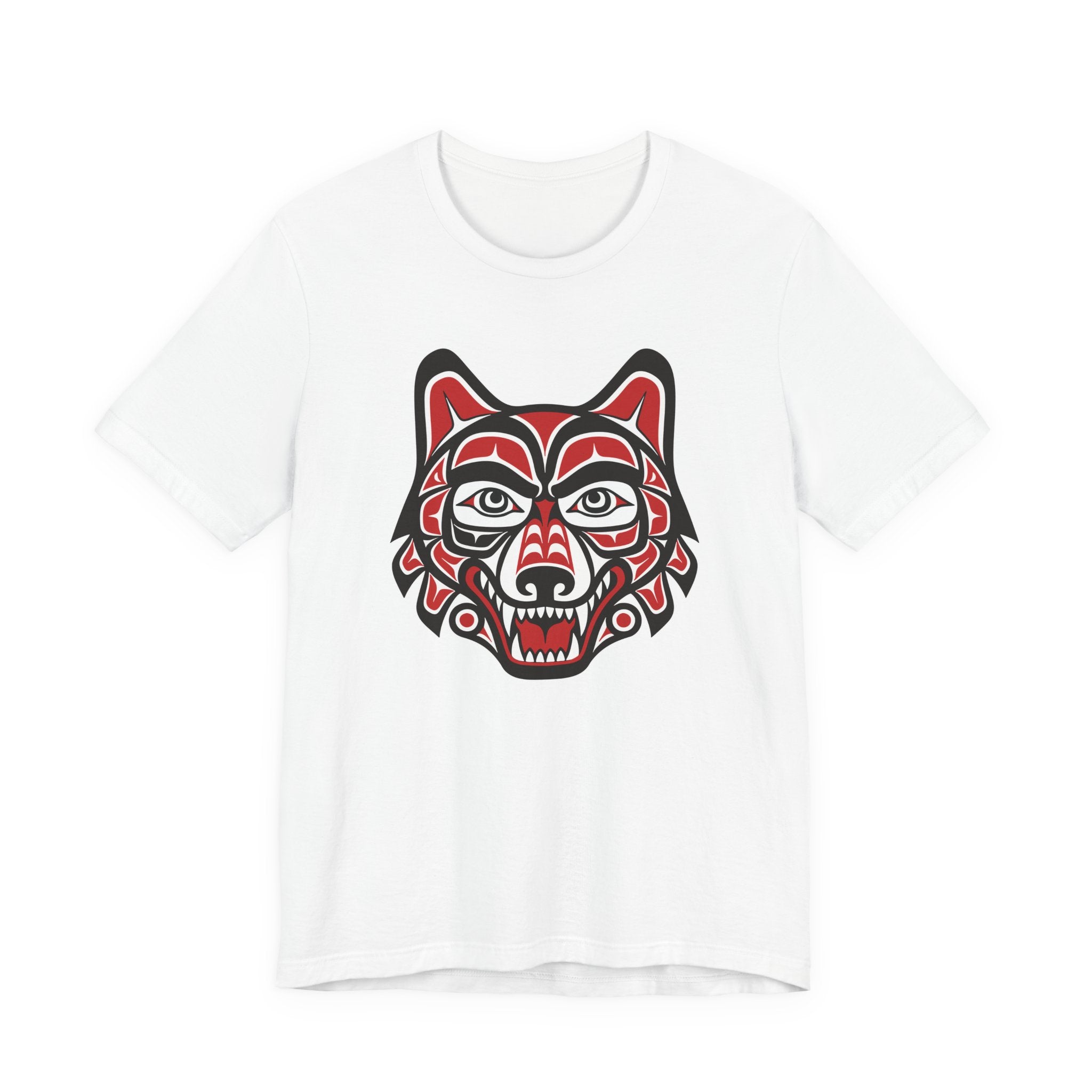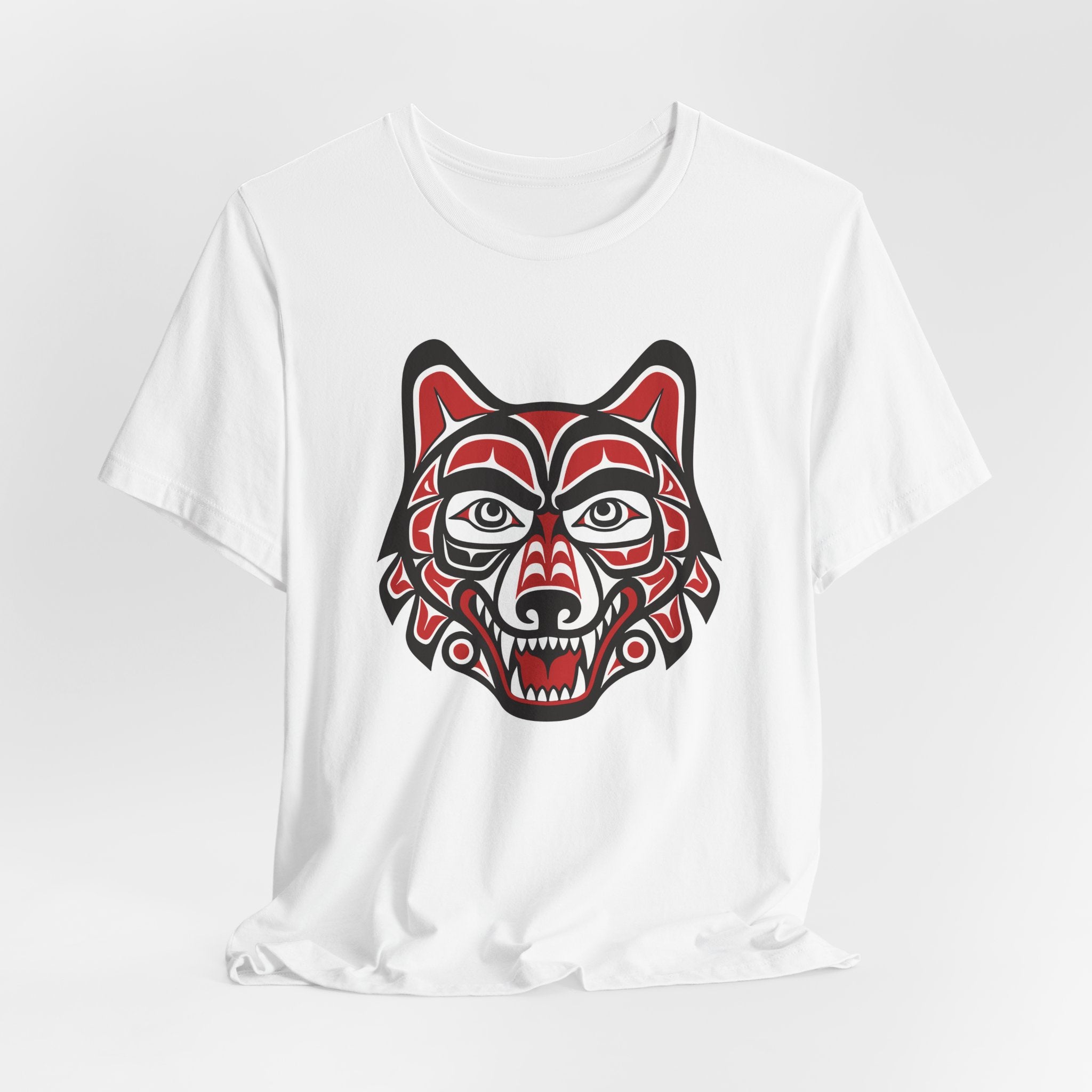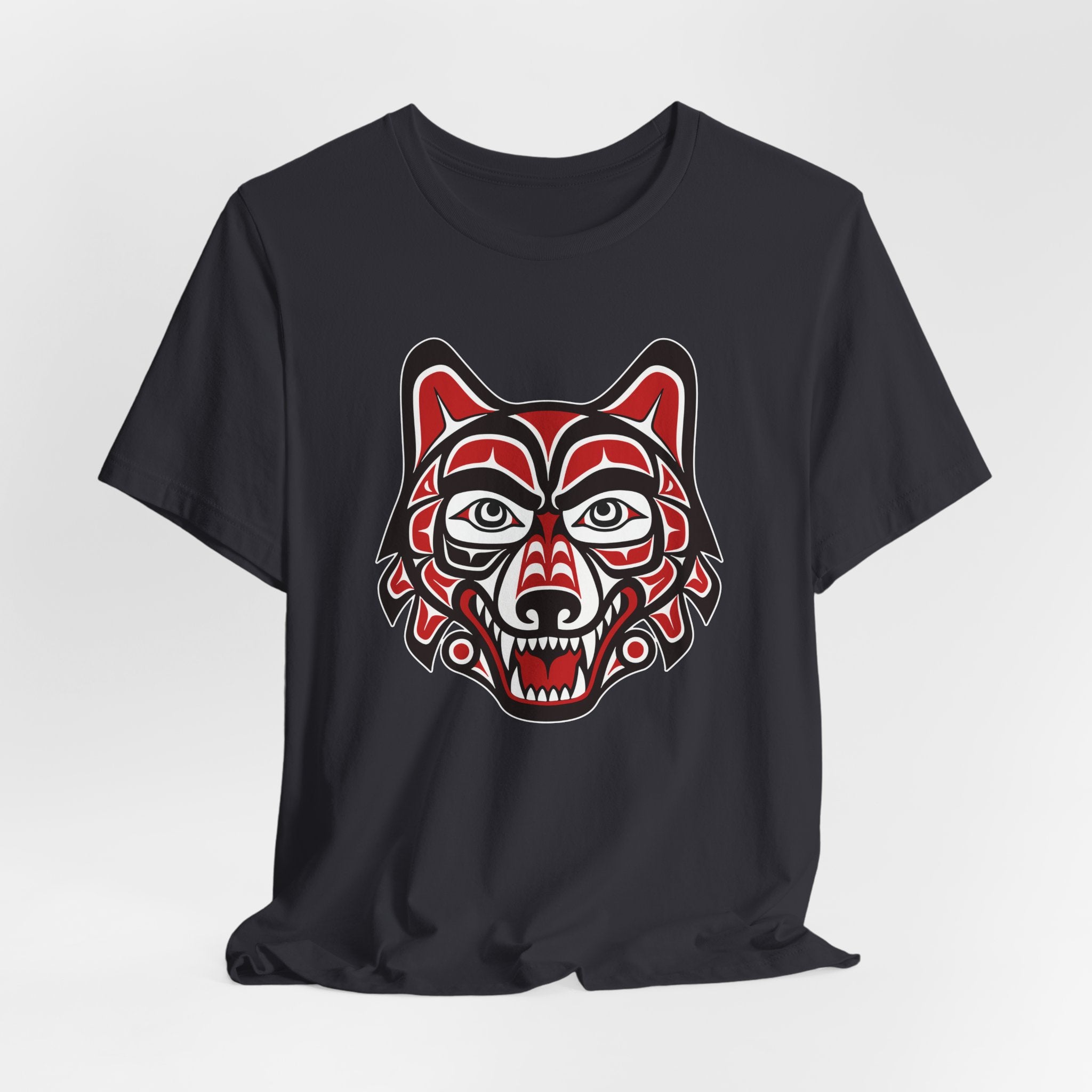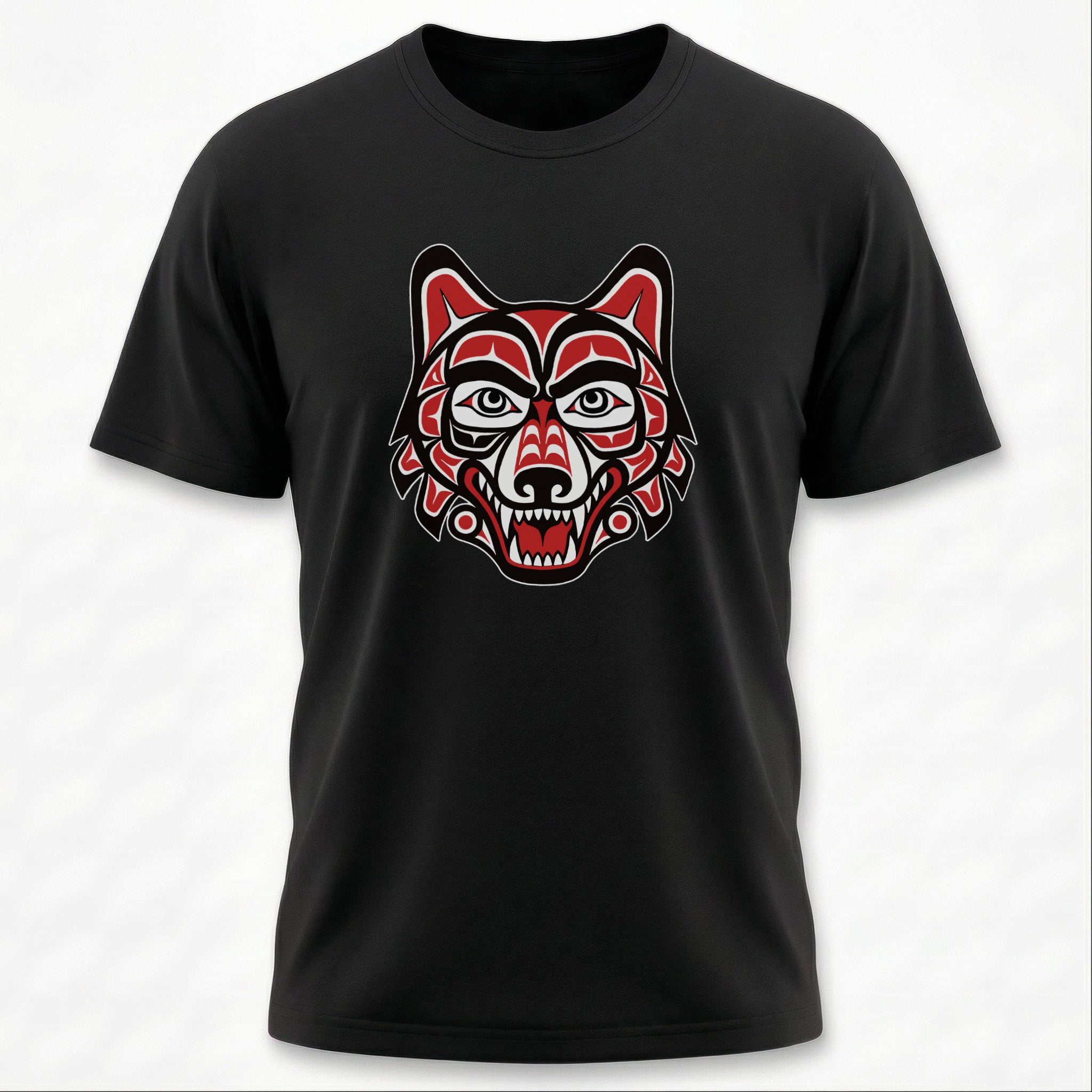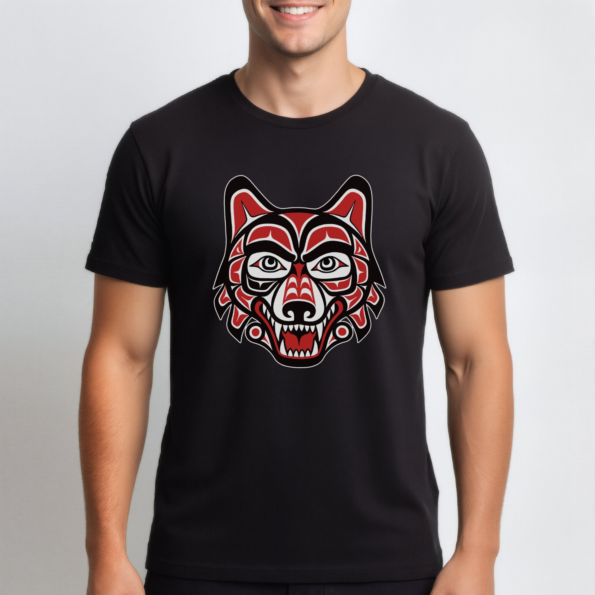 This t-shirt features a striking wolf head graphic rendered in the iconic Pacific Northwest Native American art style. Known for its powerful symbolism, the wolf often represents loyalty, intuition, teaching, and strength in many indigenous cultures. The intricate formline design, characterized by its bold black outlines, flowing red shapes, and clever use of white negative space, celebrates this rich artistic tradition and the enduring spirit of the wolf. This unique graphic is a testament to cultural artistry and powerful animal symbolism, making it a bold and eye-catching statement piece for any wardrobe.