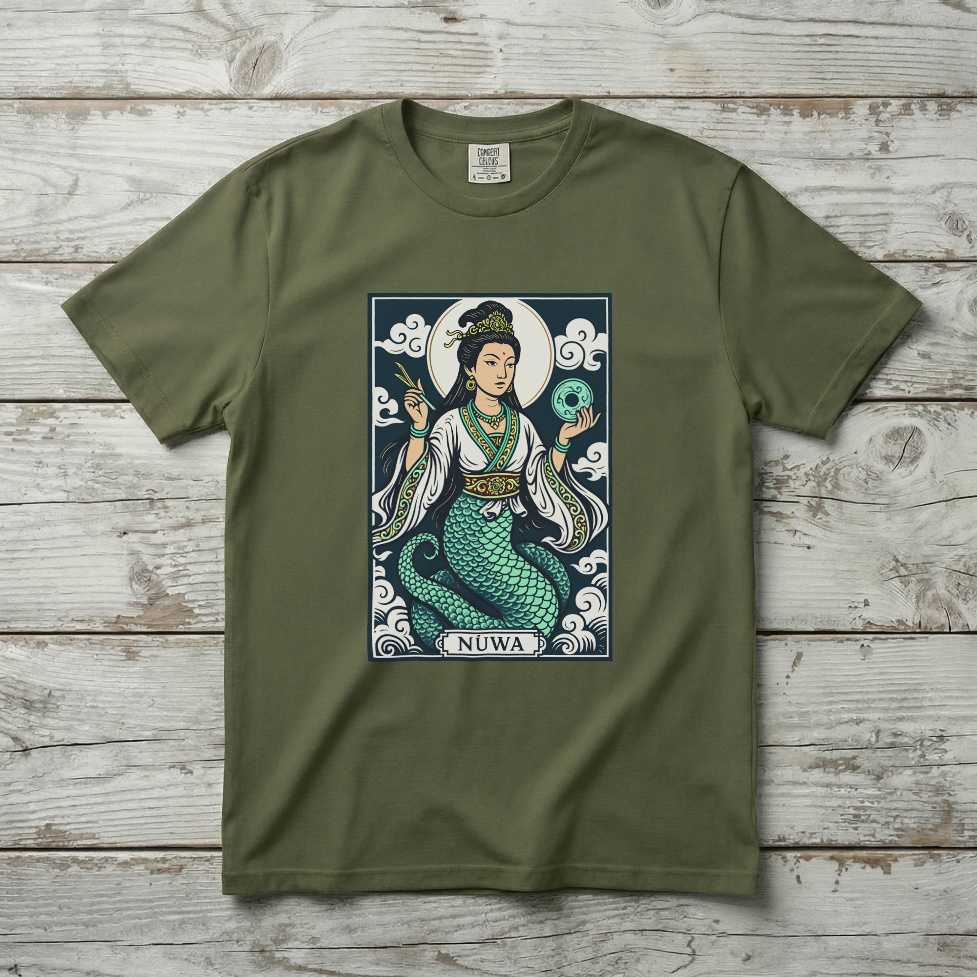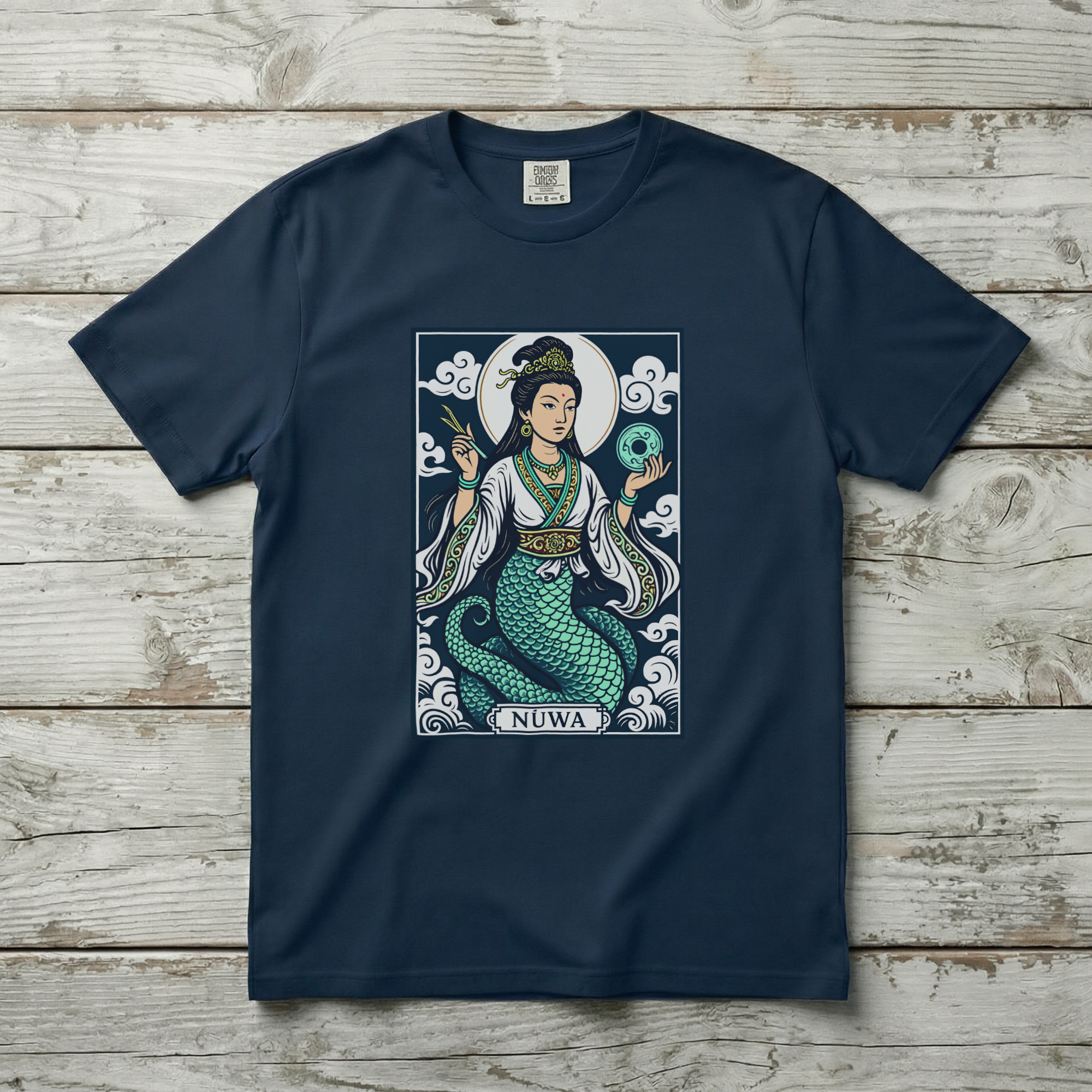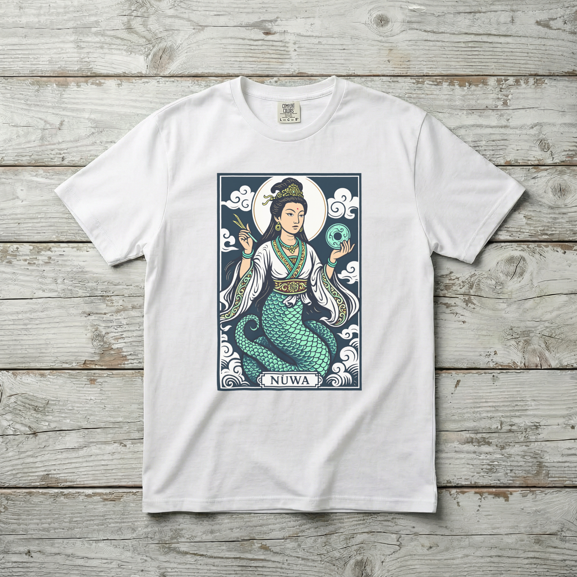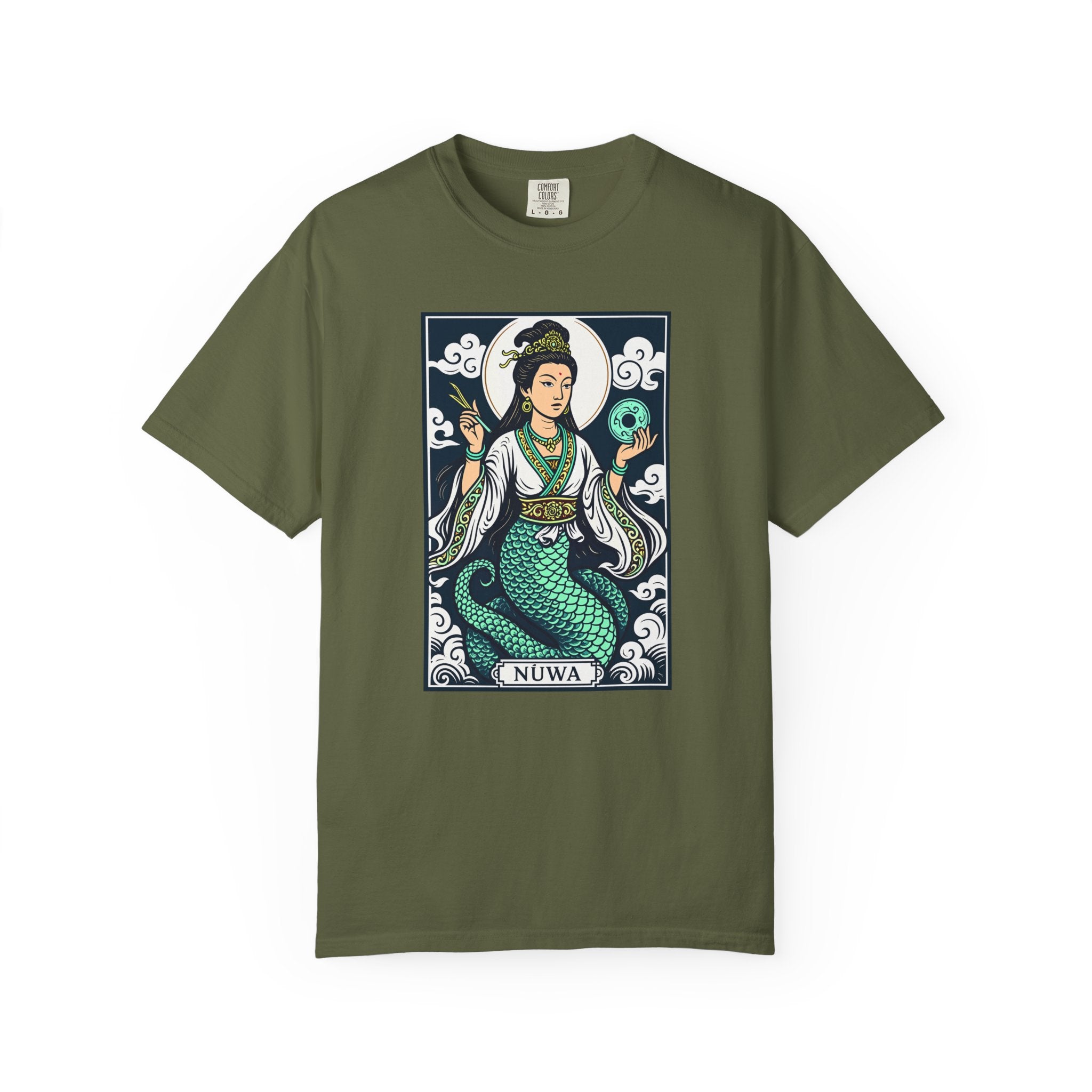 This t-shirt features a striking graphic of Nüwa, the revered Chinese mother goddess, depicted with her iconic human upper body and flowing serpent tail. Adorned with intricate jewelry and holding symbolic artifacts against a backdrop of swirling clouds, she embodies creation, resilience, and divine wisdom. Nüwa is celebrated in mythology for shaping humanity and repairing the heavens, making this design a powerful tribute to ancient lore. The detailed artwork and vibrant colors make this design both culturally rich and visually captivating, perfect for those who appreciate mythology and profound symbolism.