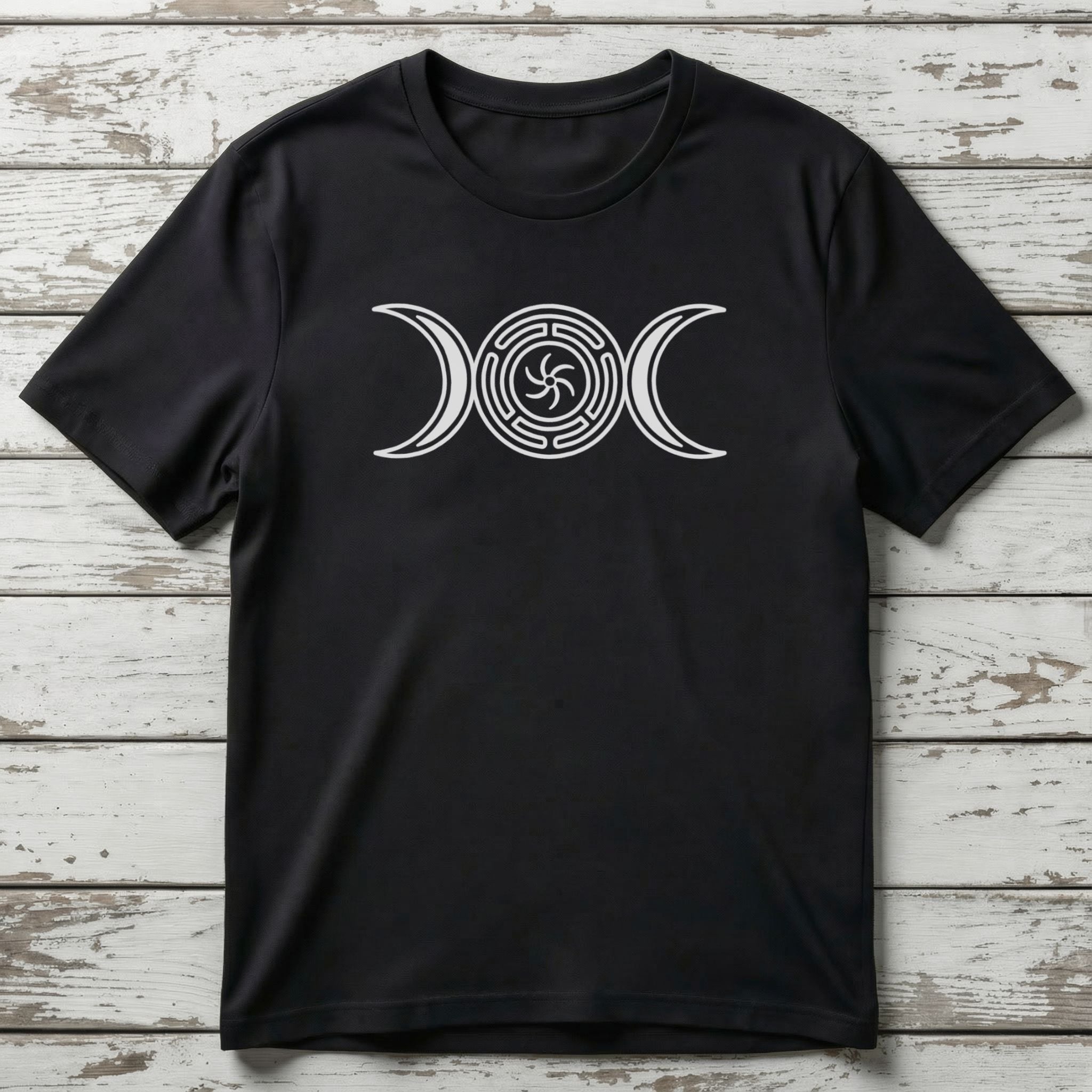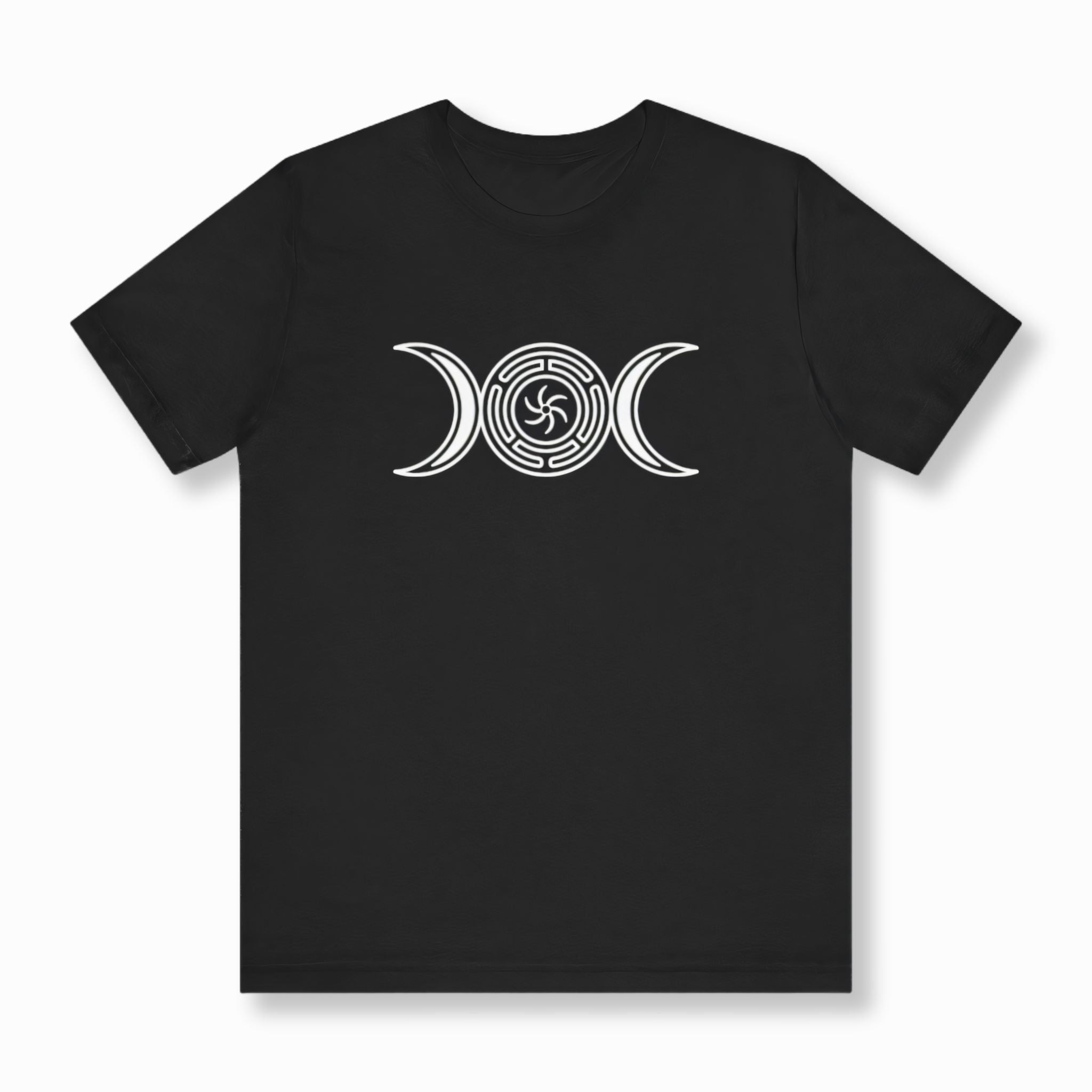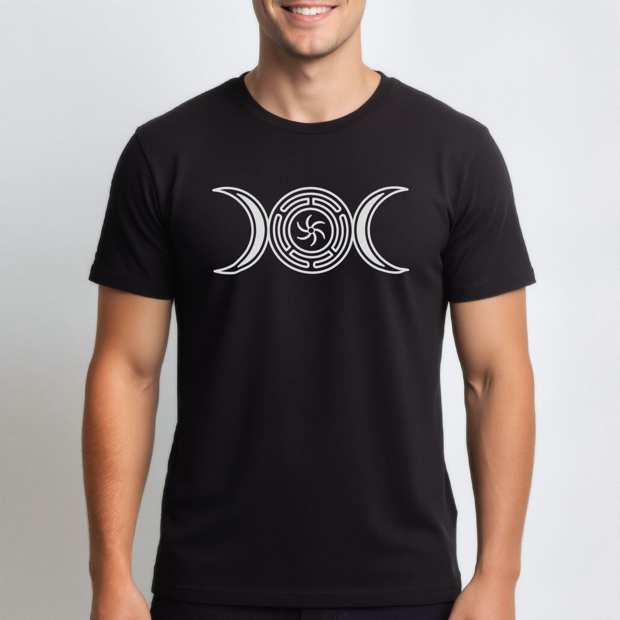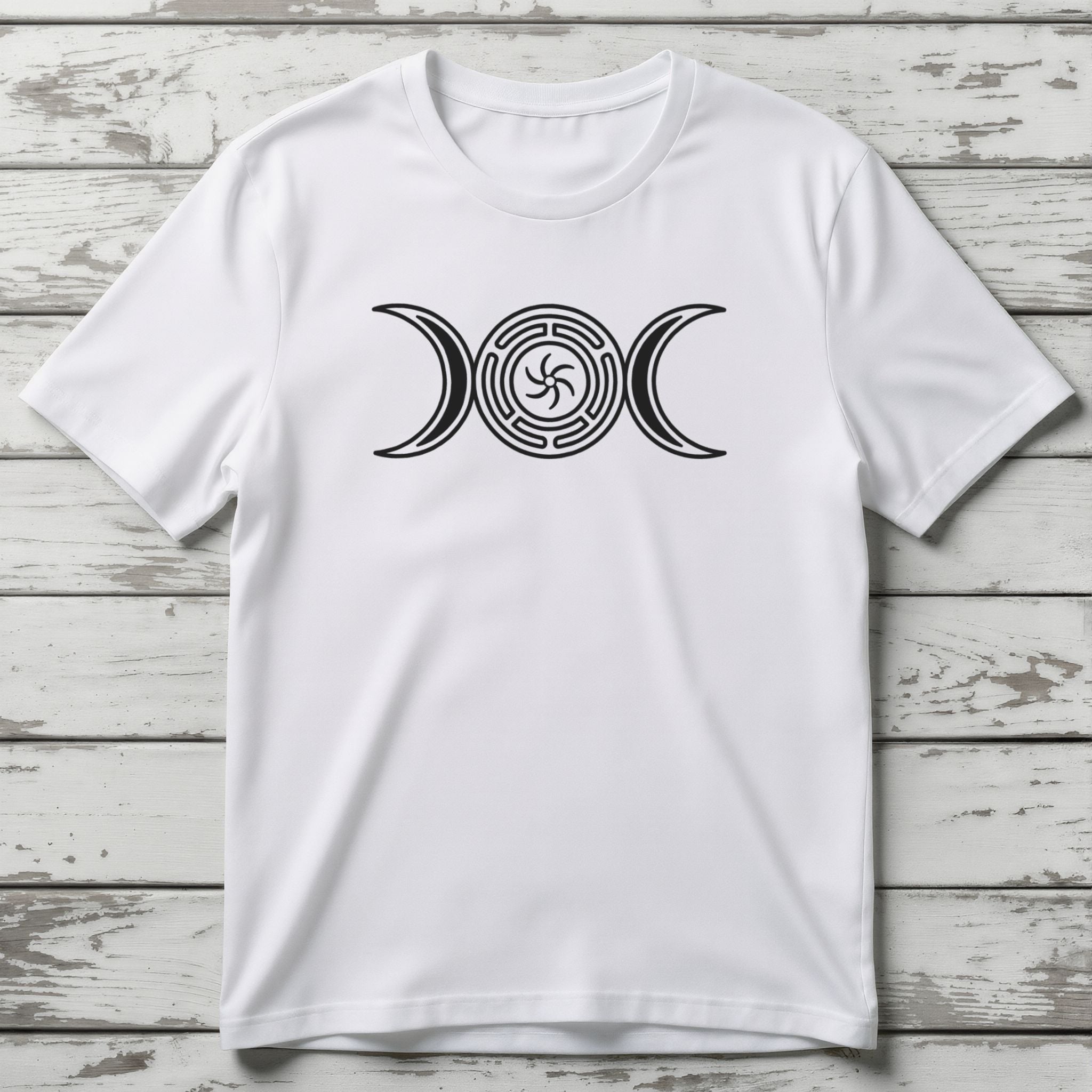 This t-shirt features a striking white graphic of the ancient Hekate's Wheel (Strophalos) symbol, elegantly framed by the powerful Triple Moon crescents. The Hekate's Wheel, a labyrinthine symbol sacred to the goddess Hekate, represents transformation, spiritual journey, and divine wisdom. The accompanying Triple Moon symbol signifies the Maiden, Mother, and Crone aspects of the divine feminine, along with the cyclical phases of the moon. Together, these symbols evoke themes of powerful magic, intuition, crossroads, and ancient mysteries. This unique design is perfect for those who connect with pagan spirituality, witchcraft, or profound mythological symbolism. It's an intricate and impactful statement piece that stands out in any wardrobe.