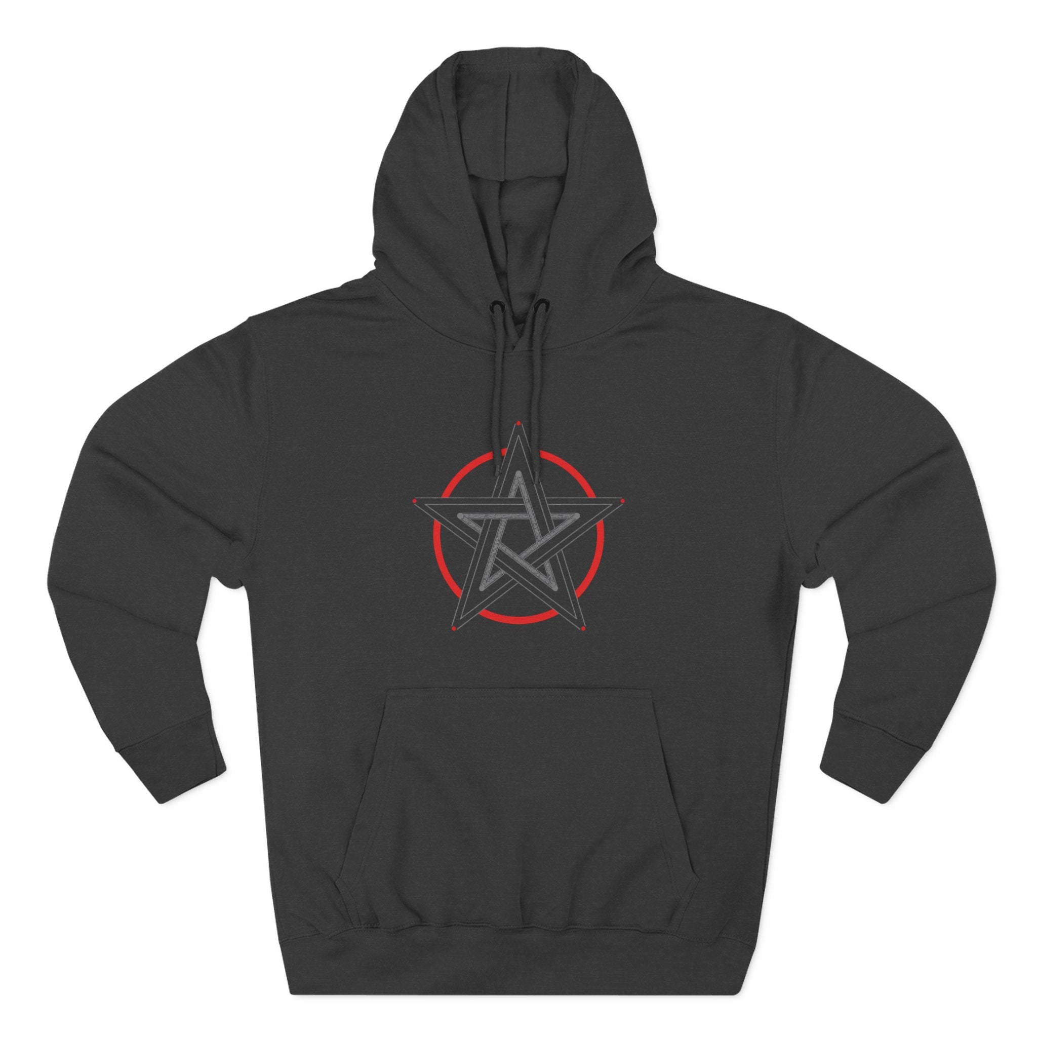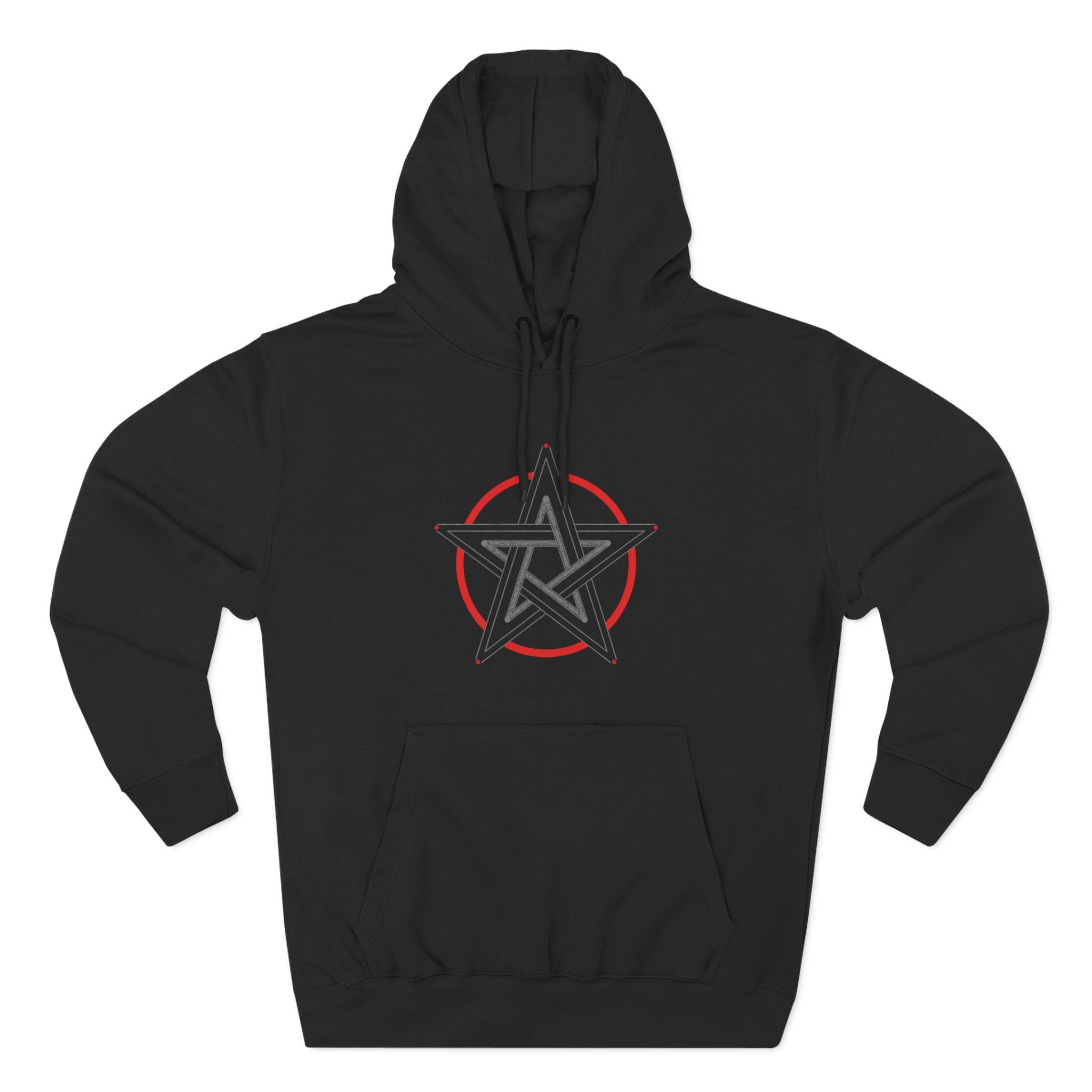 This hoodie features a striking grey pentagram symbol, elegantly enclosed within a vibrant red circle. The pentagram, particularly when encircled (often known as a pentacle), is a powerful and ancient symbol across various esoteric traditions. It represents the five elements – Earth, Air, Fire, Water, and Spirit – unified and balanced, and is widely regarded as a symbol of protection, spiritual enlightenment, and the harmony of the universe. The bold red circle further amplifies its protective qualities and energetic presence. This design is both mystical and compelling, making a subtle yet profound statement for those who connect with ancient wisdom, spiritual protection, or simply appreciate unique esoteric artistry.