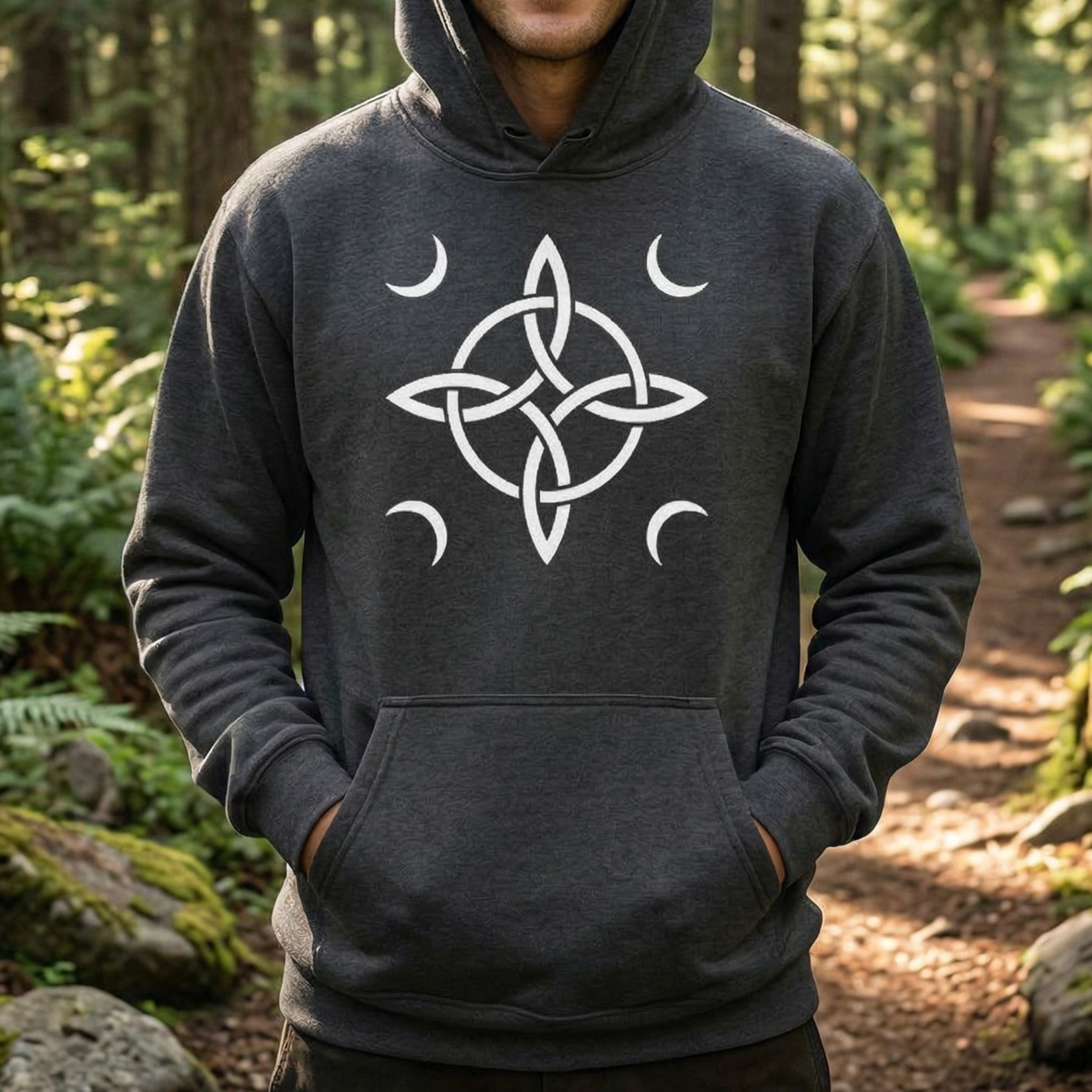 This hoodie features a striking white graphic of the ancient Witch's Knot, also known as the Magic Knot, beautifully encircled by four luminous crescent moons. The Witch's Knot is a powerful symbol of protection, warding off negative energies and binding intentions, while the surrounding crescent moons represent intuition, divine feminine energy, and the cyclical nature of life. This unique design is perfect for those who embrace pagan wisdom, mysticism, and spiritual connection. It's a bold and evocative statement piece for any wardrobe, blending ancient magic with contemporary style.