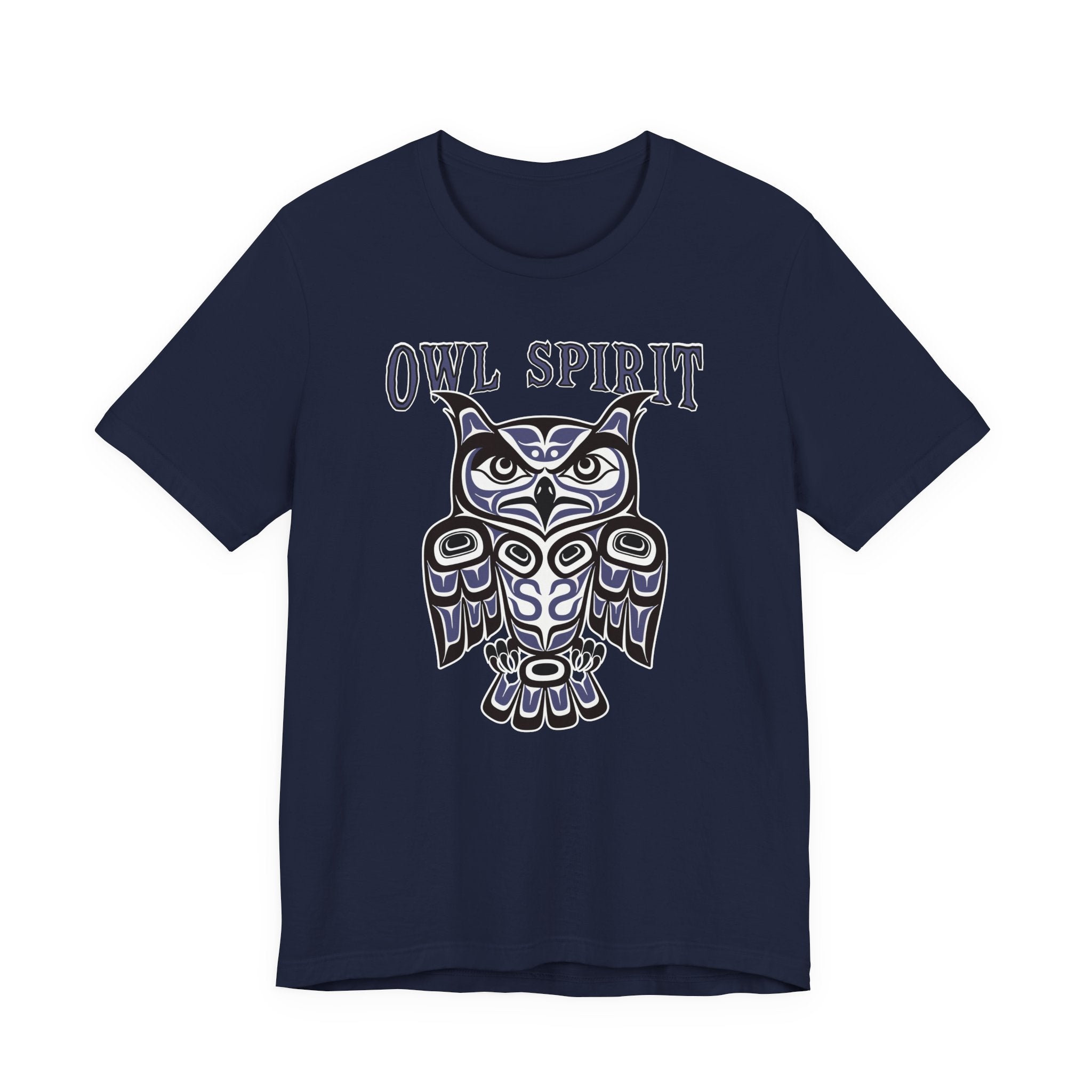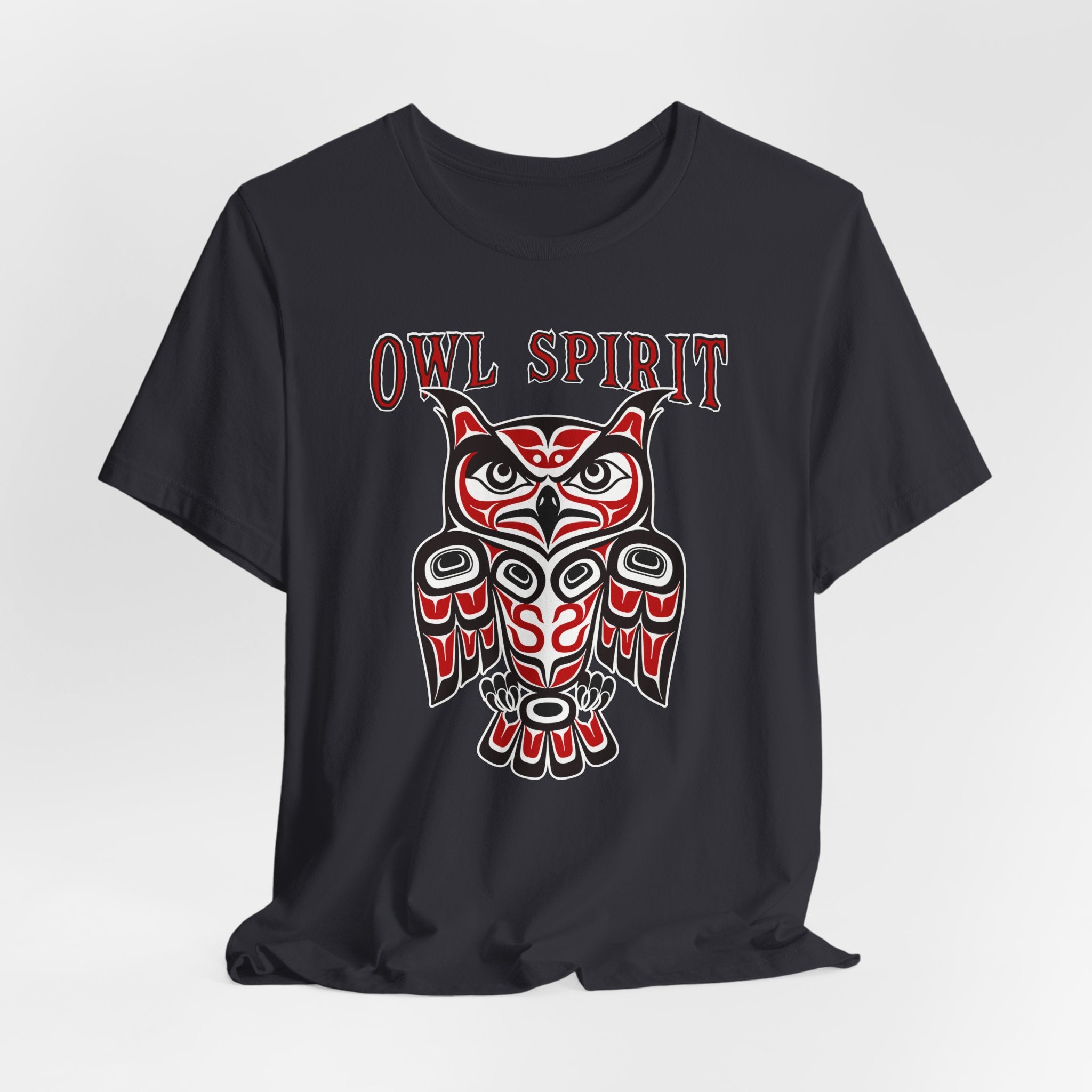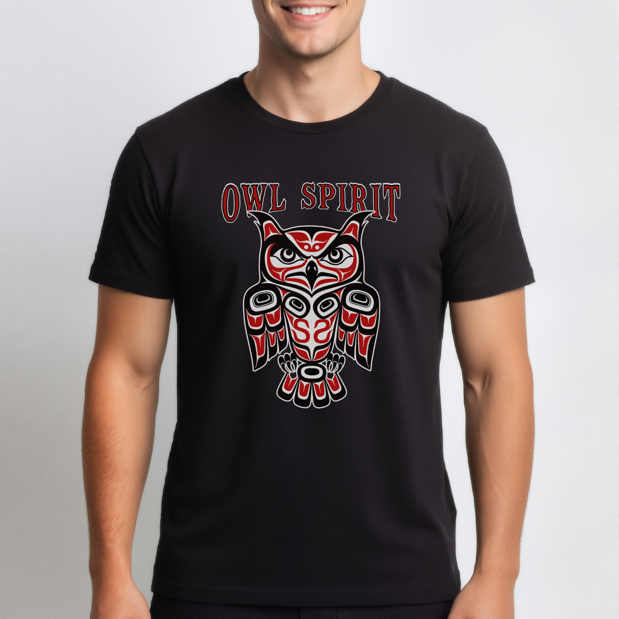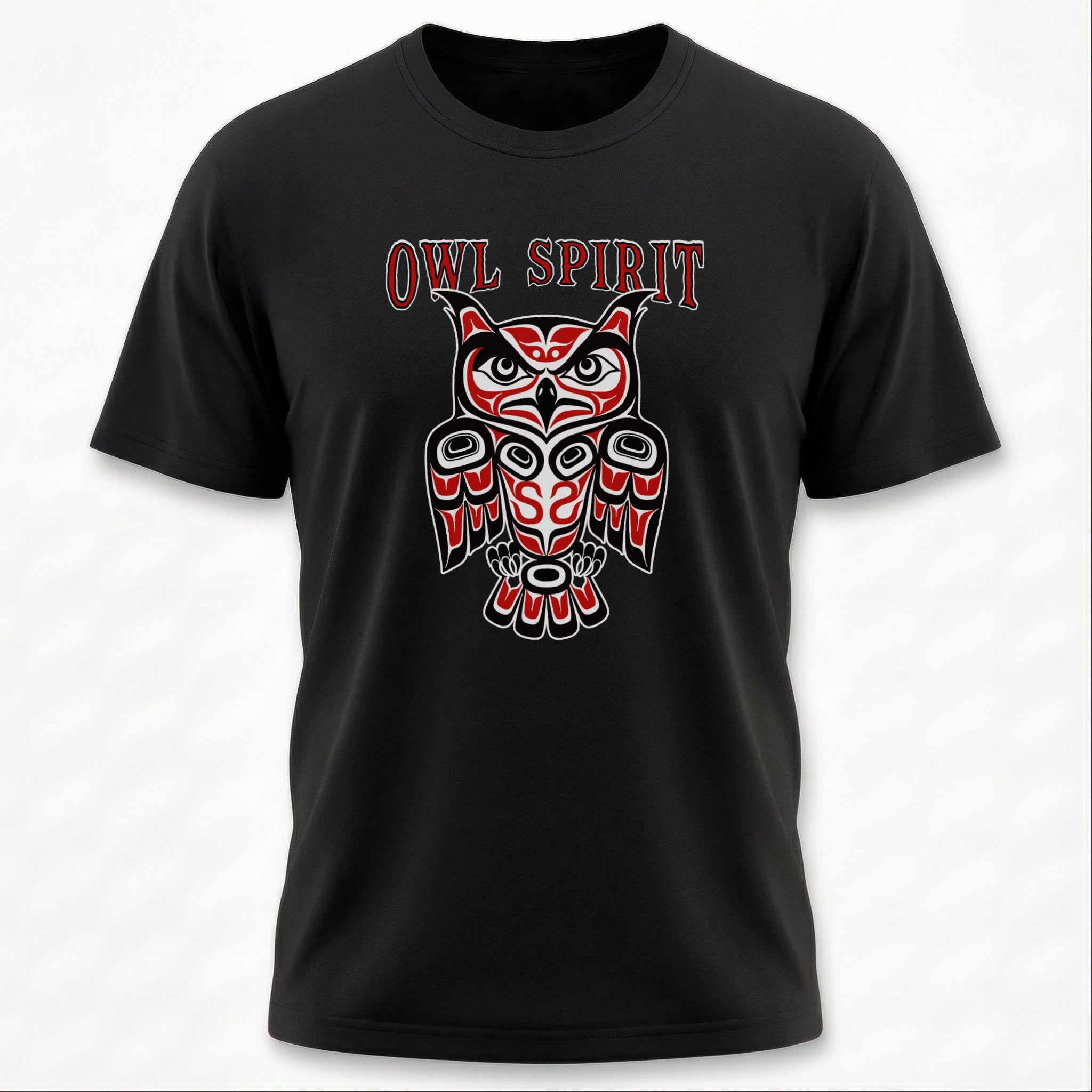 This t-shirt features a striking owl design rendered in the distinctive Pacific Northwest Coast Indigenous art style, characterized by its bold formlines, ovoids, and U-shapes. The owl, a revered creature in many Indigenous cultures, symbolizes wisdom, intuition, protection, and keen perception, often seen as a guardian of sacred knowledge and a messenger between worlds. The prominent "OWL SPIRIT" text further emphasizes its profound spiritual connection. This intricate artwork, with its classic red, black, and white palette, makes this design a powerful and eye-catching statement piece, celebrating ancient traditions and the enduring spirit of the owl.