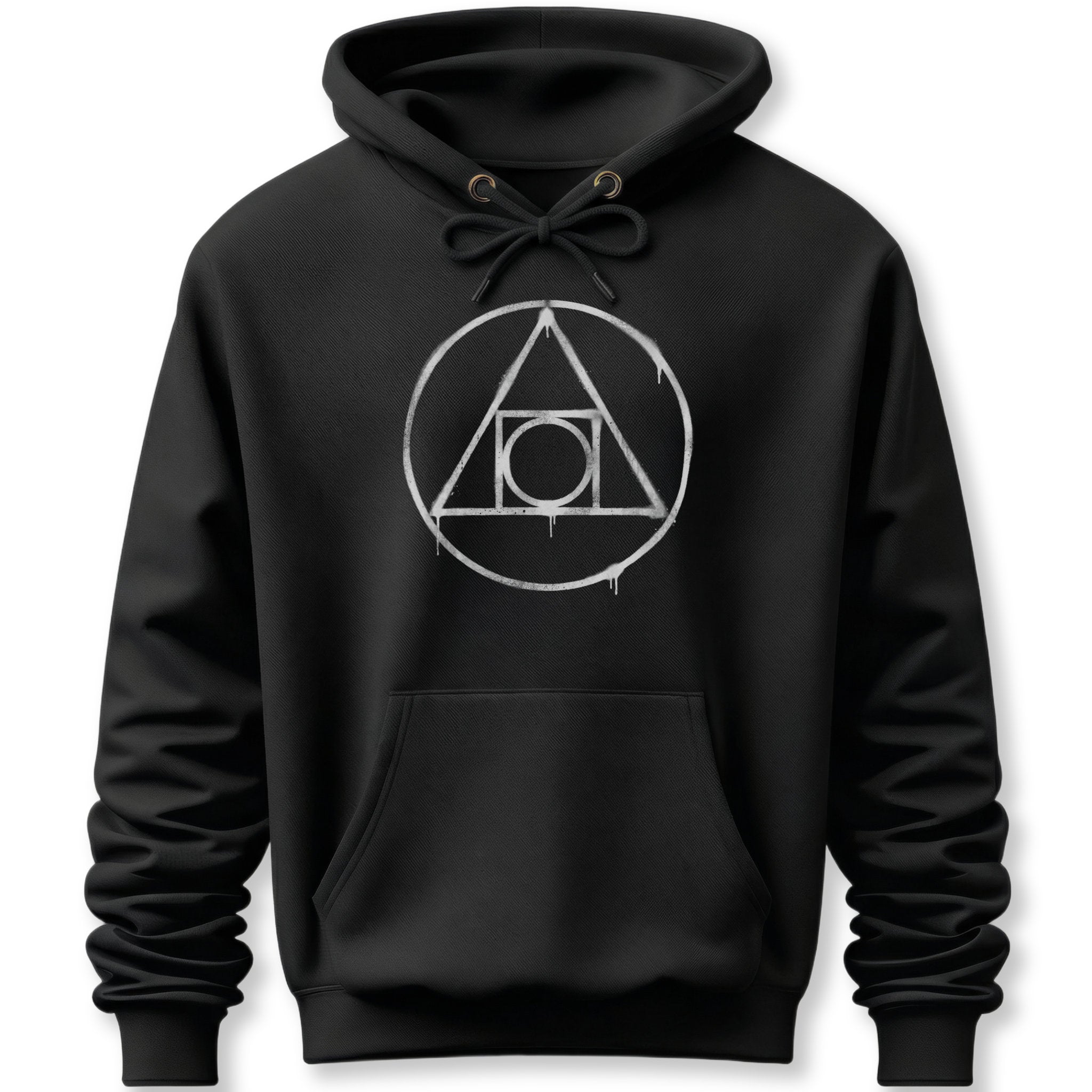 This hoodie features a striking white geometric design, combining a foundational circle encompassing an upward-pointing triangle, which in turn frames a square and an innermost circle. The graphic is rendered with a unique, slightly distressed and subtly dripping texture, giving it an ancient, almost ethereal quality. This powerful emblem is widely recognized as the symbol for the Philosopher's Stone in alchemy. It represents the ultimate quest for knowledge, transformation, and enlightenment, signifying the union of the material and spiritual worlds, and the pursuit of perfection. The raw, almost spiritual texture of the design adds depth, making it a conversation starter for those drawn to ancient wisdom, esoteric studies, or personal evolution. It's a bold and meaningful statement piece for any wardrobe.