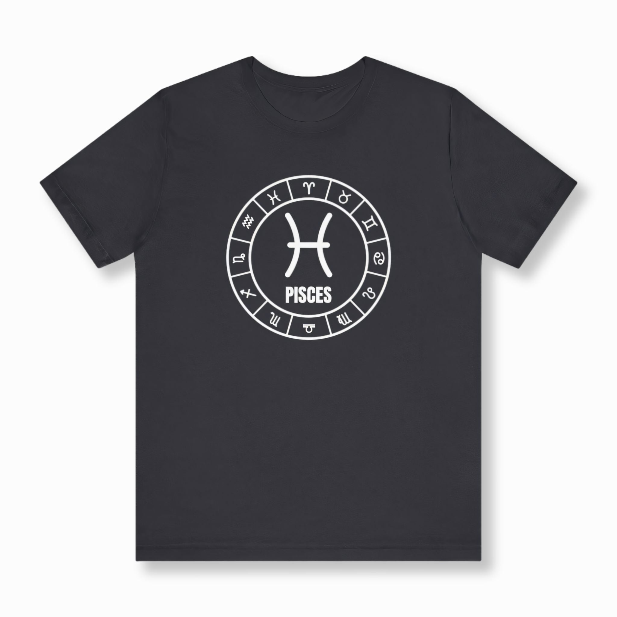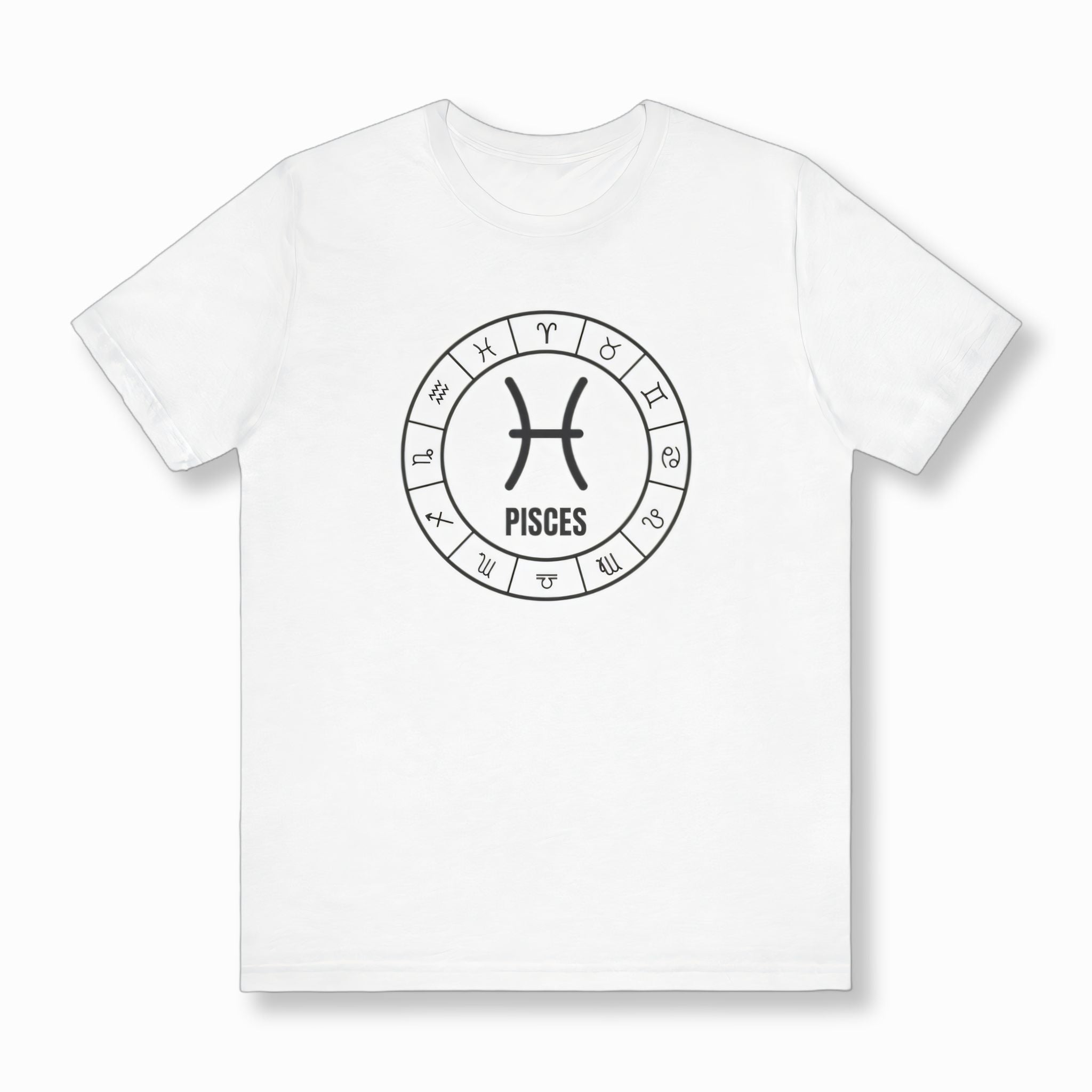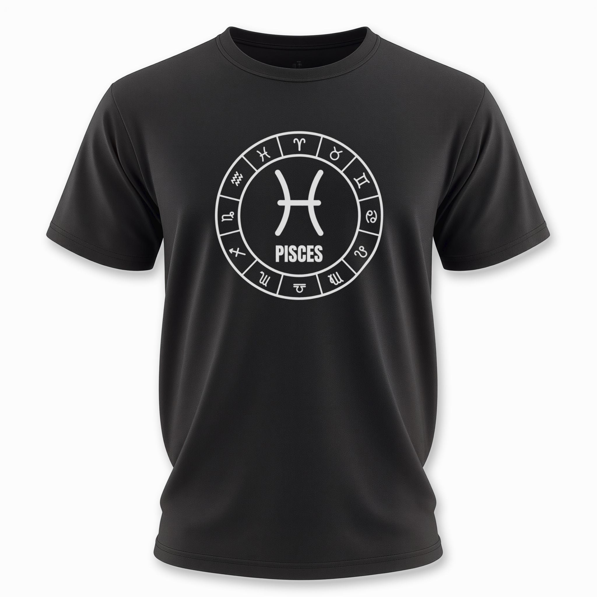 This t-shirt features a striking white-on-black graphic of a detailed zodiac wheel. At its heart lies the distinctive symbol for Pisces, beautifully centered and accompanied by the "PISCES" inscription, surrounded by all twelve astrological signs in a celestial arrangement. This unique design celebrates the profound symbolism of the zodiac, particularly highlighting the empathetic and intuitive nature of the Pisces sign. It's a visually captivating piece that resonates with astrology enthusiasts and those proud of their birth sign.