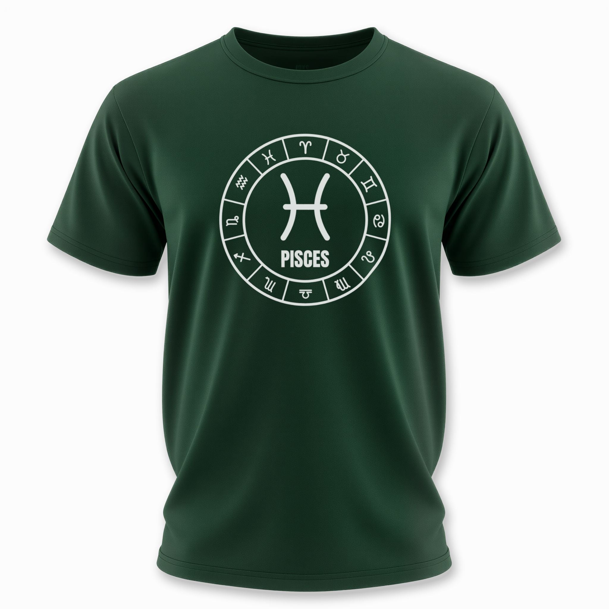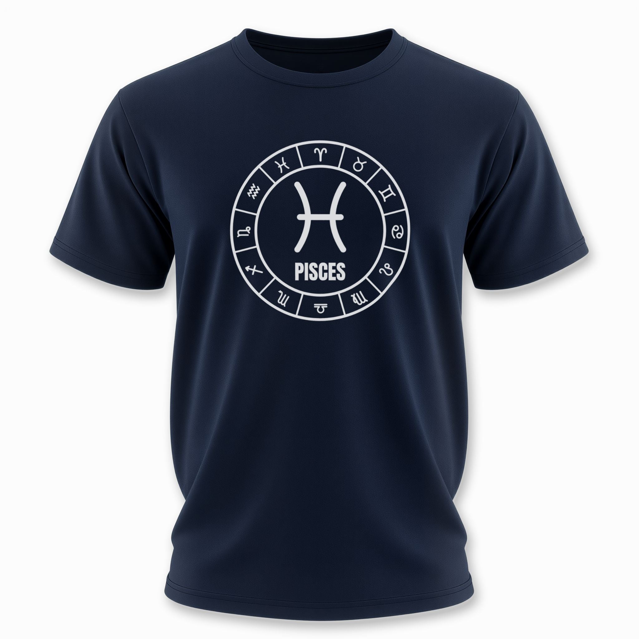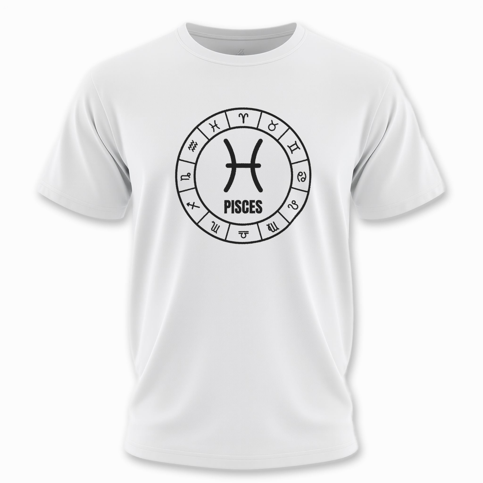 This t-shirt features a striking white-on-black graphic of a detailed zodiac wheel. At its heart lies the distinctive symbol for Pisces, beautifully centered and accompanied by the "PISCES" inscription, surrounded by all twelve astrological signs in a celestial arrangement. This unique design celebrates the profound symbolism of the zodiac, particularly highlighting the empathetic and intuitive nature of the Pisces sign. It's a visually captivating piece that resonates with astrology enthusiasts and those proud of their birth sign.
