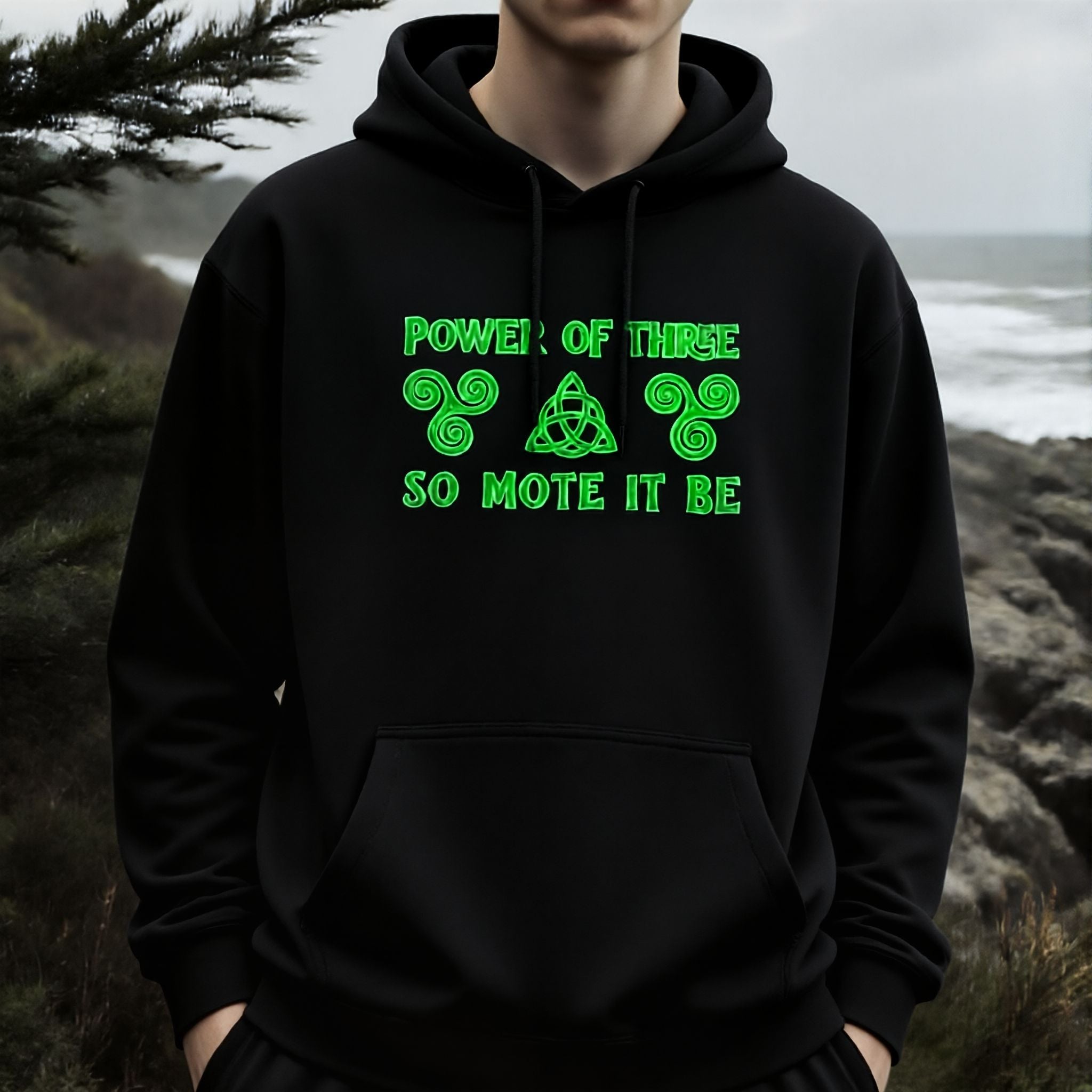 This hoodie features a vibrant neon green design prominently displaying the phrase "POWER OF THREE" above a trio of profound Celtic symbols – two swirling triskelions gracefully flanking a central triquetra knot. Below this powerful imagery, the ancient affirmation "SO MOTE IT BE" completes the design. It embodies the mystical concept of the Rule of Three, signifying balance, cycles, and interconnectedness in mind, body, and spirit. The triskelions represent perpetual motion and eternal life, while the triquetra symbolizes unity and spiritual connection. "So Mote It Be" acts as a potent affirmation, invoking manifestation and the completion of intent. This graphic is a perfect blend of ancient wisdom and modern style, making a bold statement for those who resonate with spiritual symbolism, Celtic heritage, or the power of affirmation.