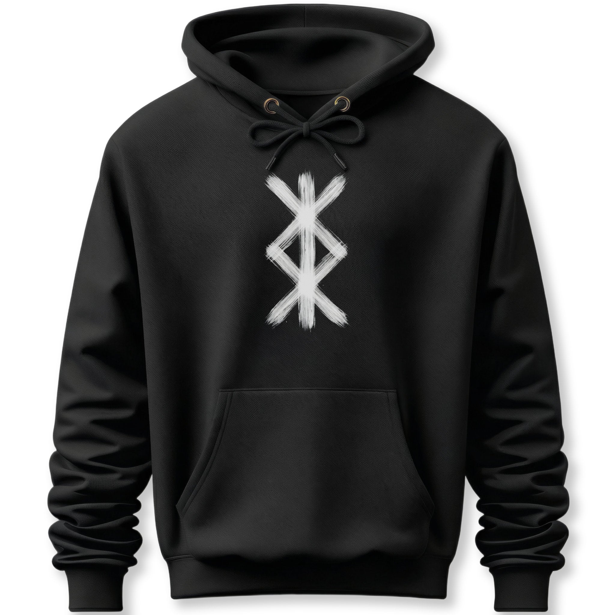 This hoodie features a striking white brushstroke design of a Viking protection bind rune, an ancient symbol deeply rooted in Norse tradition. Revered for its powerful associations with protection, defense, and spiritual guardianship, this bind rune is often seen as a ward against negative influences and a conduit for divine connection and guidance. Rendered in a raw, brushstroke style, this design evokes an authentic, primal energy, making it a bold and meaningful statement piece for those who seek spiritual strength and safeguard.