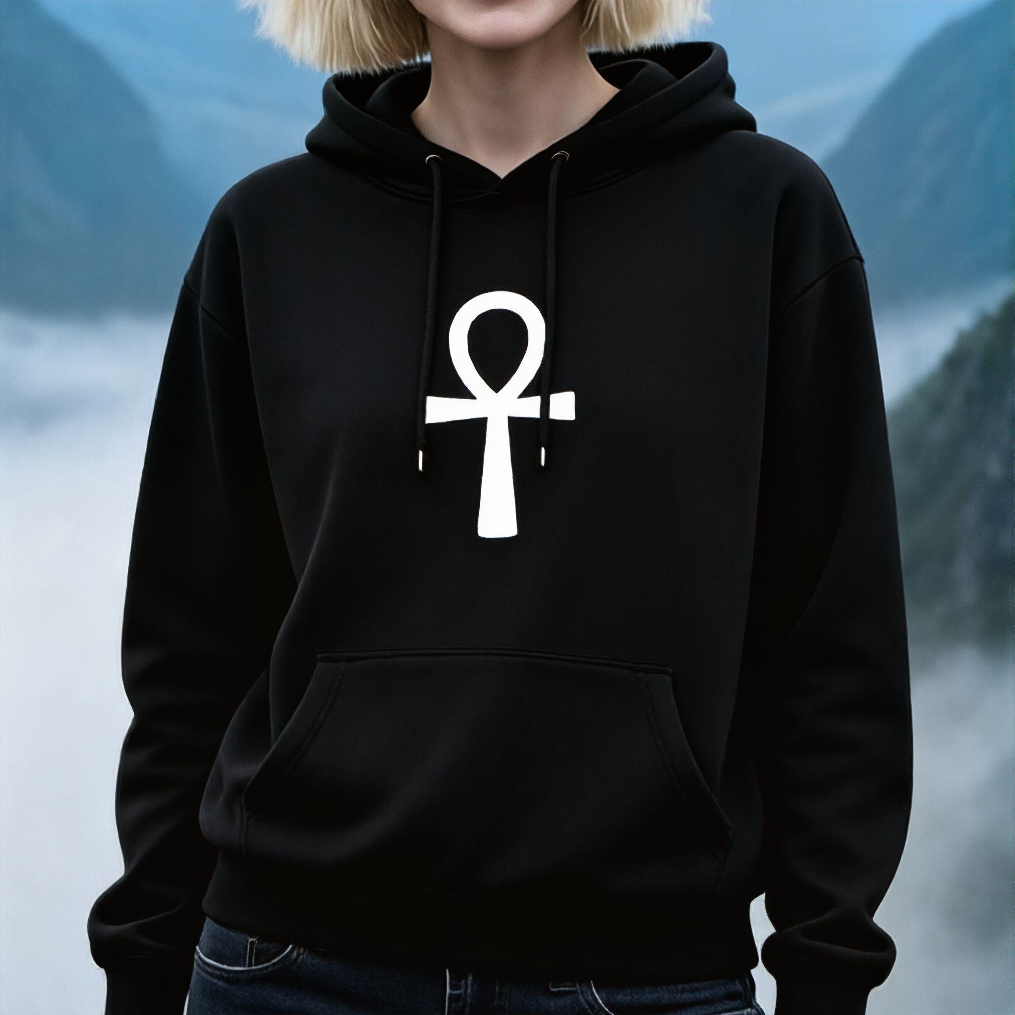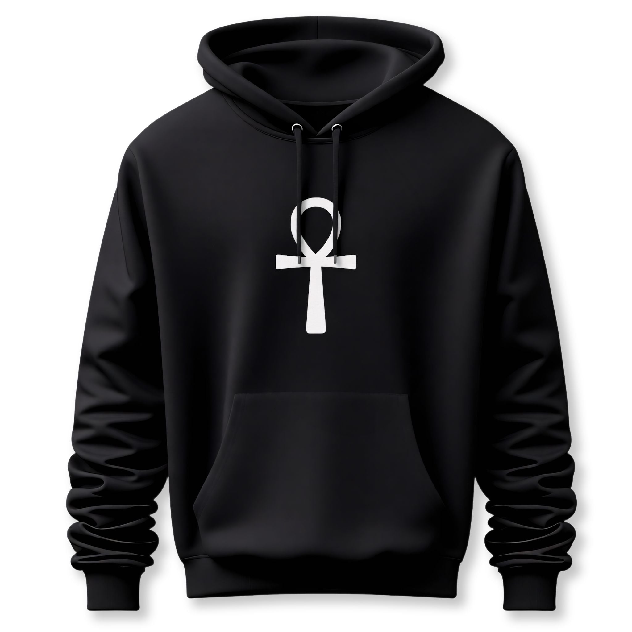 This striking hoodie features a crisp, white depiction of the ancient Egyptian Ankh symbol prominently displayed. The Ankh, often called the "Key of Life," is a powerful hieroglyphic symbol representing eternal life, vitality, and spiritual immortality. It embodies divine power, health, and a profound connection to ancient wisdom. Its minimalist yet profound design makes a significant statement, perfect for those who are drawn to ancient mysticism, cultural heritage, or deep spiritual symbolism. This iconic emblem instantly elevates any outfit, offering both style and profound meaning.