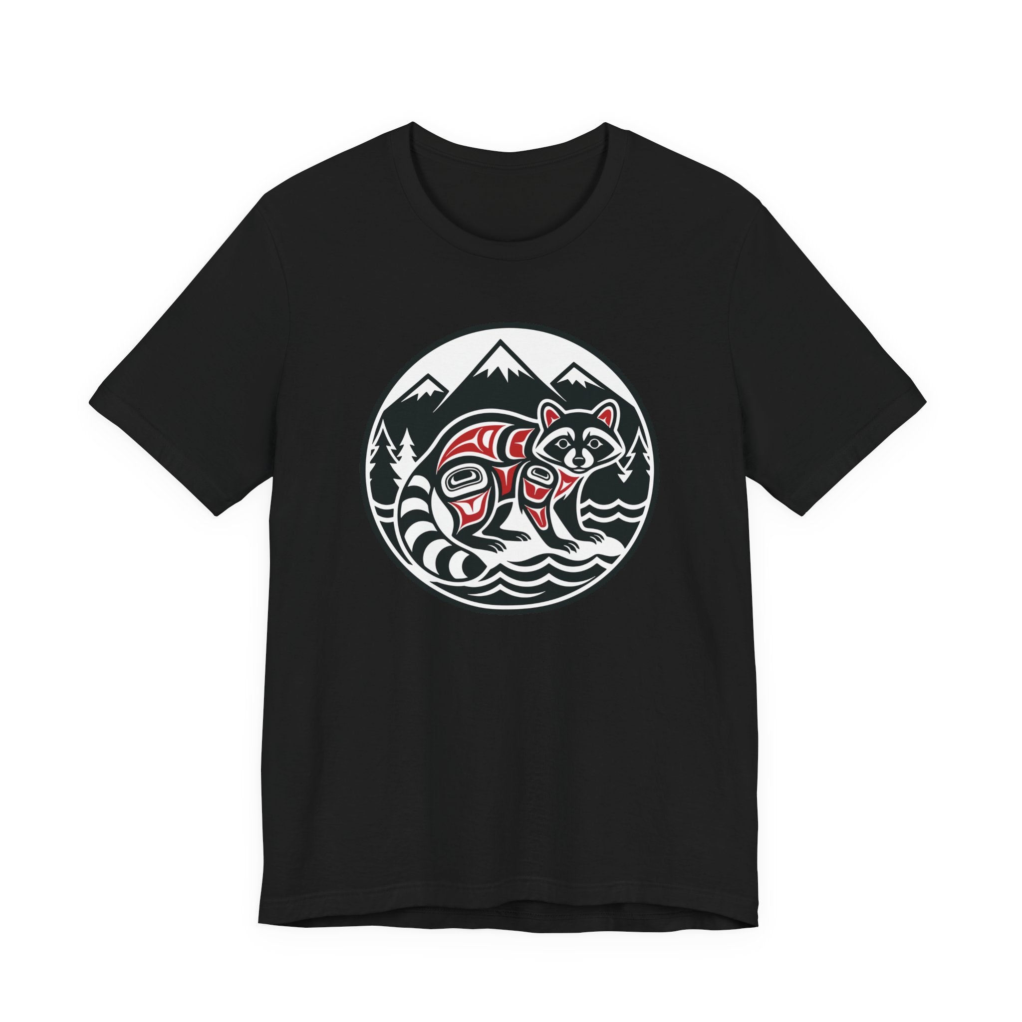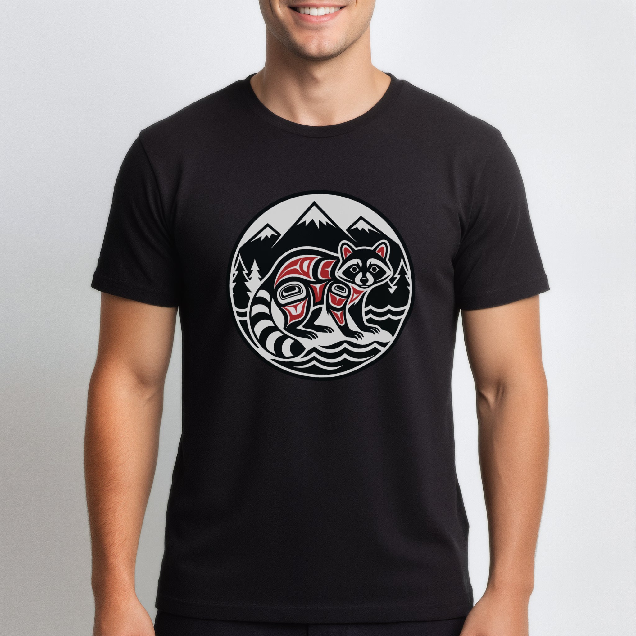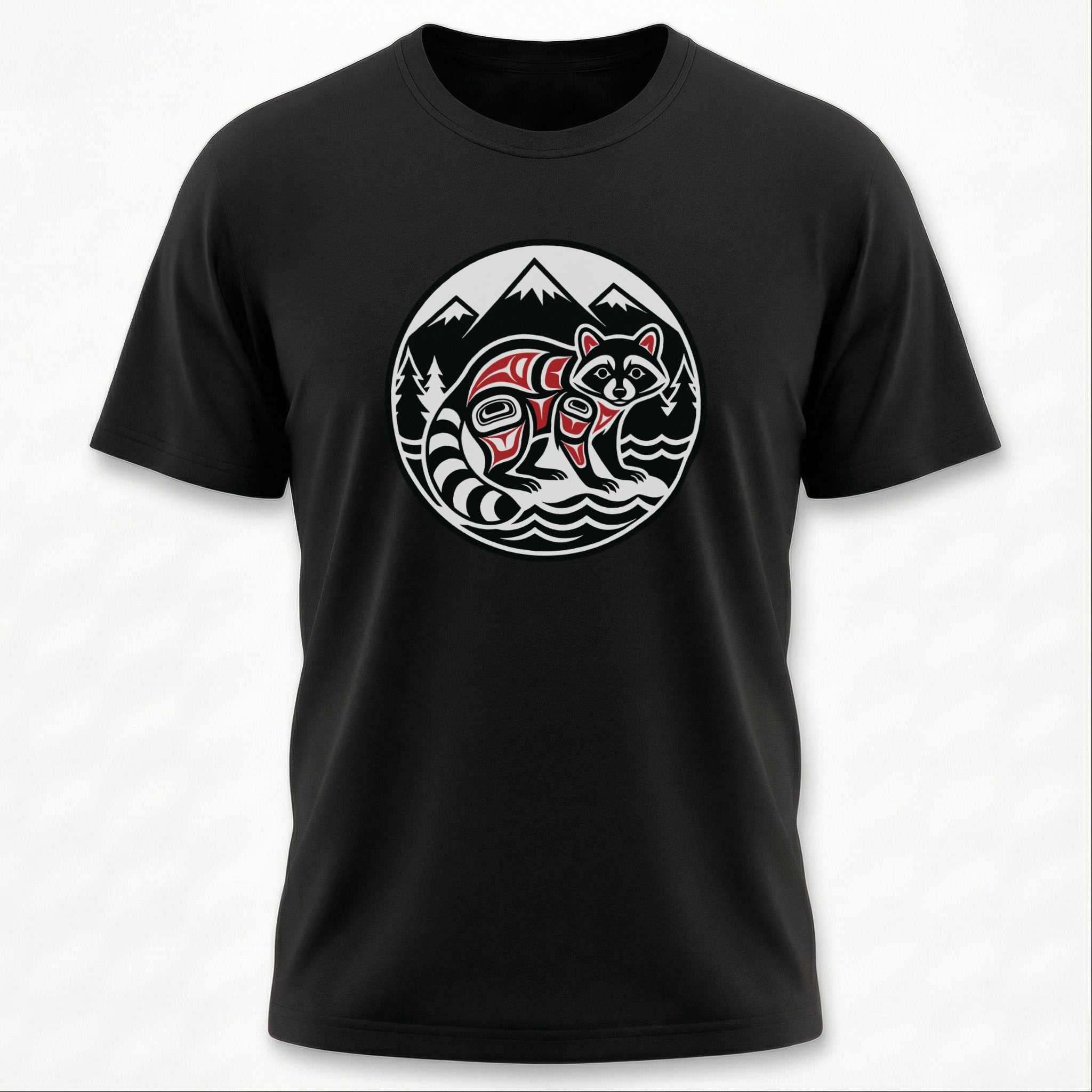 This striking t-shirt features a stylized raccoon rendered in the distinct Formline art style, artfully nestled within a natural landscape of majestic mountains, evergreen trees, and flowing water, all framed within a circular emblem. Inspired by the rich cultural heritage of Pacific Northwest Indigenous art, this design beautifully captures the clever and adaptable spirit of the raccoon. The intricate lines, bold shapes, and traditional color palette celebrate a deep connection to nature and its creatures. It's an artful statement piece, perfect for those who appreciate unique cultural aesthetics and the beauty of wildlife.
