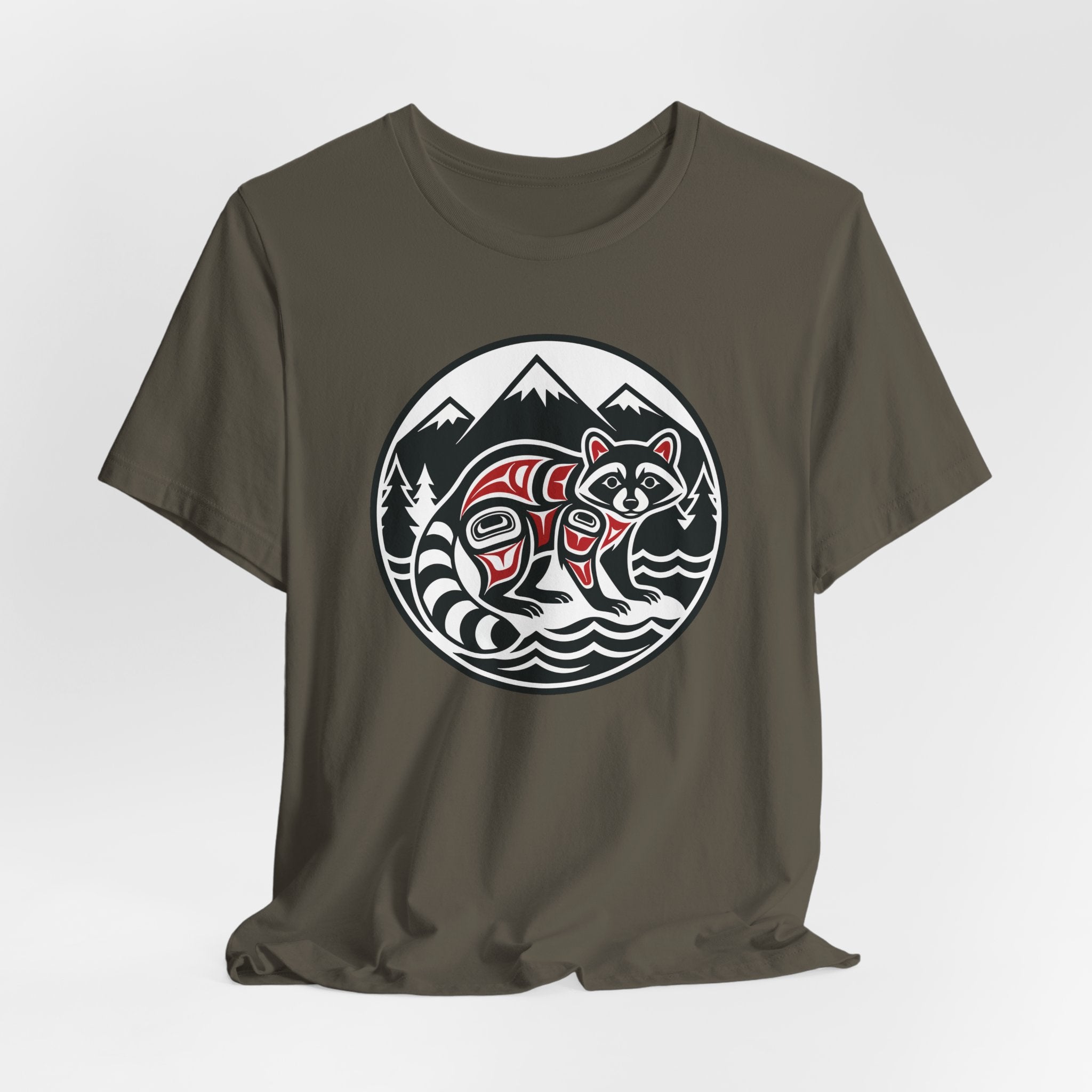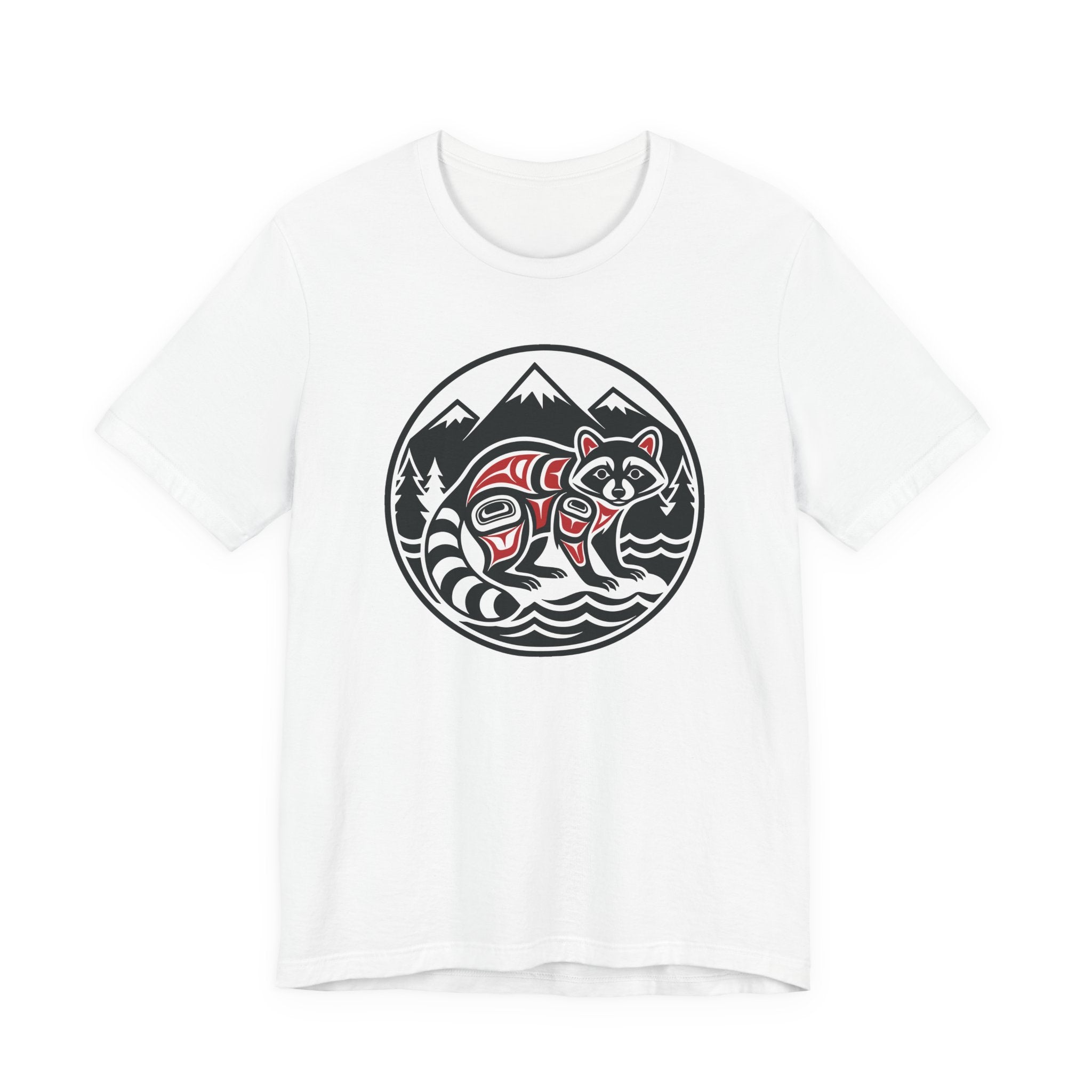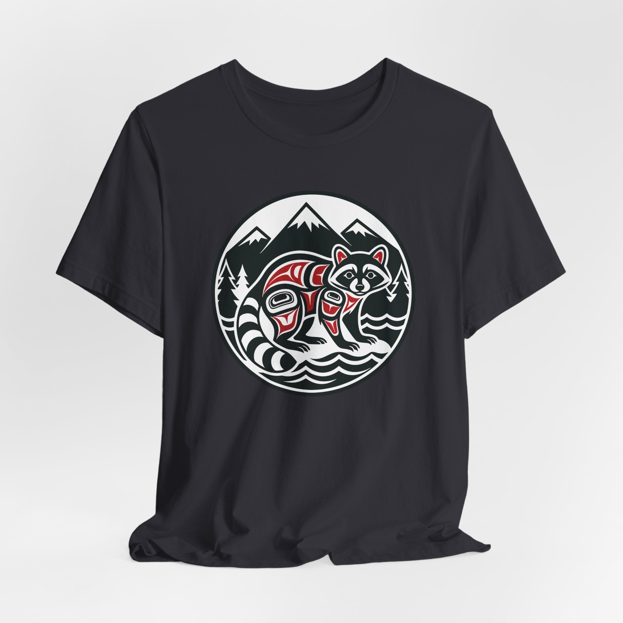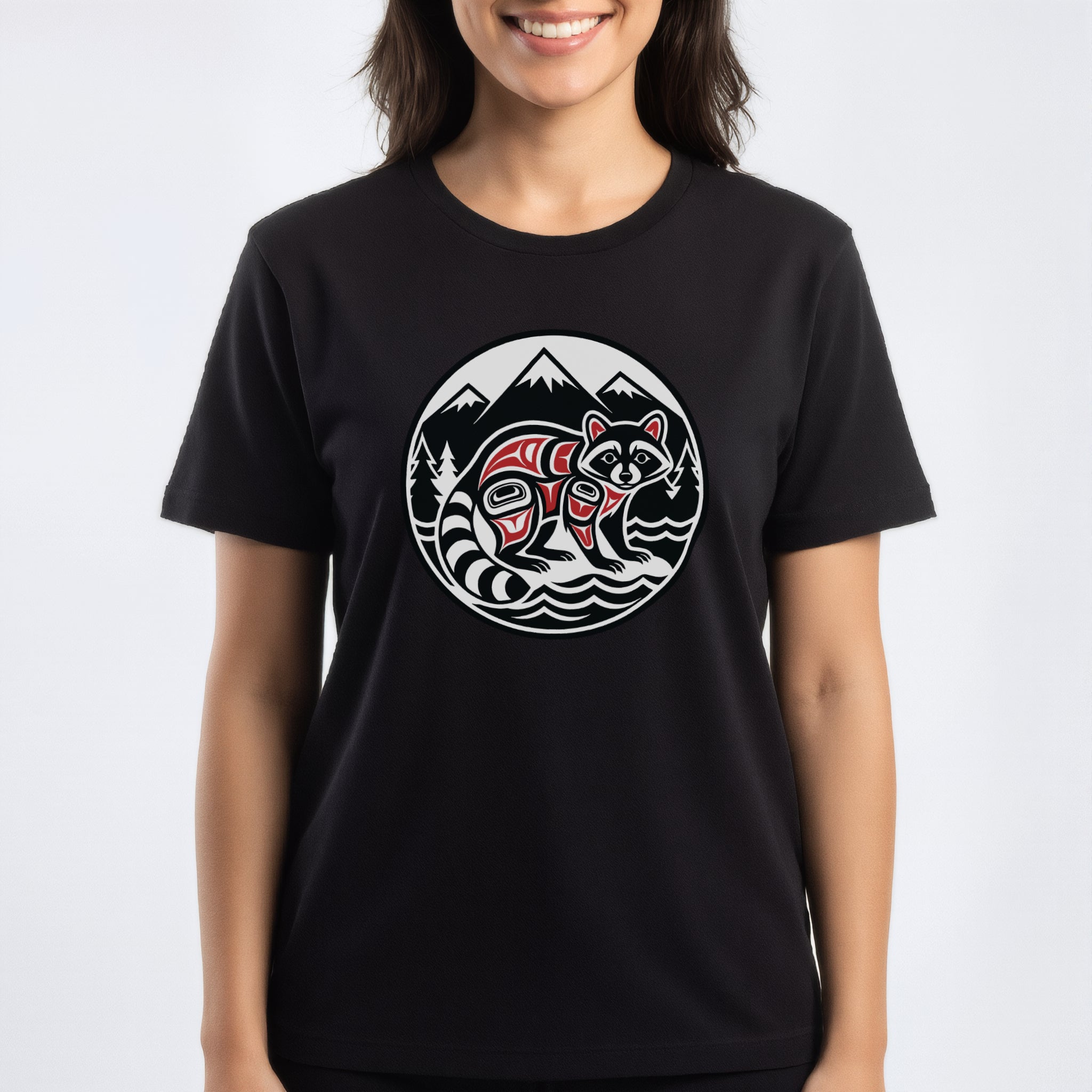 This striking t-shirt features a stylized raccoon rendered in the distinct Formline art style, artfully nestled within a natural landscape of majestic mountains, evergreen trees, and flowing water, all framed within a circular emblem. Inspired by the rich cultural heritage of Pacific Northwest Indigenous art, this design beautifully captures the clever and adaptable spirit of the raccoon. The intricate lines, bold shapes, and traditional color palette celebrate a deep connection to nature and its creatures. It's an artful statement piece, perfect for those who appreciate unique cultural aesthetics and the beauty of wildlife.