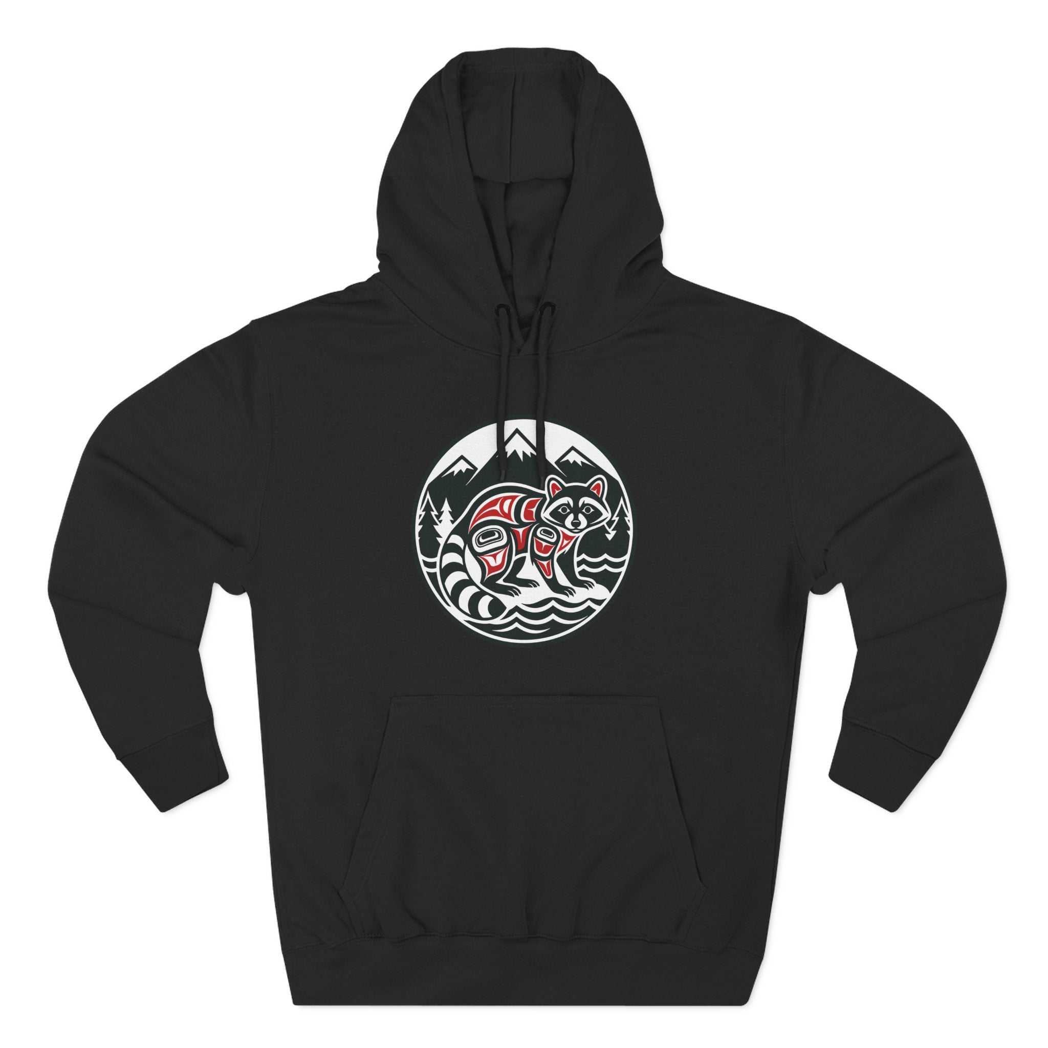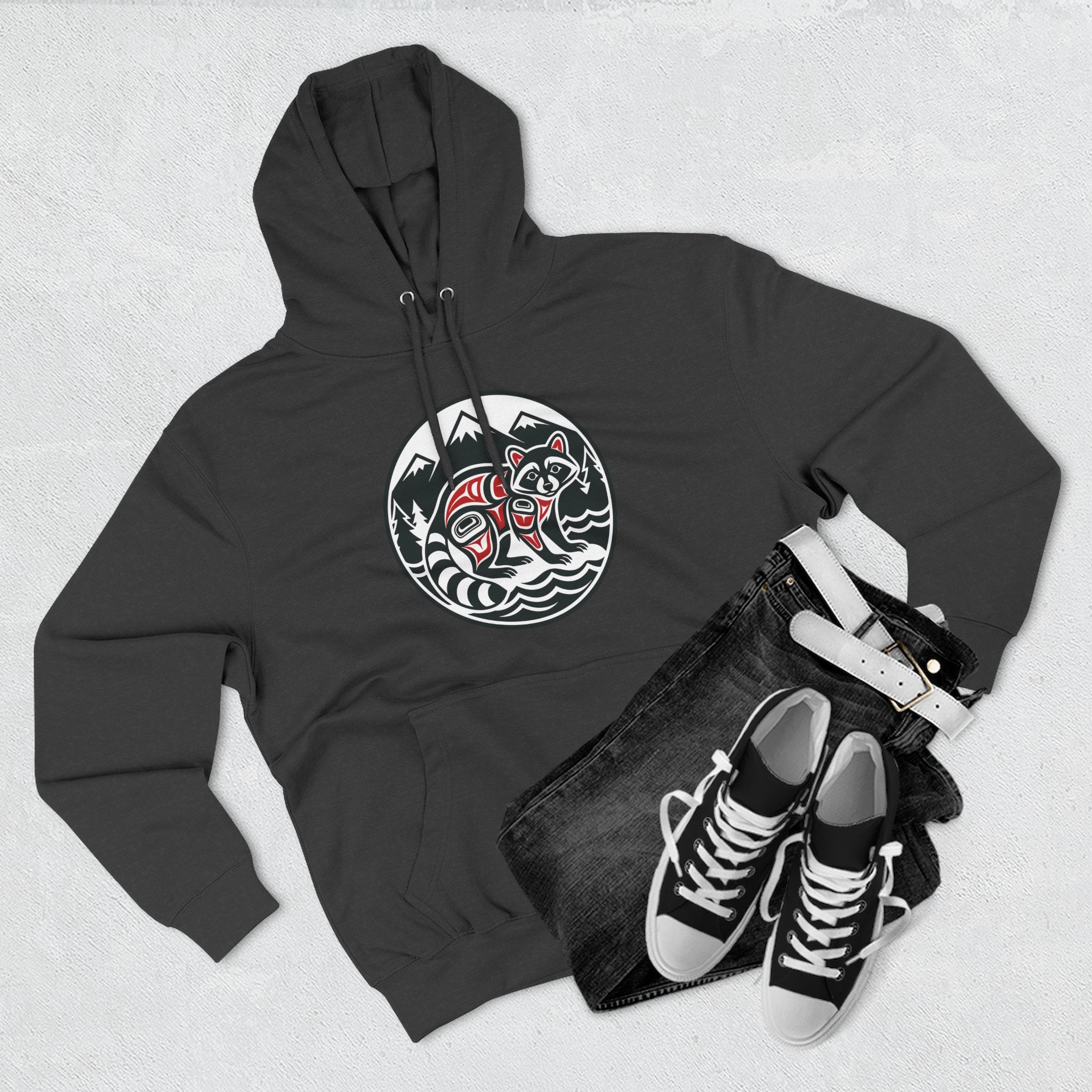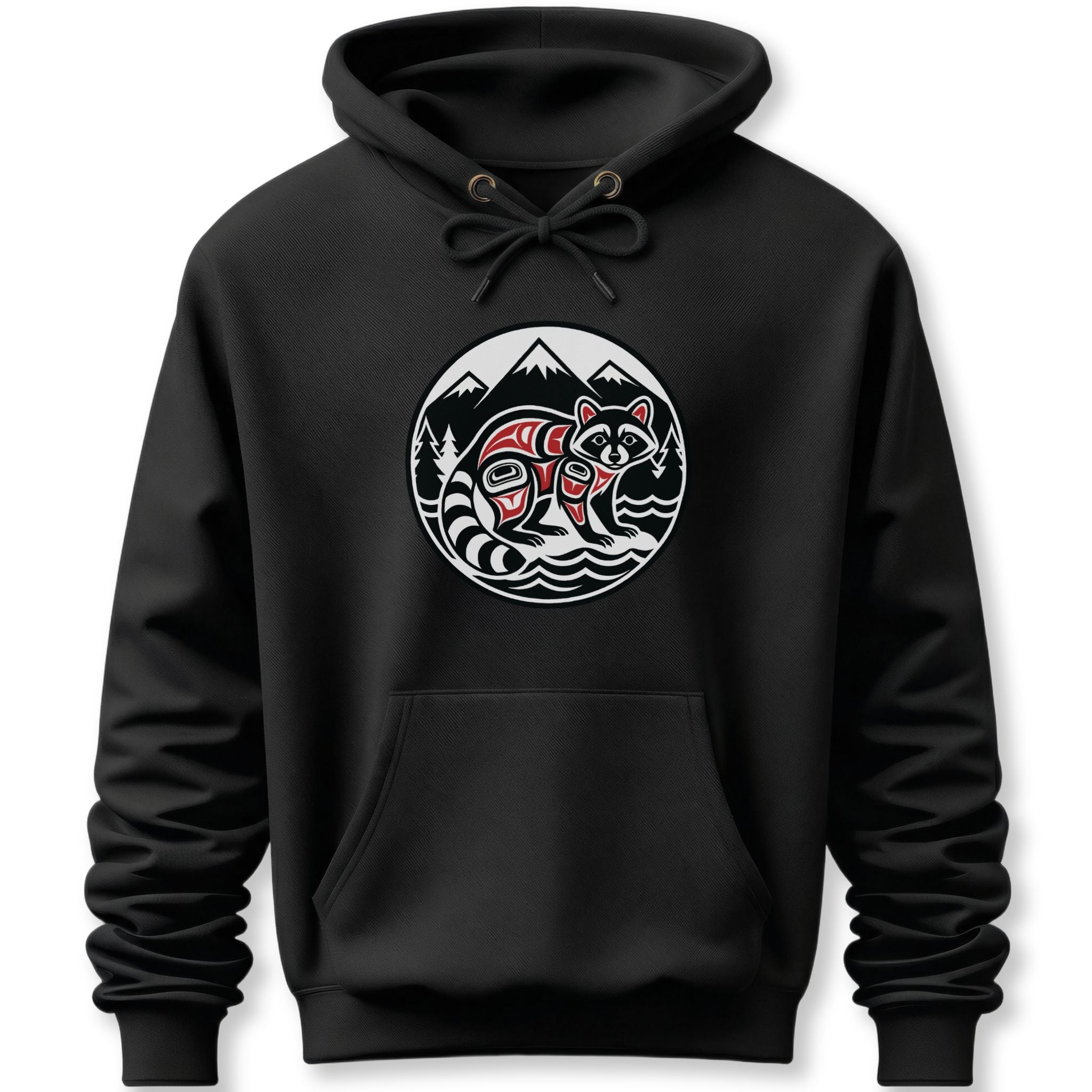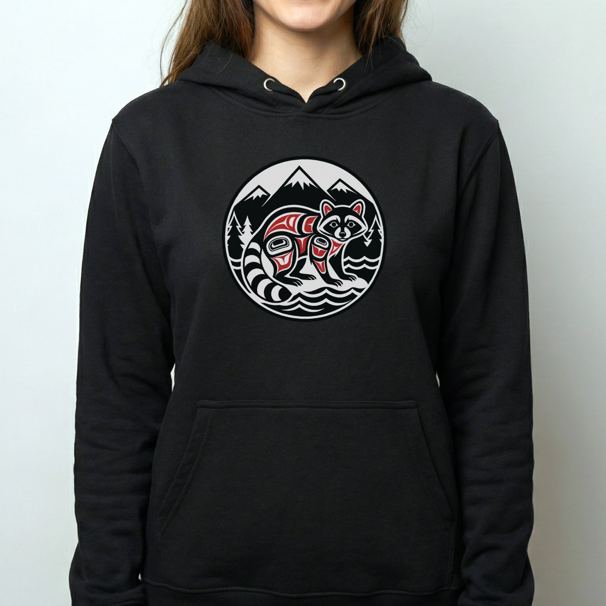 This hoodie showcases a captivating design inspired by traditional Northwest Coast Indigenous art, featuring a stylized raccoon within a circular landscape of mountains, trees, and water. The raccoon, a creature celebrated in many Indigenous narratives, often symbolizes resourcefulness, curiosity, and adaptability. Rendered in classic formline art with bold lines and striking red accents, this design evokes a deep respect for nature and the rich cultural heritage of the Pacific Northwest. It's a visually compelling and culturally significant piece, perfect for those who seek unique art with meaningful symbolism.