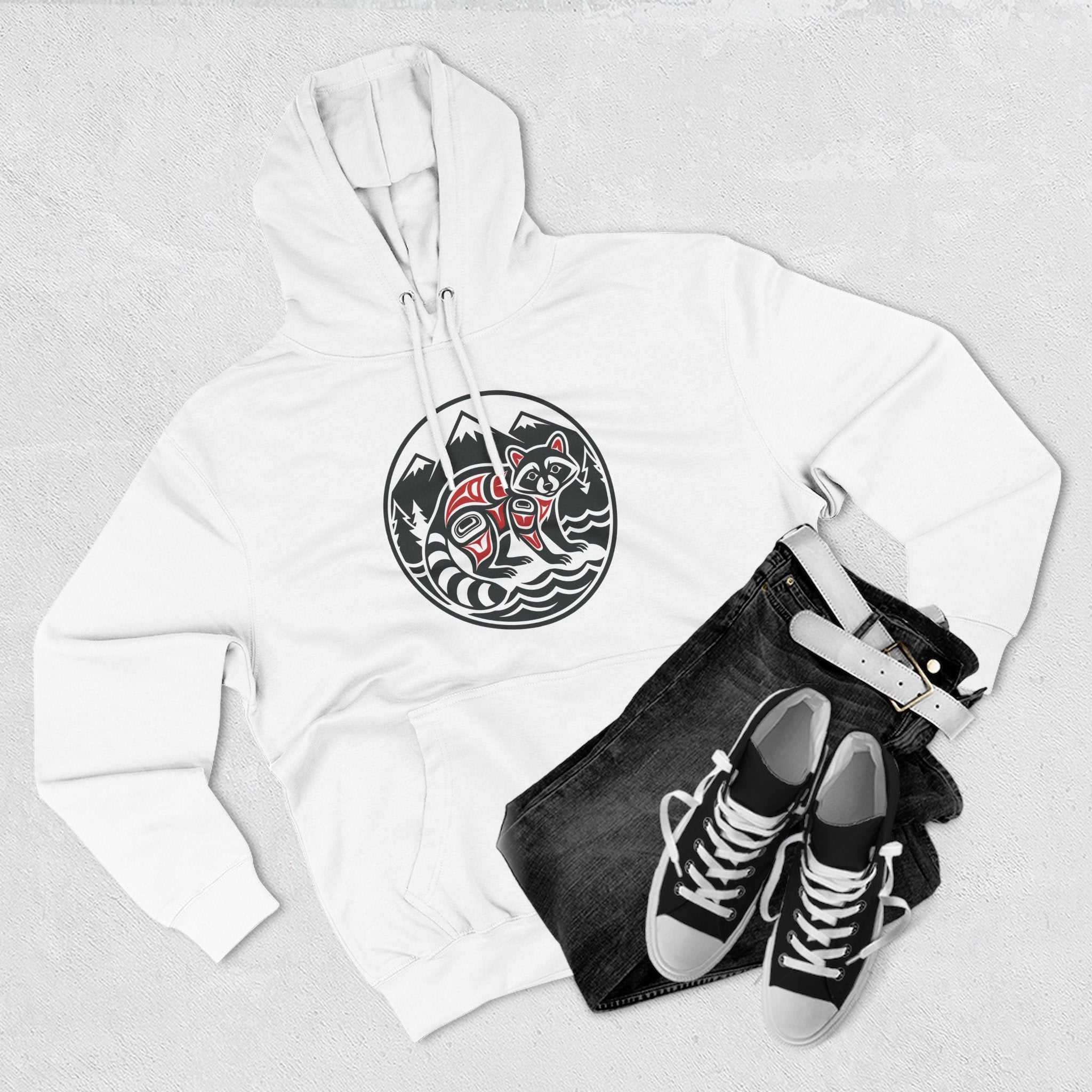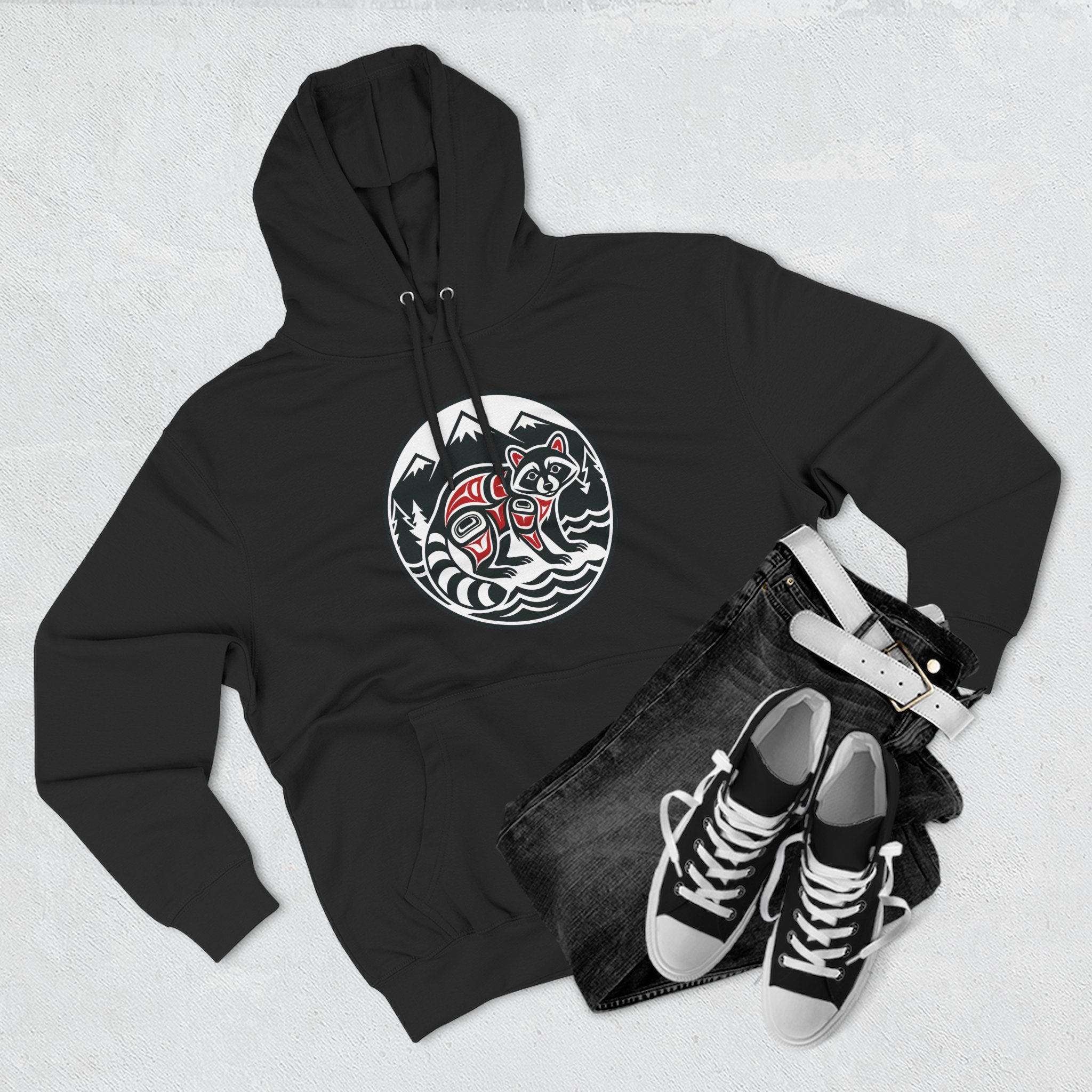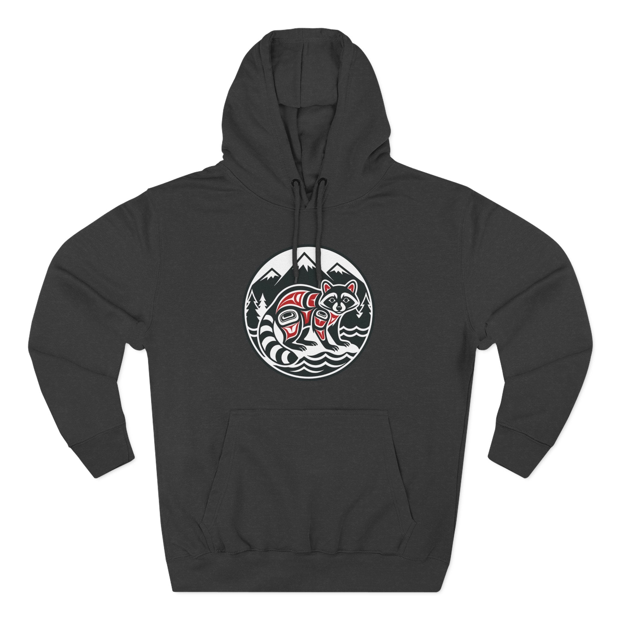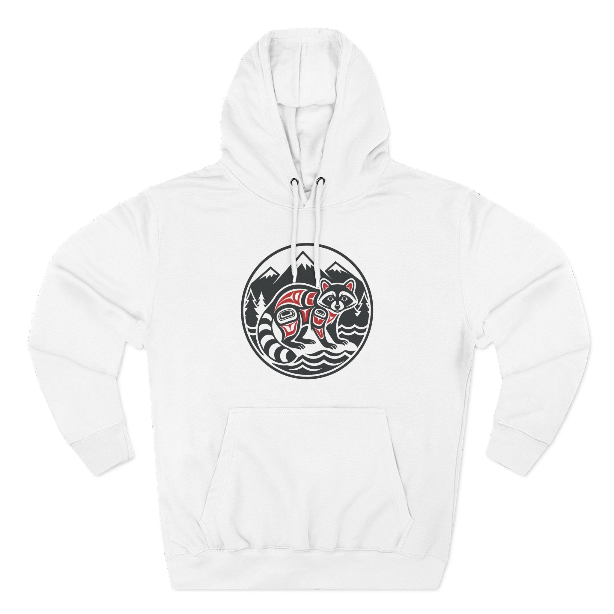 This hoodie showcases a captivating design inspired by traditional Northwest Coast Indigenous art, featuring a stylized raccoon within a circular landscape of mountains, trees, and water. The raccoon, a creature celebrated in many Indigenous narratives, often symbolizes resourcefulness, curiosity, and adaptability. Rendered in classic formline art with bold lines and striking red accents, this design evokes a deep respect for nature and the rich cultural heritage of the Pacific Northwest. It's a visually compelling and culturally significant piece, perfect for those who seek unique art with meaningful symbolism.