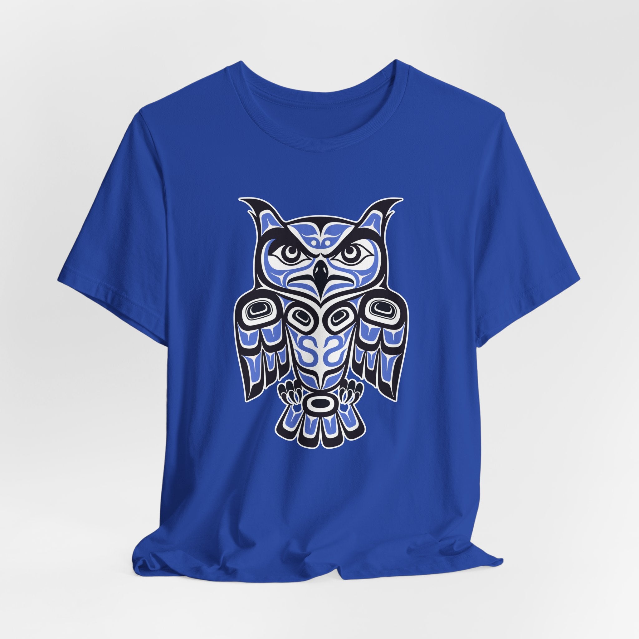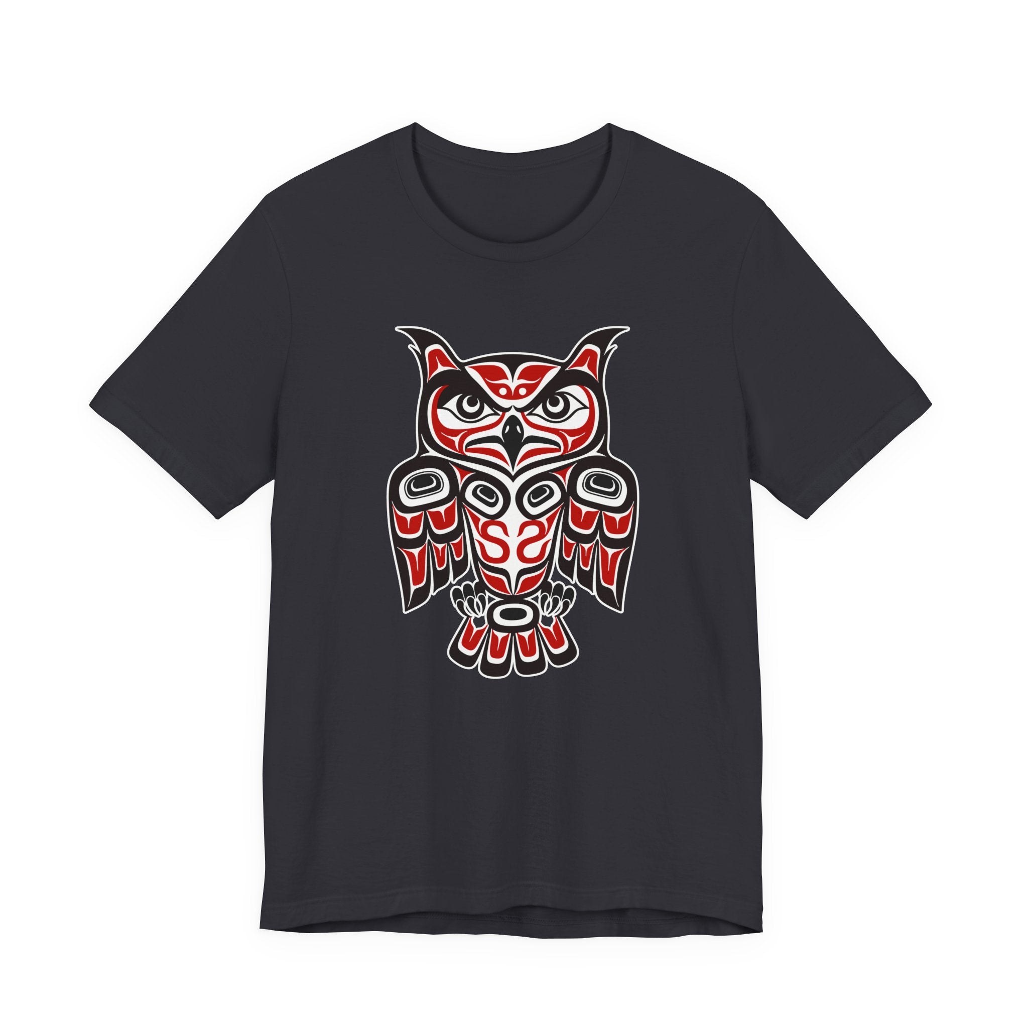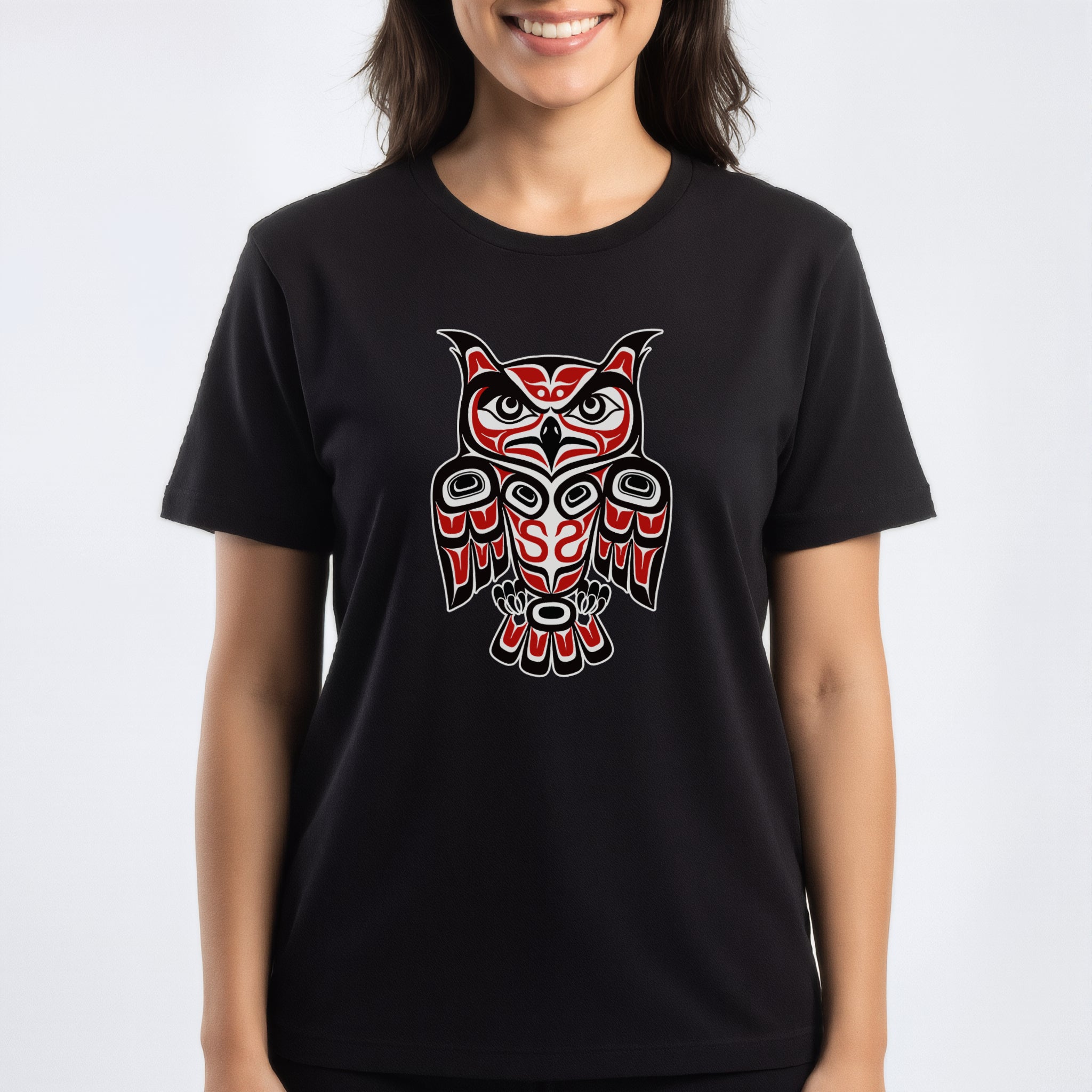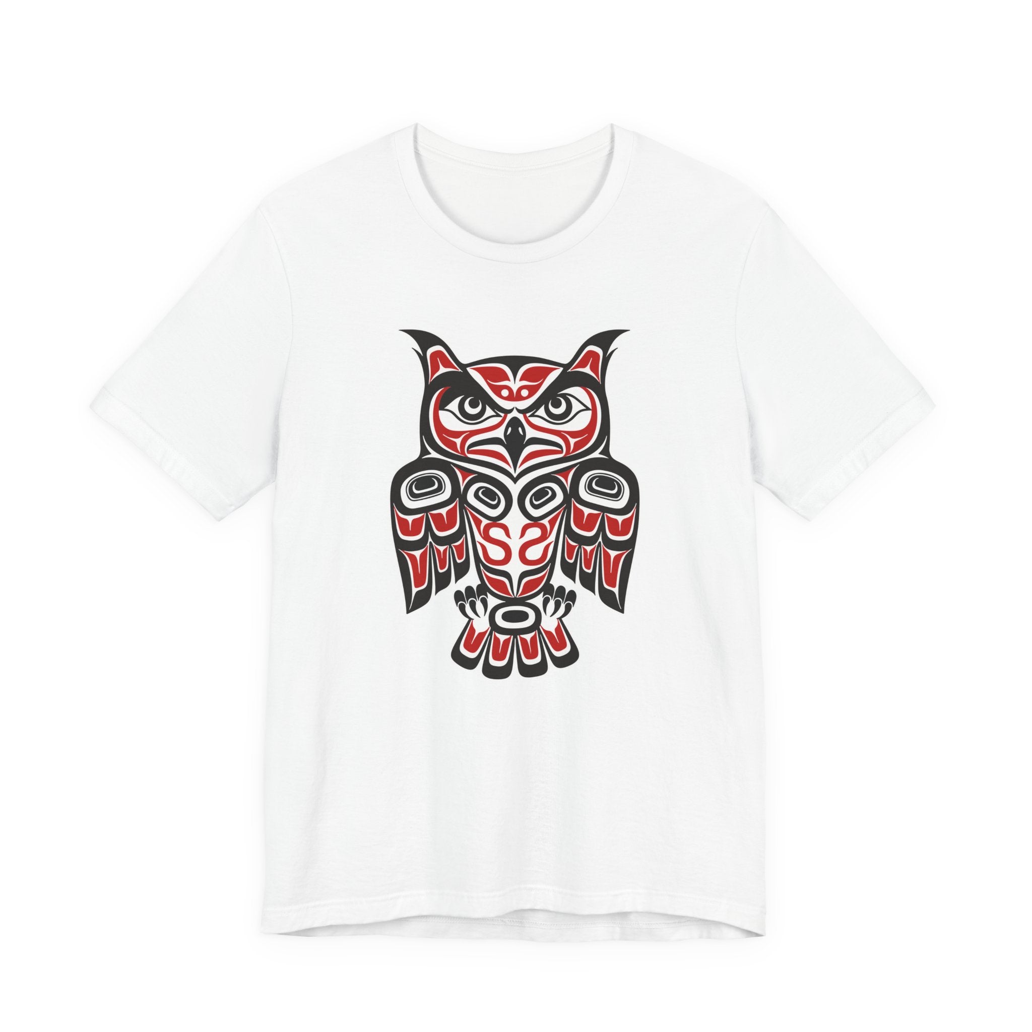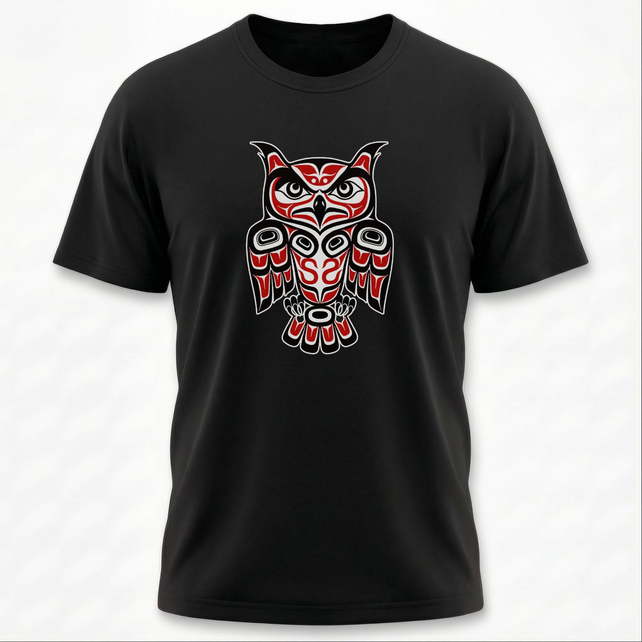 This t-shirt features a captivating owl rendered in the distinctive style of Pacific Northwest Coast Indigenous art. The design showcases bold formlines, ovoid shapes, and a striking red and black color palette, characteristic of this rich artistic tradition. Owls in many cultures symbolize wisdom, intuition, and protection, making this design both visually powerful and deeply meaningful. It's a captivating piece that celebrates cultural heritage and the enigmatic spirit of the owl, perfect for those who appreciate unique artistic expression.