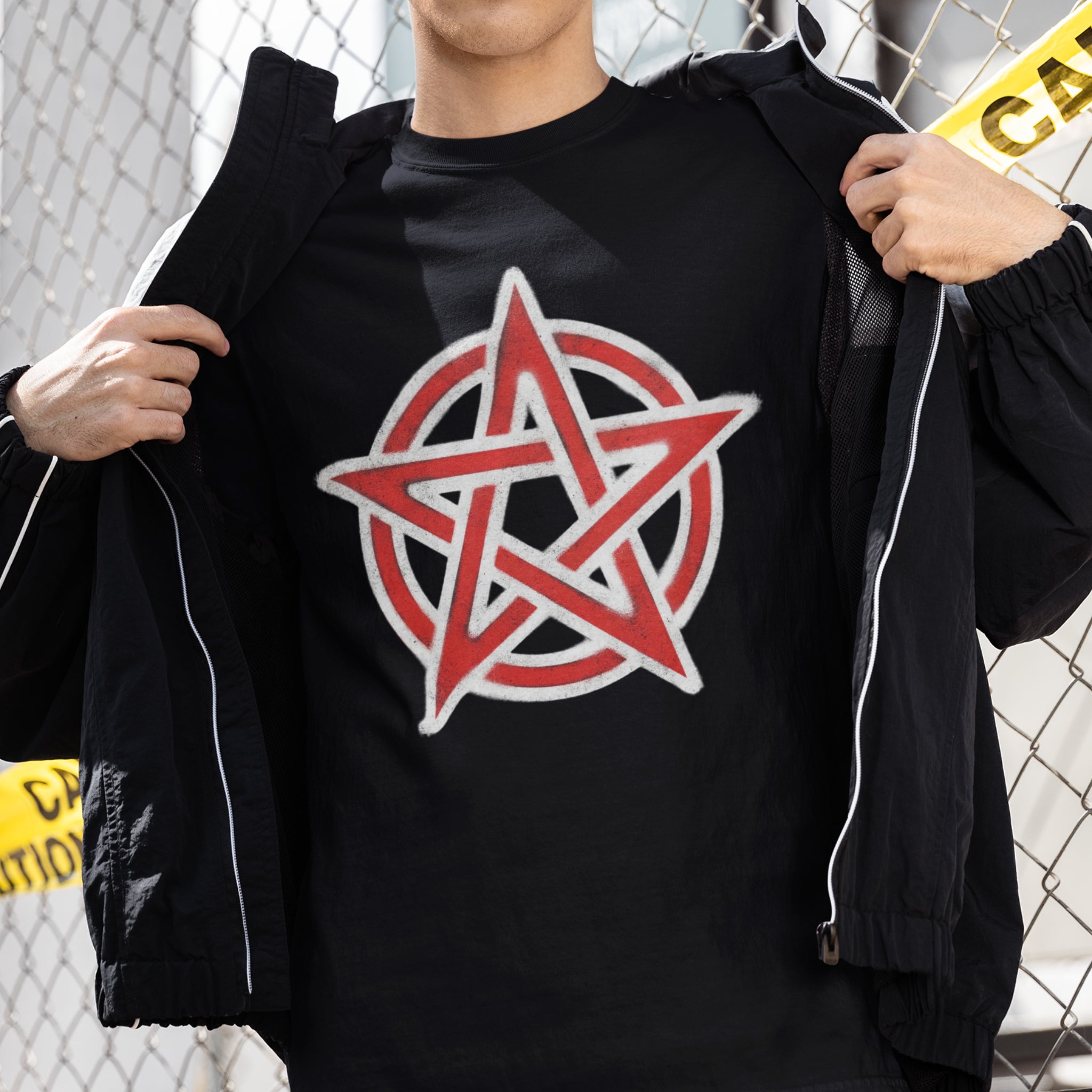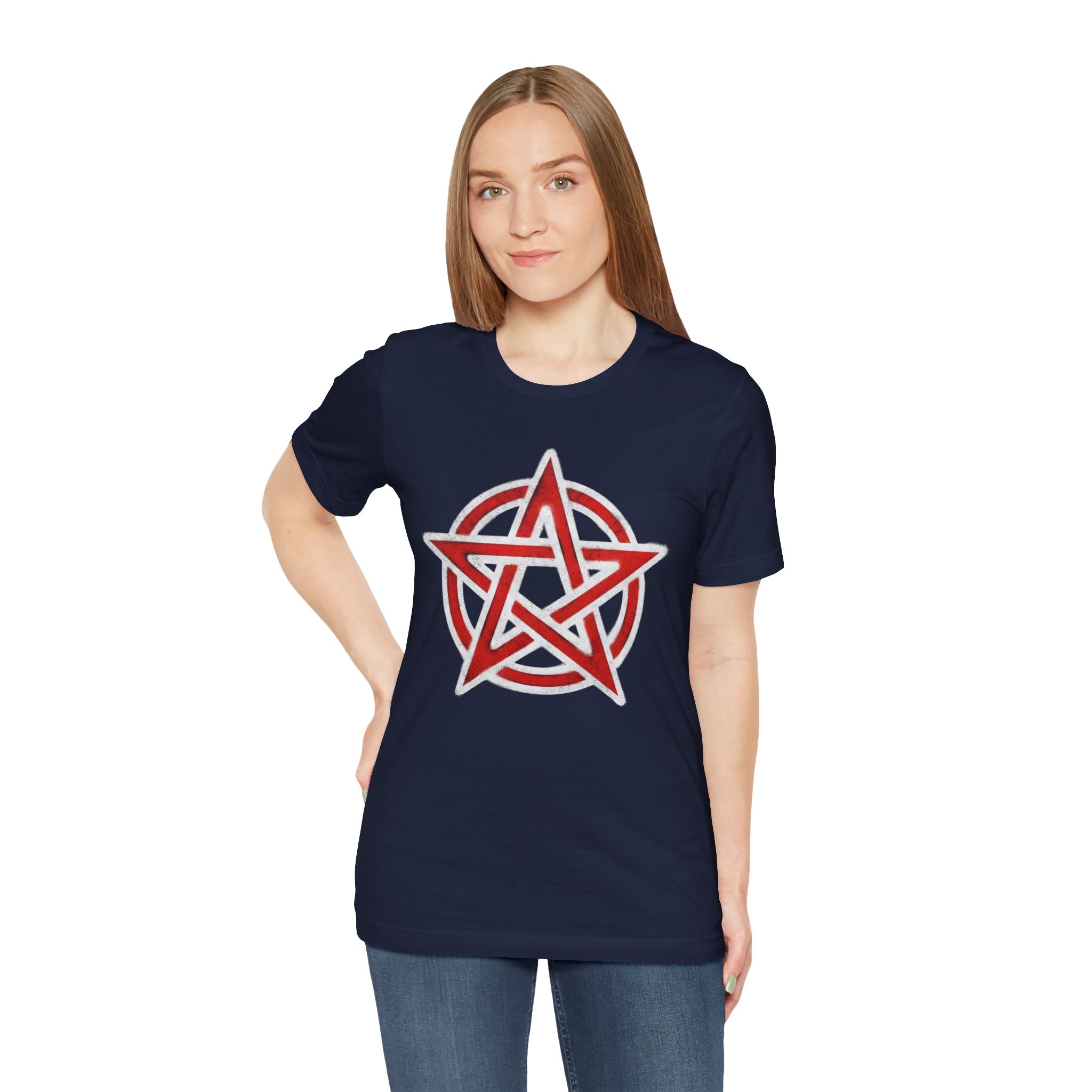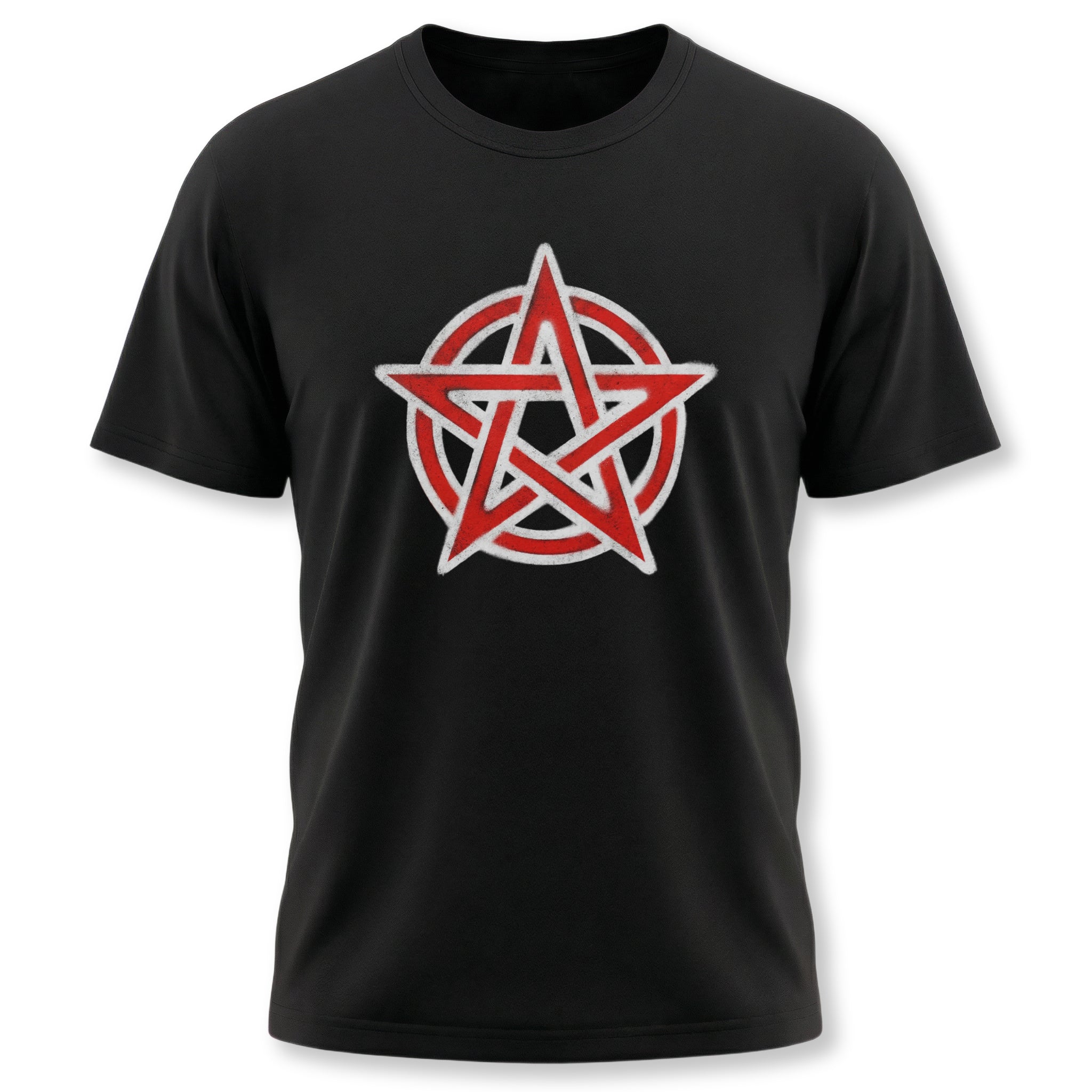 This t-shirt features a striking red pentagram enclosed within a circular border, all highlighted with a textured white outline that gives it a raw, chalky aesthetic. The pentagram, an ancient and powerful symbol, is revered across many spiritual traditions, representing the five elements (Earth, Air, Fire, Water, and Spirit), protection, balance, and spiritual wisdom. This unique graphic is perfect for those who appreciate deep symbolism, alternative aesthetics, or seek to wear a statement of ancient power. Its bold, slightly distressed look makes it an eye-catching and meaningful addition to any wardrobe.