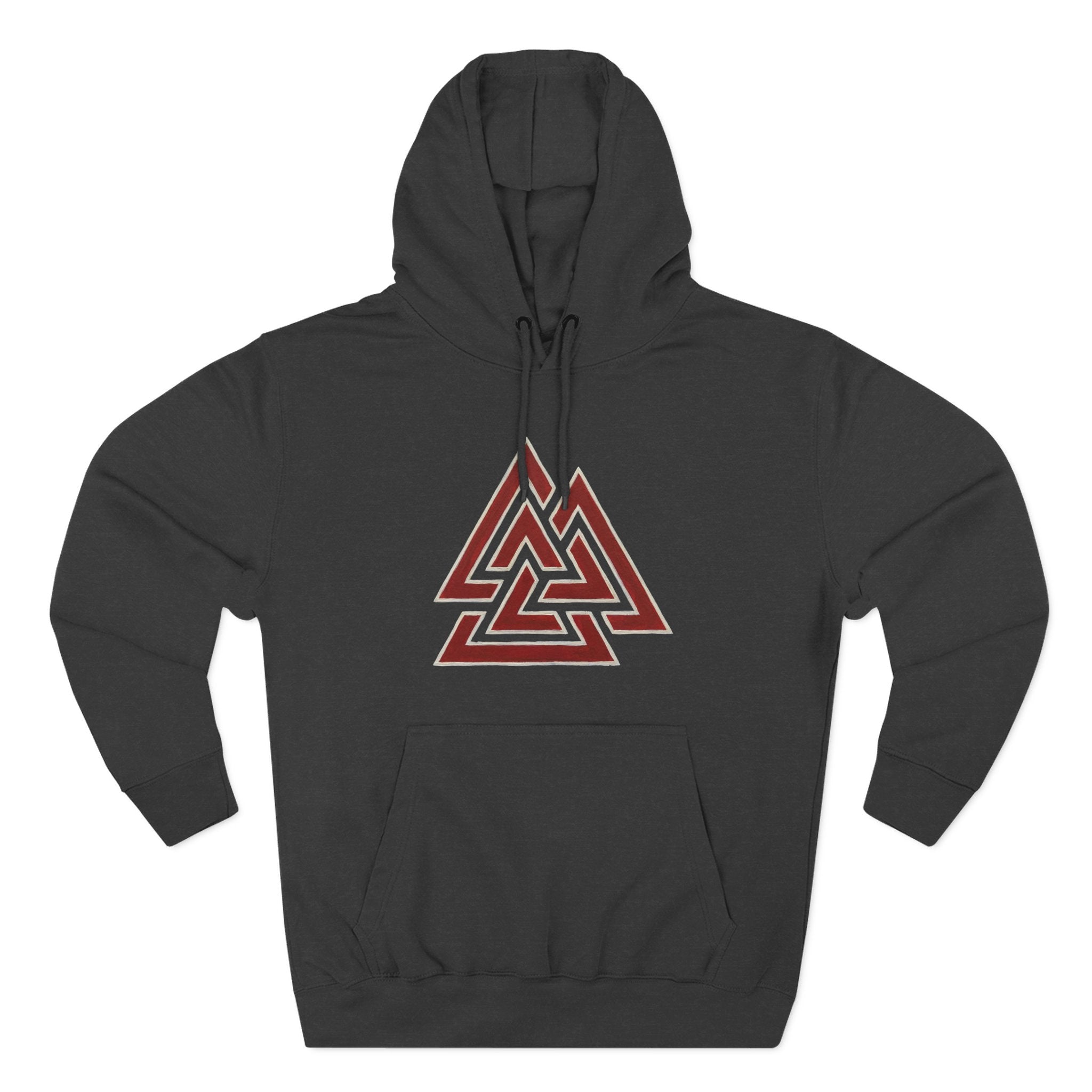 This hoodie features a striking red and off-white Valknut symbol, an ancient Norse emblem formed by three interlocking triangles. Deeply rooted in Norse mythology, the Valknut, derived from Old Norse terms for 'slain warriors' and 'knot,' is primarily associated with Odin, Valhalla, and the journey of fallen warriors. It represents the intricate connection between life, death, and destiny, embodying courage, spiritual rebirth, and Odin's profound power to bind and unbind. This powerful graphic is a profound statement piece, perfect for those who honor Norse heritage, embrace warrior spirit, or appreciate deep symbolic meaning. Its bold design ensures it's an eye-catching addition to any collection.