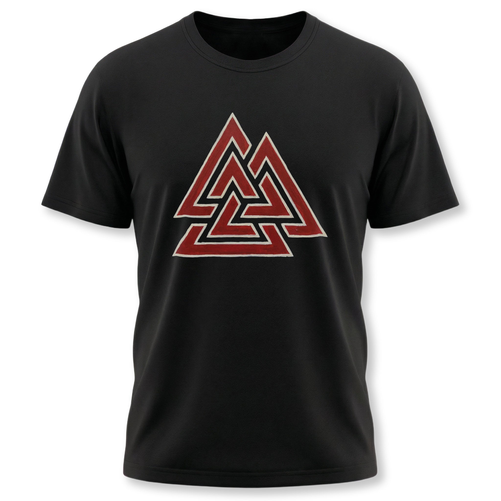 This t-shirt features a striking red graphic of the ancient Valknut symbol, outlined in a subtle lighter tone, creating a distinct and powerful visual. The Valknut, composed of three interlocked triangles, is a profound and enigmatic symbol from Norse mythology. Widely associated with Odin, the god of wisdom, war, and death, it represents interconnectedness, destiny, and the journey of fallen warriors to Valhalla. It evokes themes of courage, fate, and spiritual transition. This unique design is perfect for those who appreciate Viking heritage, profound ancient symbols, and intricate artistry. It's a bold and meaningful statement piece that adds a touch of ancient power to any outfit.