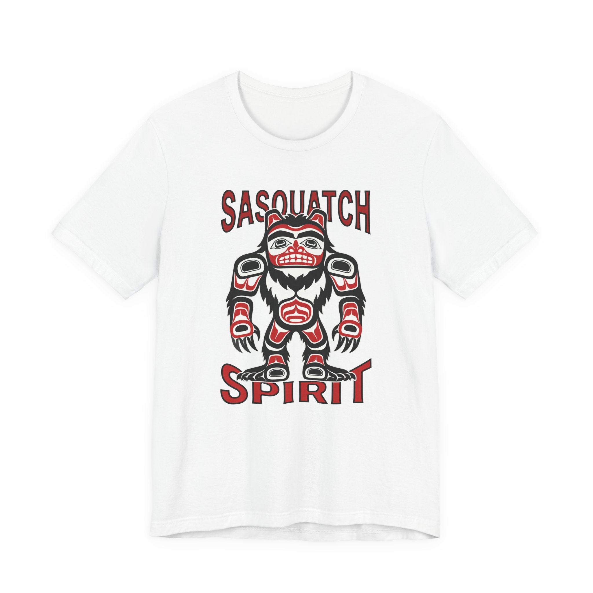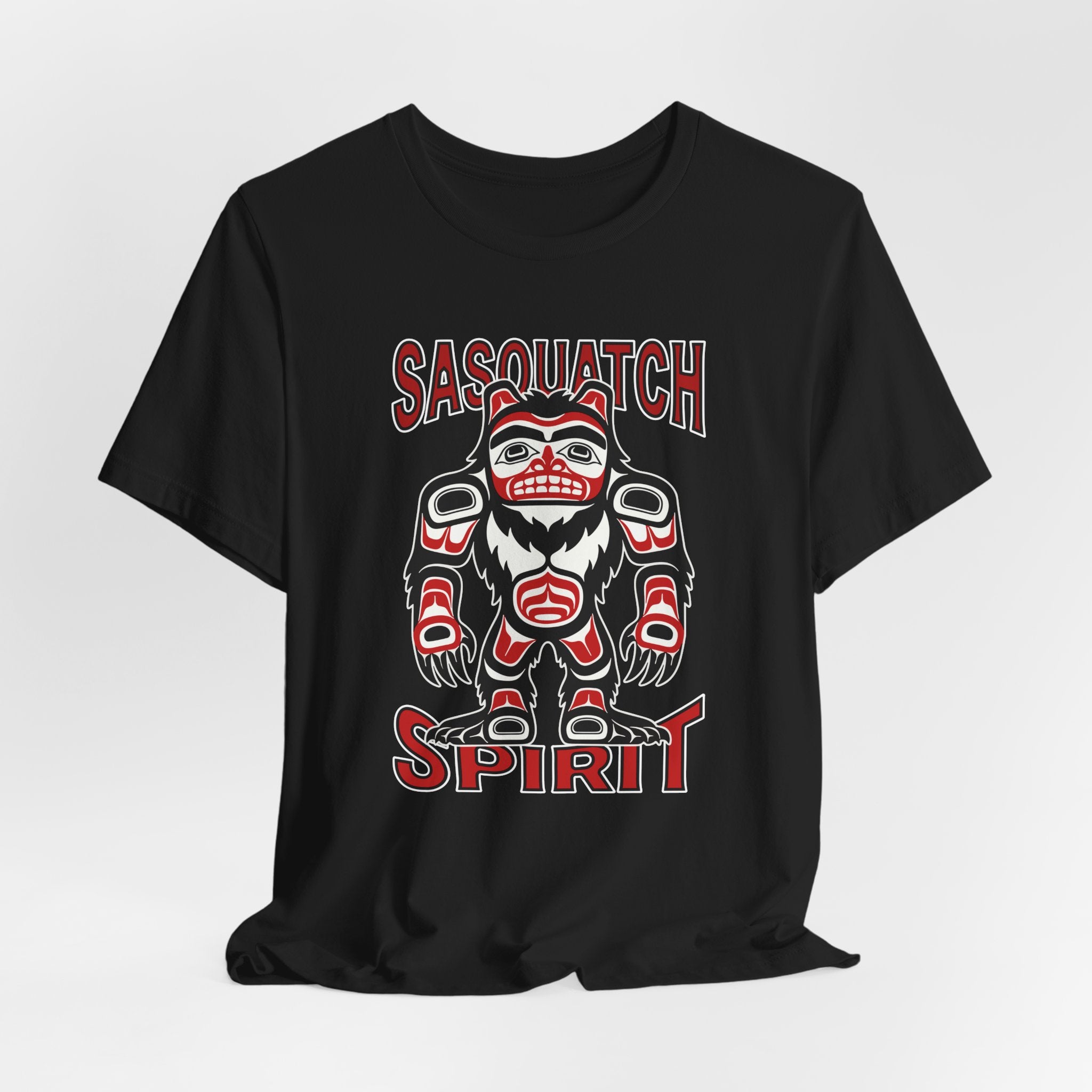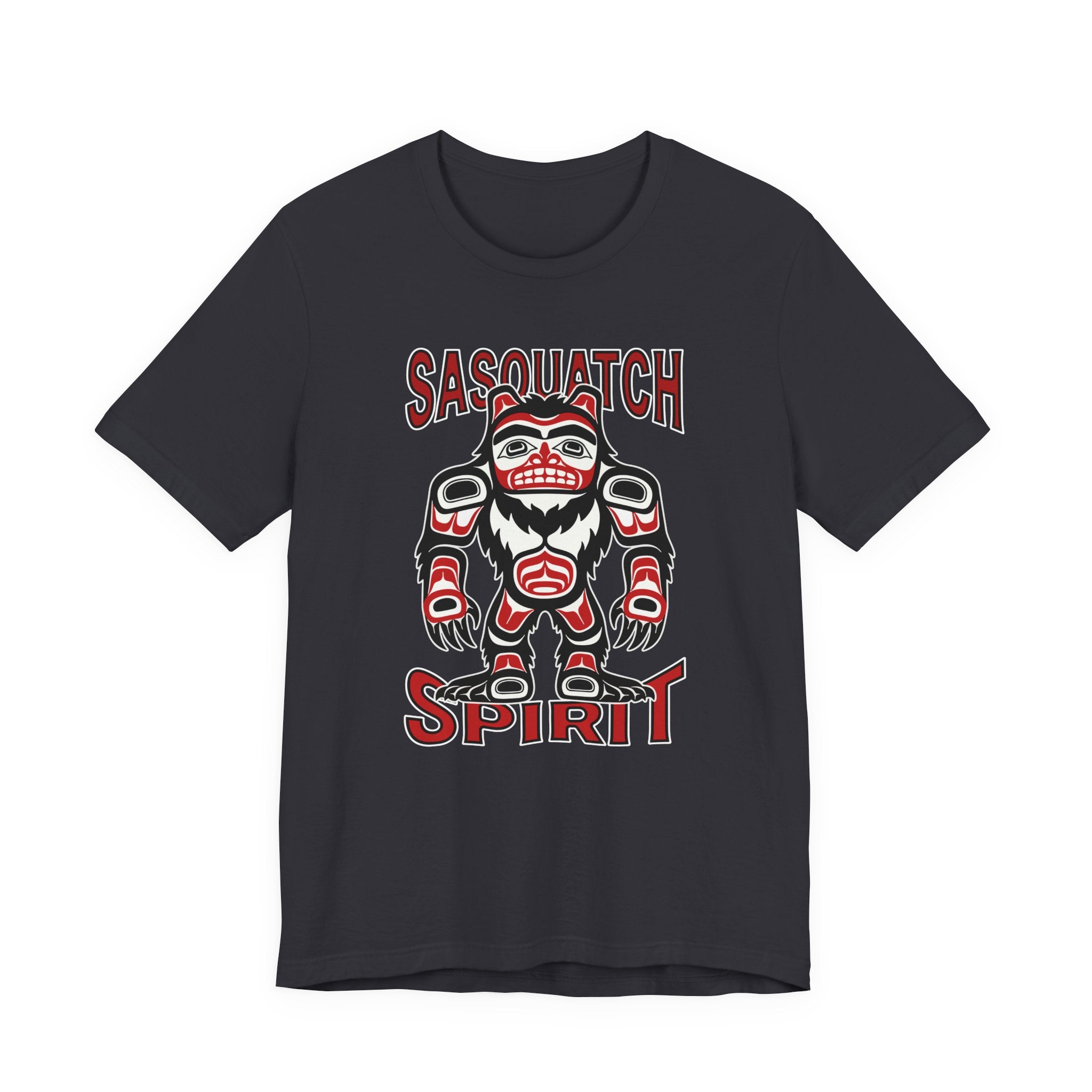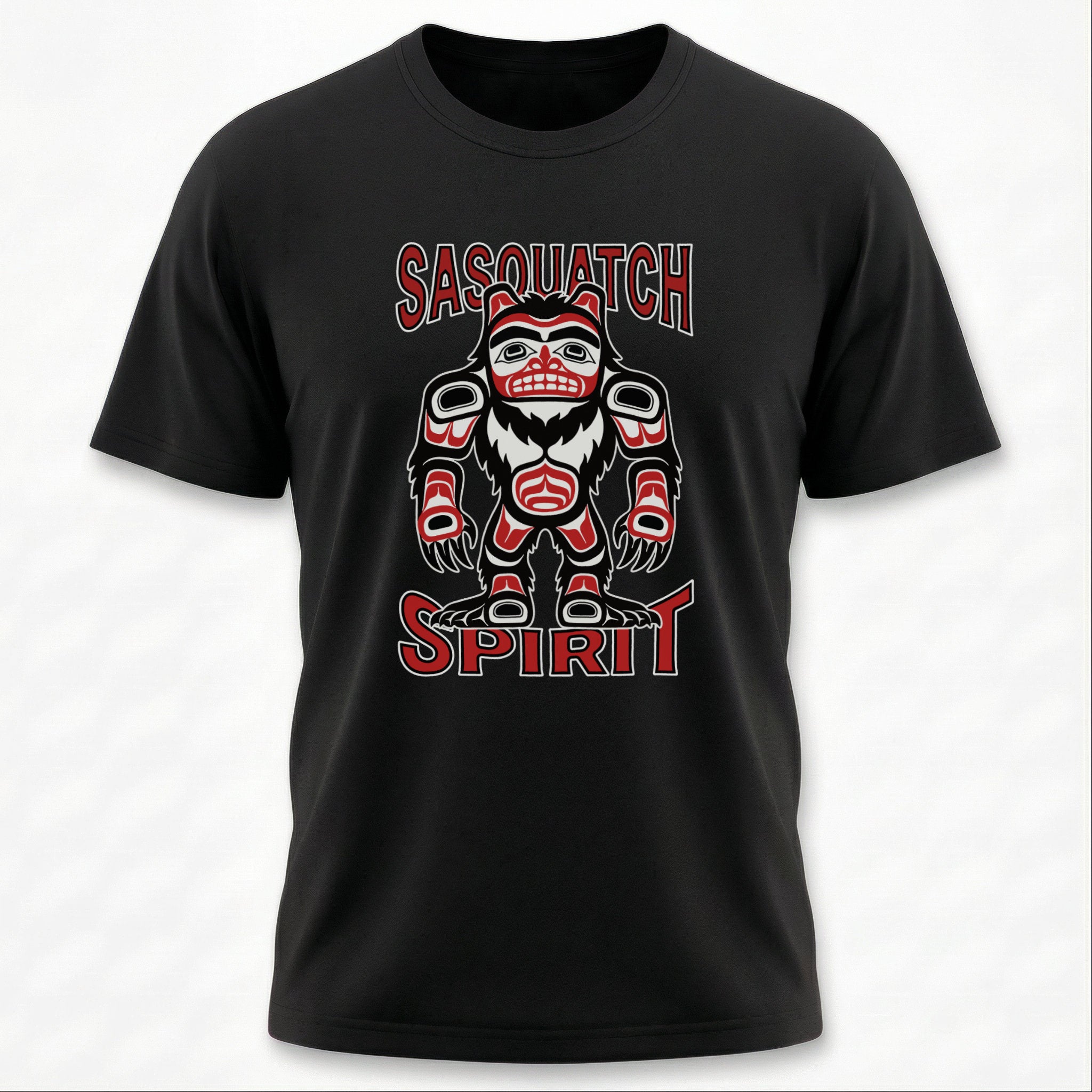 This t-shirt features a striking depiction of Sasquatch, or Bigfoot, rendered in the classic formline style characteristic of Pacific Northwest Coast Indigenous art. The legendary creature symbolizes the wild, the unknown, and a deep connection to untamed nature, presented with the bold lines and iconic shapes of traditional art. The accompanying "SASQUATCH" and "SPIRIT" text reinforces the profound essence of this elusive giant. This unique graphic is a powerful tribute to both enduring folklore and rich cultural artistry, perfect for those who appreciate mystery, indigenous art, and the call of the wilderness.