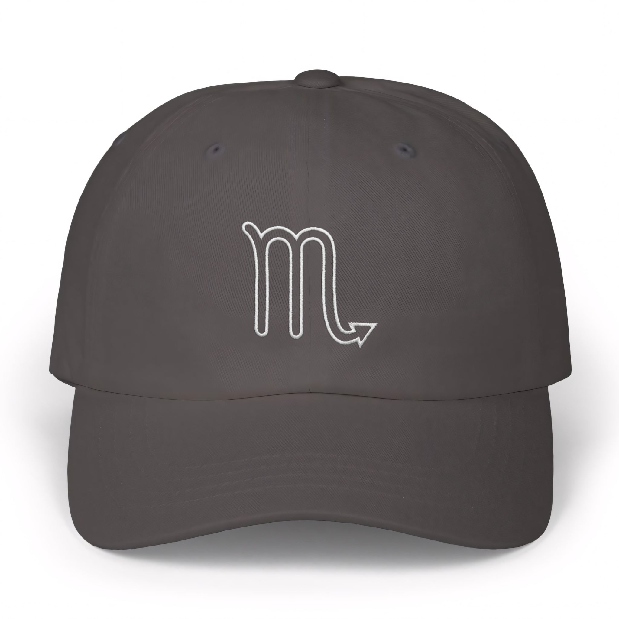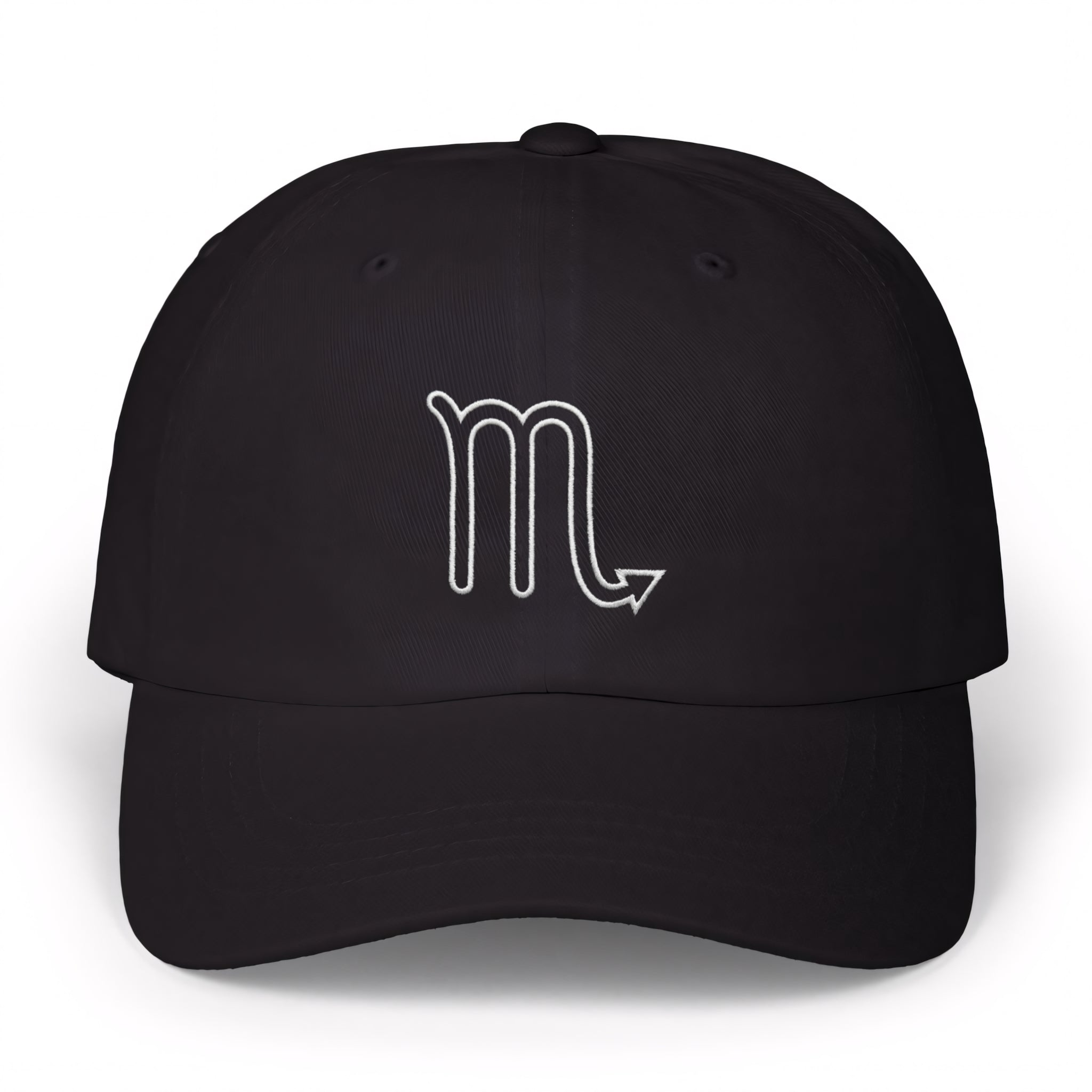 This hat features a crisp white outline of the iconic Scorpio zodiac symbol, elegantly embroidered on a classic black baseball cap. The Scorpio symbol, an 'm' with a distinctive arrow-like tail, represents the intense, passionate, and transformative nature of those born under this powerful water sign. It evokes themes of depth, resilience, and profound intuition. This design is a sophisticated and understated way to showcase your astrological pride, making it a unique statement piece for any wardrobe.