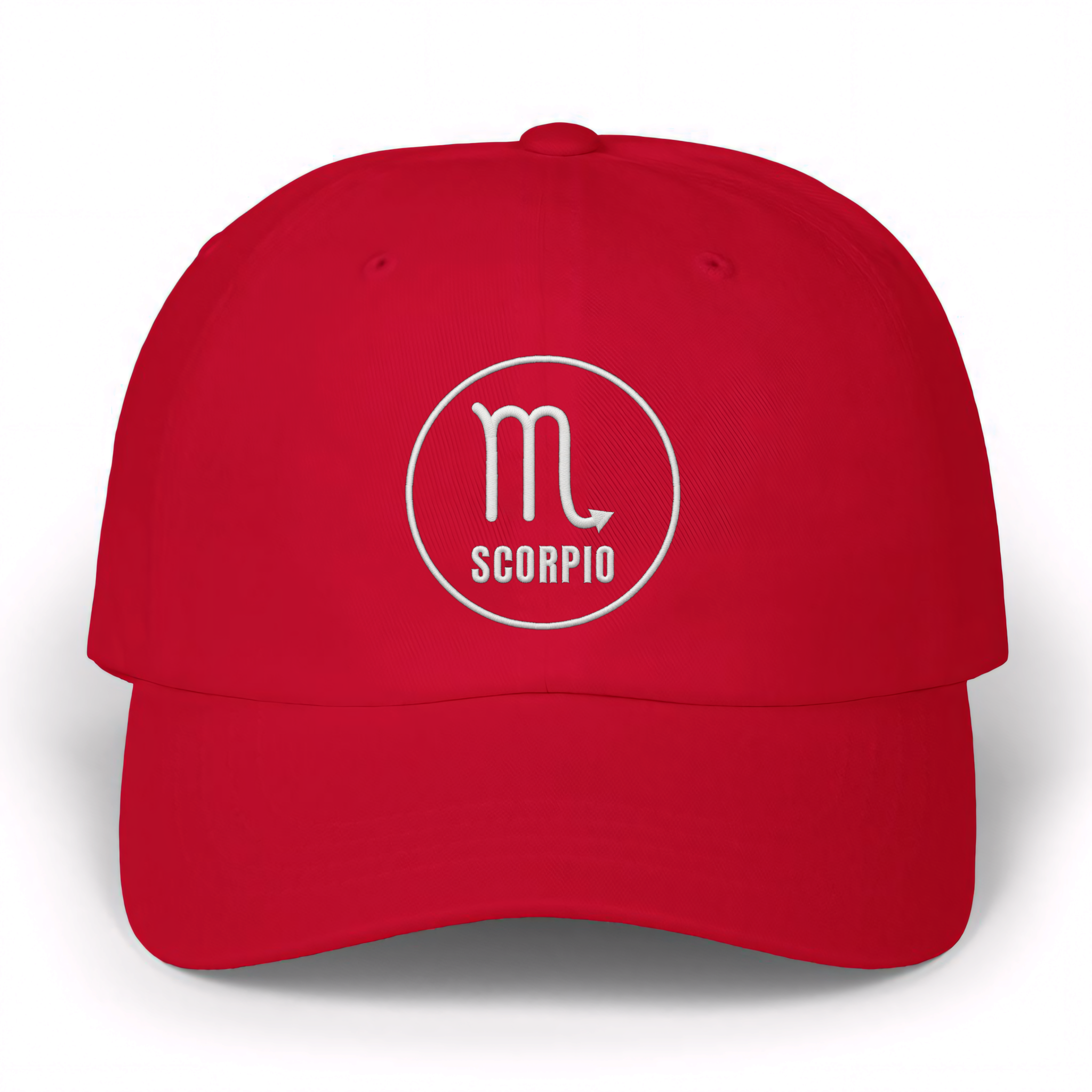 This hat features a crisp white embroidery of the iconic Scorpio zodiac symbol, elegantly encircled, with 'SCORPIO' boldly inscribed beneath it. Scorpio, the eighth astrological sign, represents passion, resilience, intuition, and transformation. Those born under this water sign are known for their fierce loyalty, deep emotional intensity, and magnetic presence. This design is a powerful and personal statement piece for individuals who embody the enigmatic and determined traits of a Scorpio, or for those who appreciate astrological art. It's subtle yet striking, making it a standout accessory for any wardrobe.