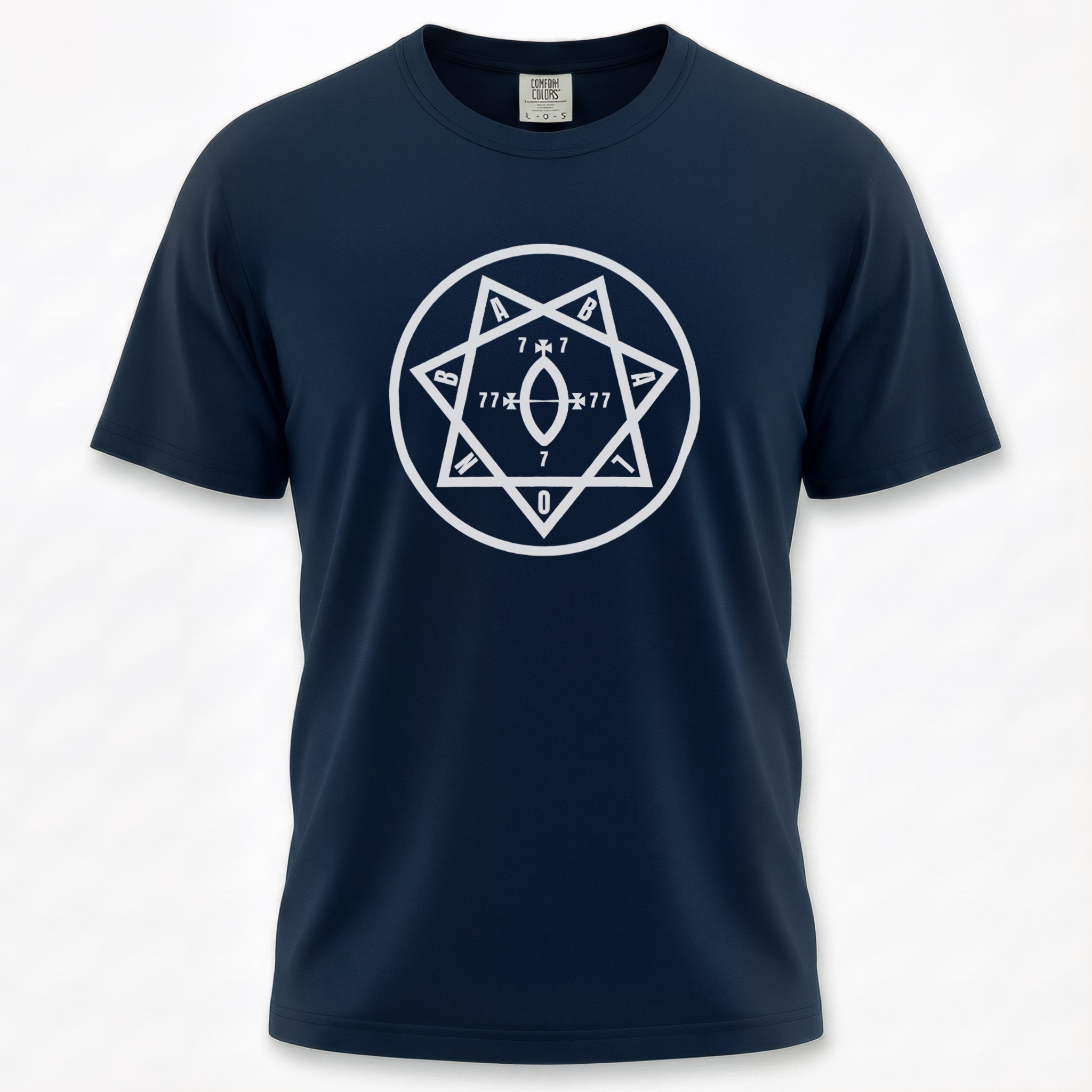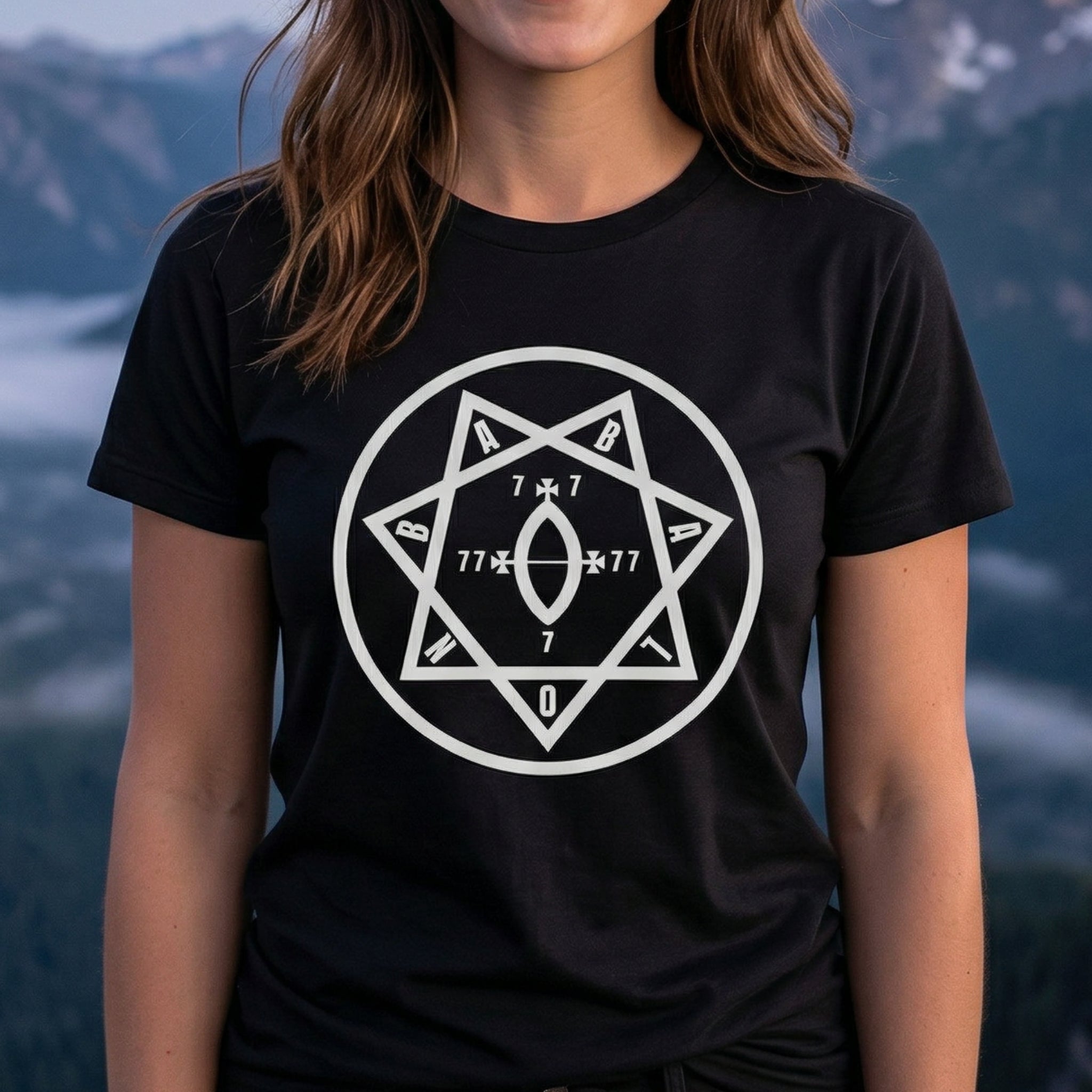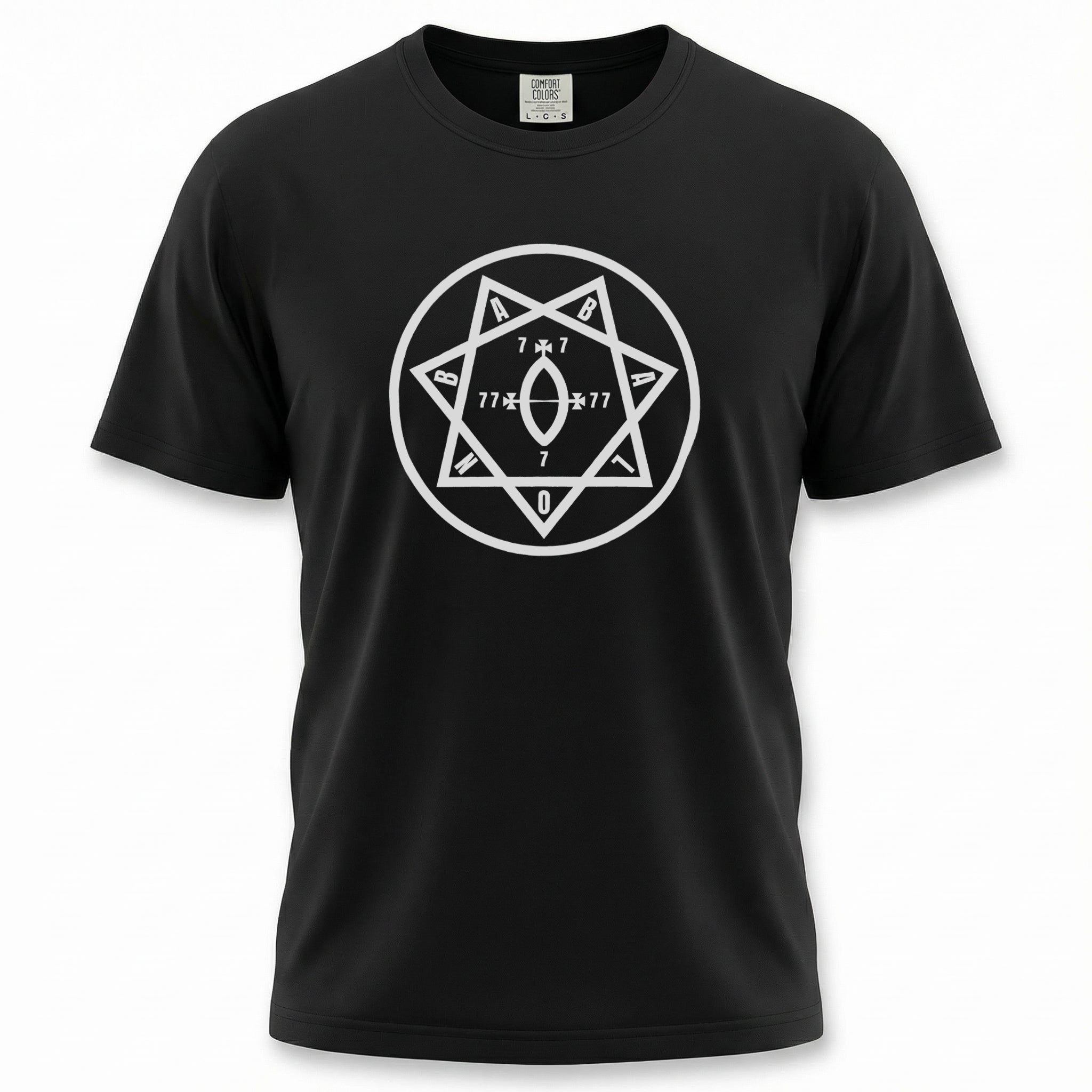 This t-shirt features a captivating white graphic of a seven-pointed star (heptagram) meticulously enclosed within a perfect circle. The design is intricately detailed with numerical sequences "7 x 7", "77", and "7", culminating in a distinct "0" at the bottom point, alongside the letters "A" and "B" positioned at key vertices. The heptagram is a powerful symbol in various esoteric traditions, often representing mystical enlightenment, divine harmony, or the seven classical planets. The prominent numbers 7 and 77 hold deep significance in numerology and occult contexts, frequently linked to spiritual completeness, cosmic law, and profound wisdom, while the "0" suggests infinite potential or the void from which creation emerges. This intriguing design is a conversation starter for those drawn to mystery, ancient wisdom, and the hidden currents of existence.