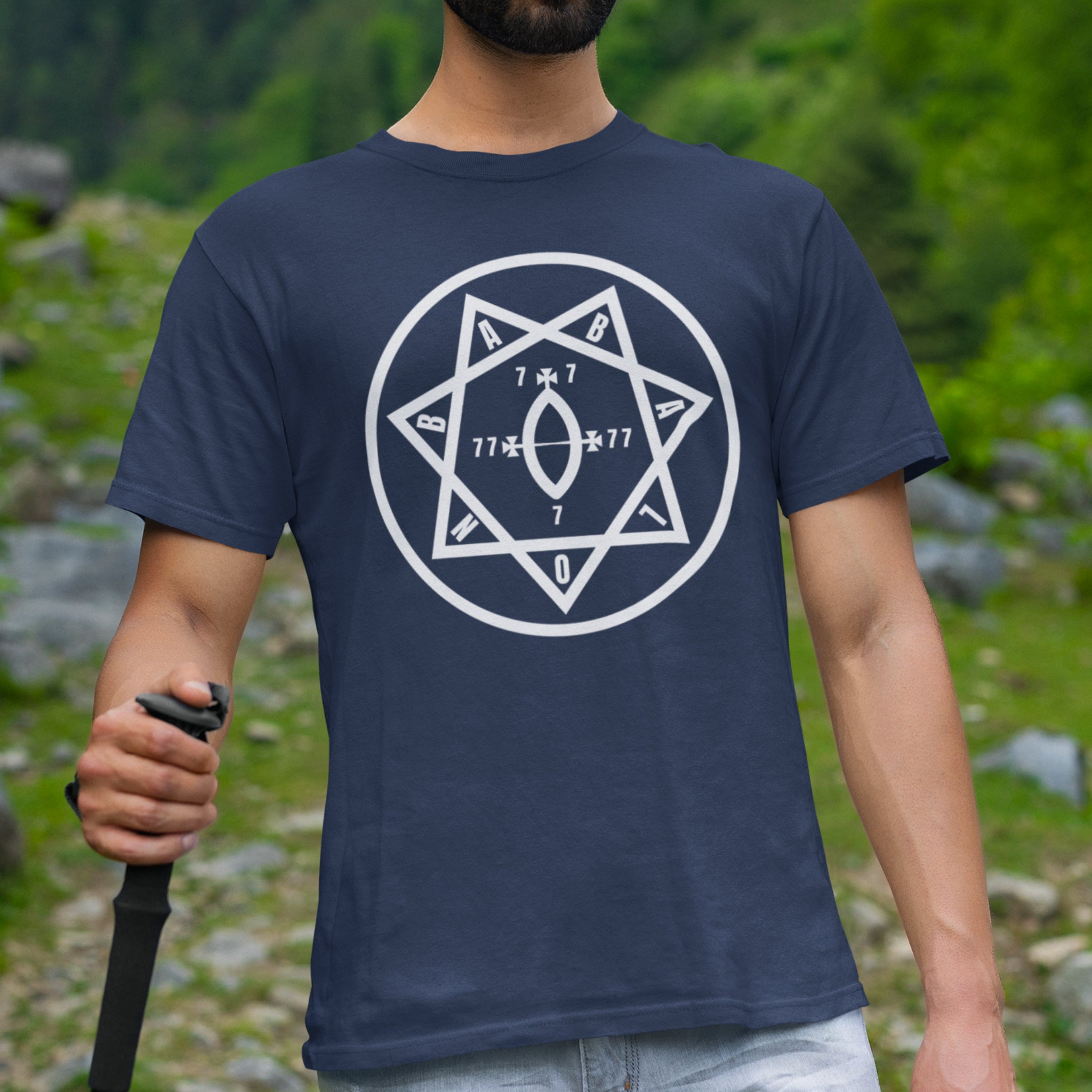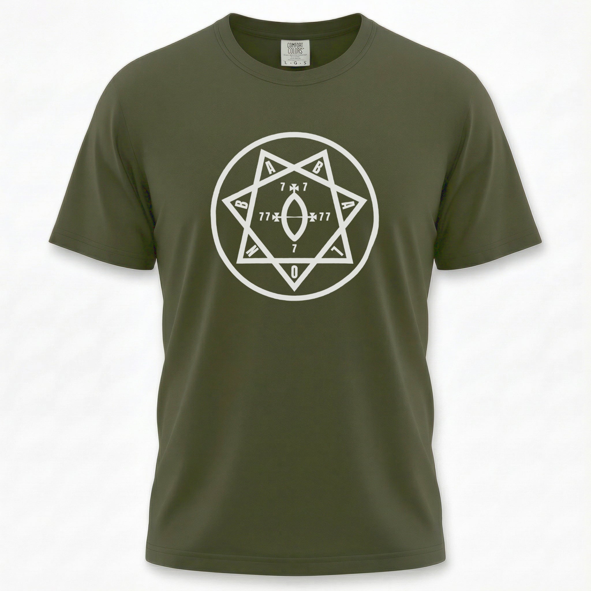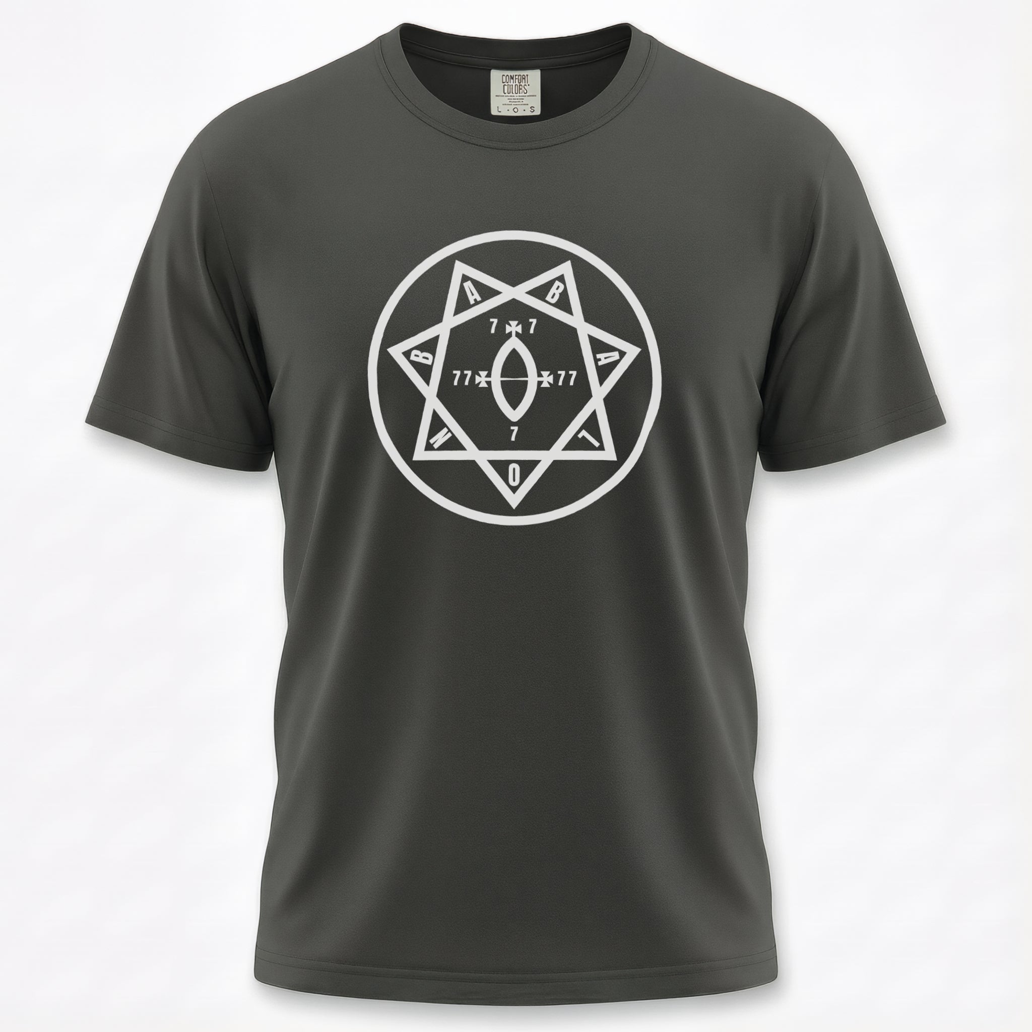 This t-shirt features a captivating white graphic of a seven-pointed star (heptagram) meticulously enclosed within a perfect circle. The design is intricately detailed with numerical sequences "7 x 7", "77", and "7", culminating in a distinct "0" at the bottom point, alongside the letters "A" and "B" positioned at key vertices. The heptagram is a powerful symbol in various esoteric traditions, often representing mystical enlightenment, divine harmony, or the seven classical planets. The prominent numbers 7 and 77 hold deep significance in numerology and occult contexts, frequently linked to spiritual completeness, cosmic law, and profound wisdom, while the "0" suggests infinite potential or the void from which creation emerges. This intriguing design is a conversation starter for those drawn to mystery, ancient wisdom, and the hidden currents of existence.