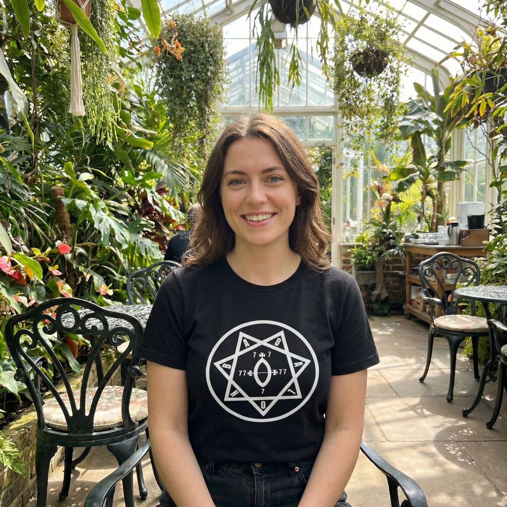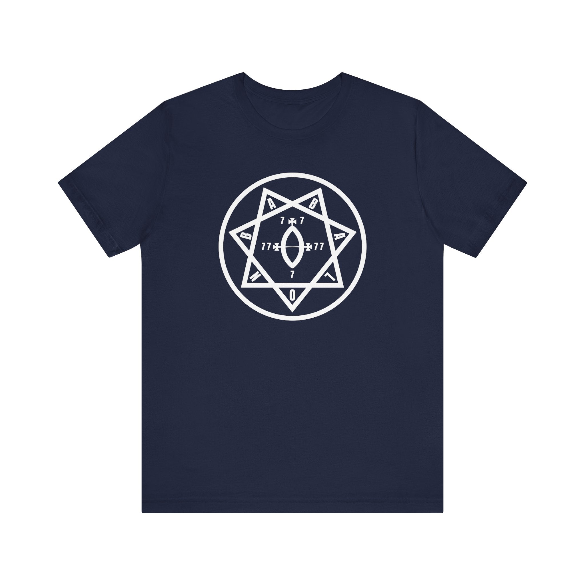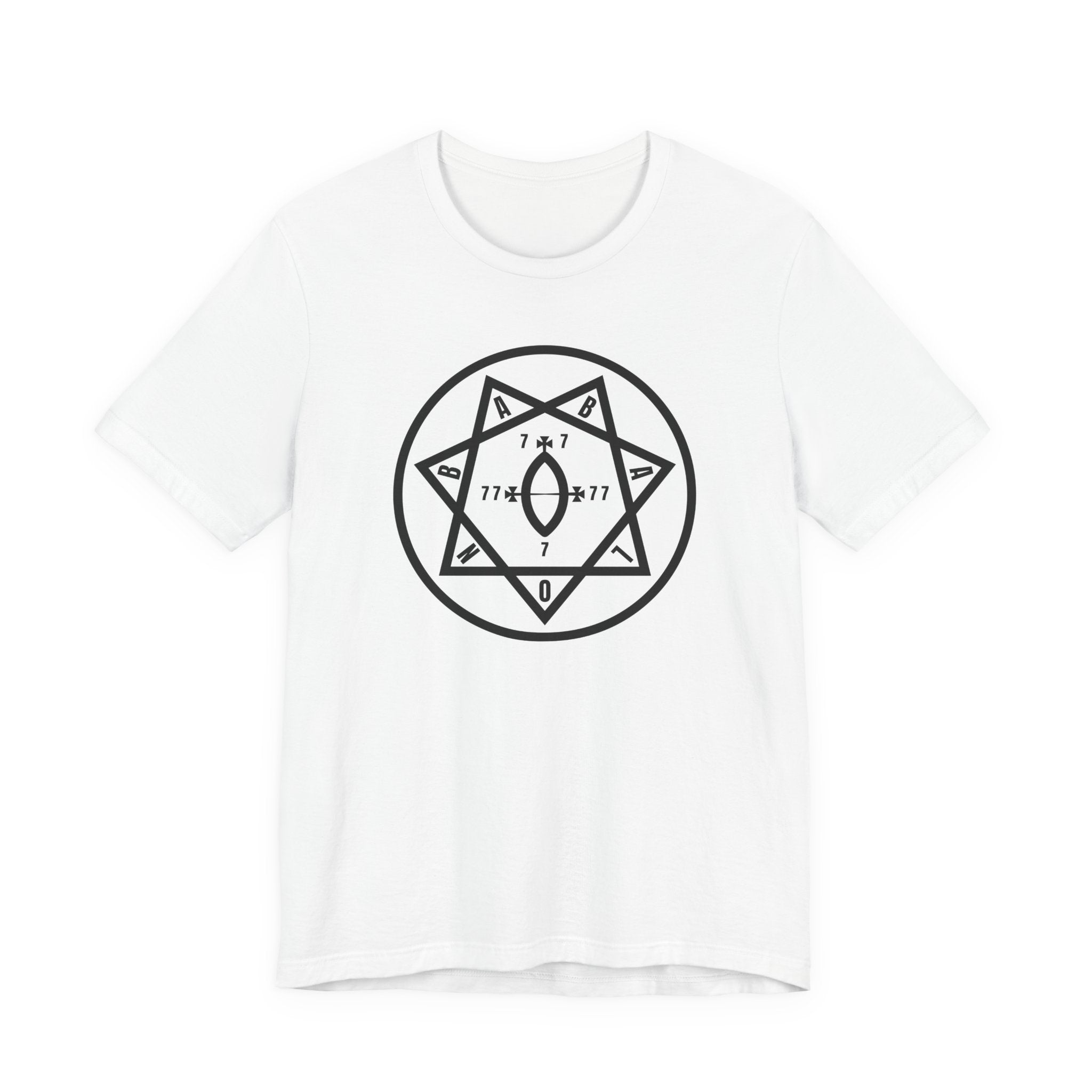 This t-shirt features a striking white graphic centered on a black background, showcasing the profound Occult Star of Babalon. The design intricately displays a seven-pointed star (heptagram) encircled, with each point bearing a letter that spells "BABALON." Within the star's heart lies a Vesica Piscis or Yoni symbol, flanked by the mystical numbers "77" and "7x7," with a "0" at the base. This powerful symbol, central to Thelemic mysticism, represents the Divine Feminine, the Great Mother, and the energies of creation and revelation. The design's intricate details and symbolic depth make it a captivating piece for those drawn to spiritual exploration, occult wisdom, and unique artistic expression.