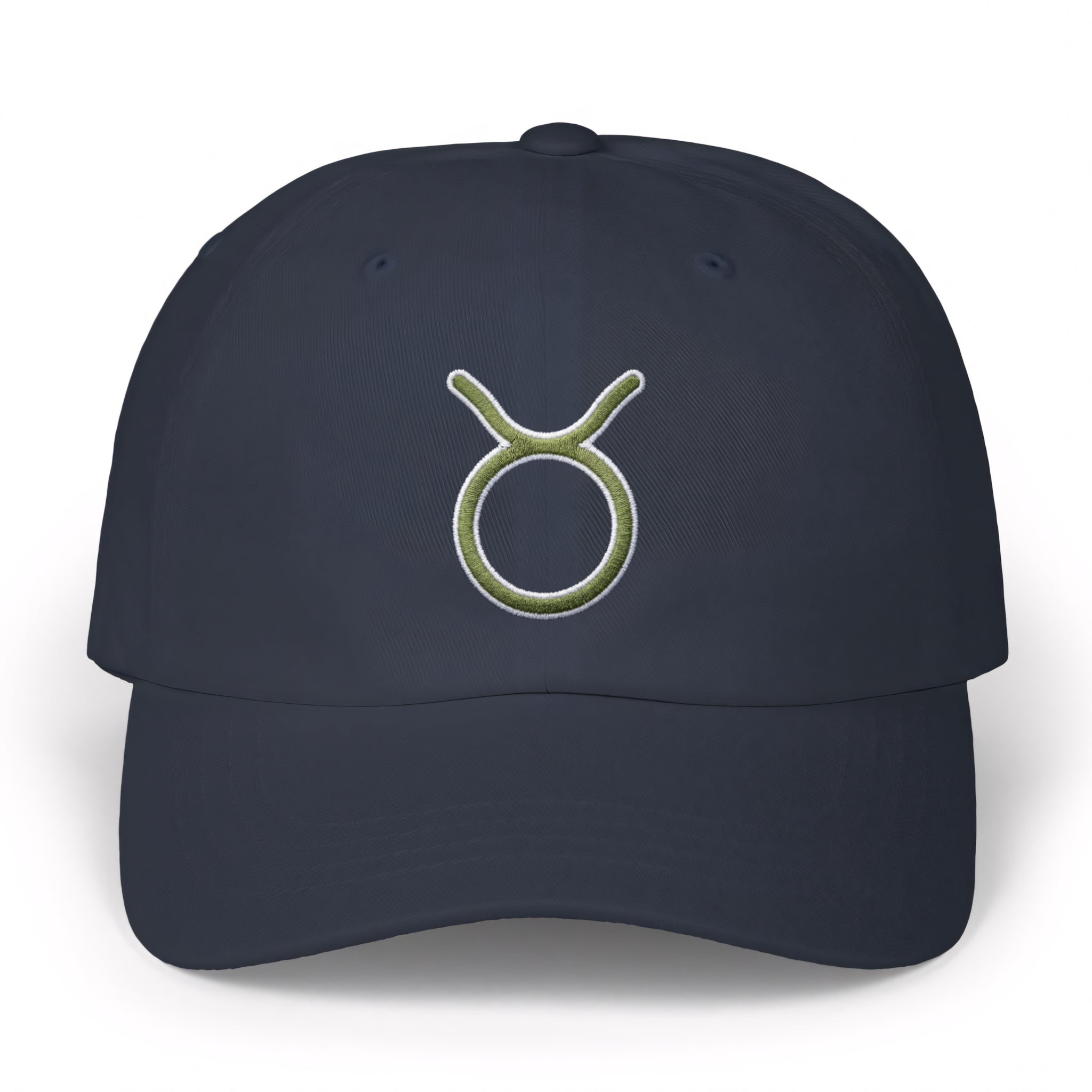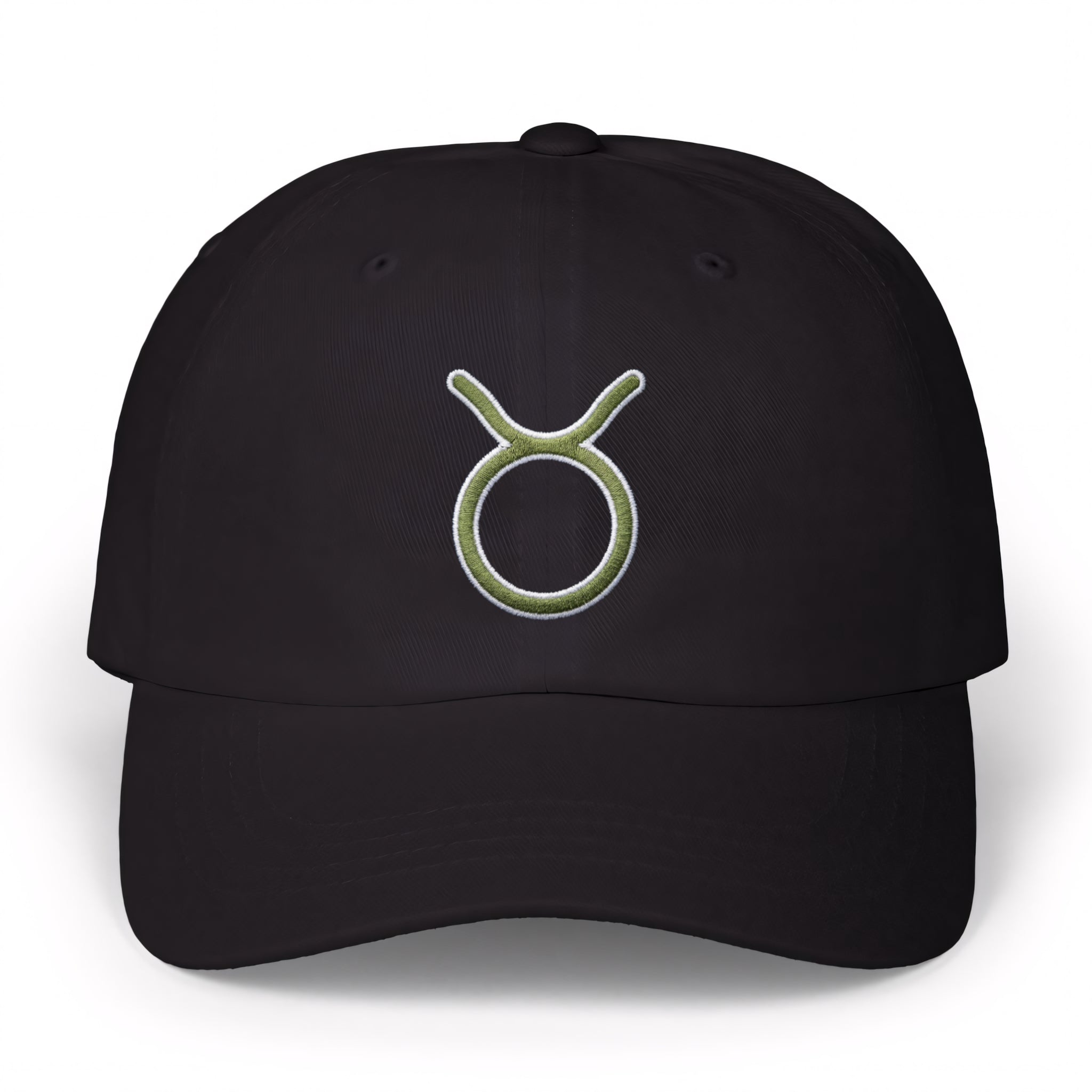 This hat features the classic Taurus zodiac symbol, elegantly embroidered in a vibrant light green with a crisp white outline on a black cap. The Taurus symbol, represented by the bull's head and horns, embodies strength, reliability, and a deep connection to the material world and nature. Ruled by Venus, it also signifies an appreciation for beauty, comfort, and unwavering determination. This design is a subtle yet powerful statement piece for those born under the sign of Taurus or anyone who resonates with its grounded and resilient energy. Its clean and sophisticated aesthetic makes it a standout accessory for any wardrobe.
