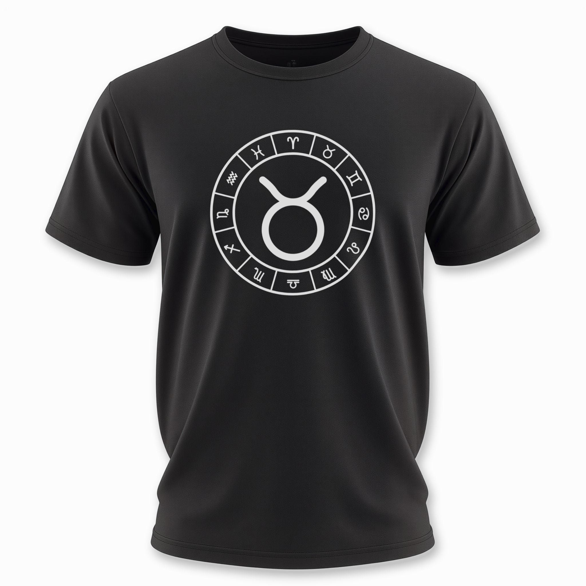 This t-shirt features a striking white graphic of the Taurus zodiac symbol prominently displayed in the center of a cosmic wheel, encircled by all twelve astrological signs. Taurus, an earth sign representing those born between April 20th and May 20th, symbolizes stability, patience, determination, and a deep appreciation for beauty and comfort. This unique design not only celebrates the powerful essence of Taurus but also beautifully represents the interconnectedness of the entire zodiac. It's a bold and meaningful statement piece for anyone proud of their astrological identity or fascinated by cosmic symbolism.