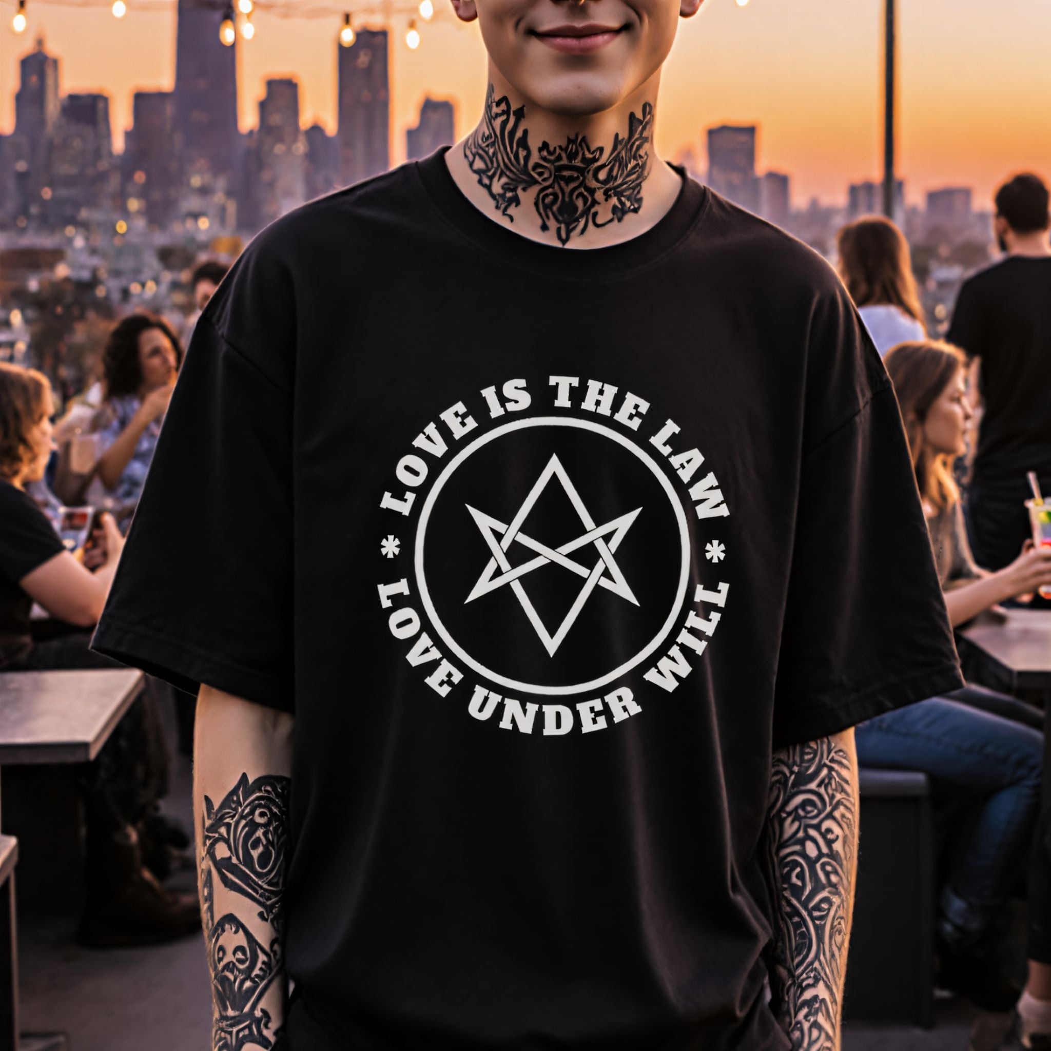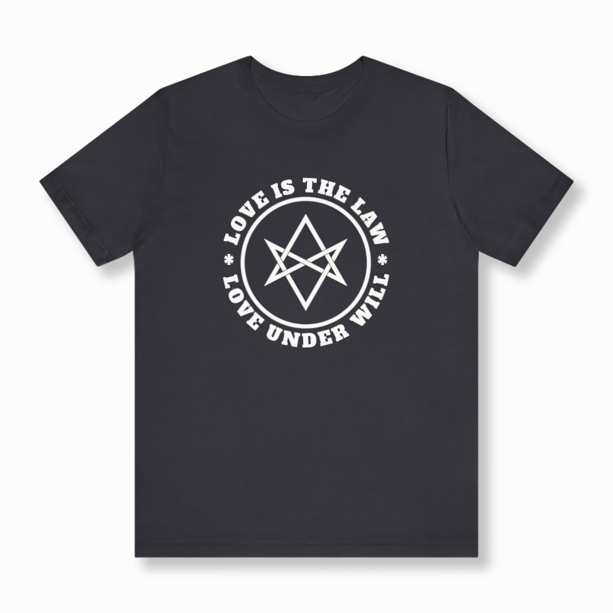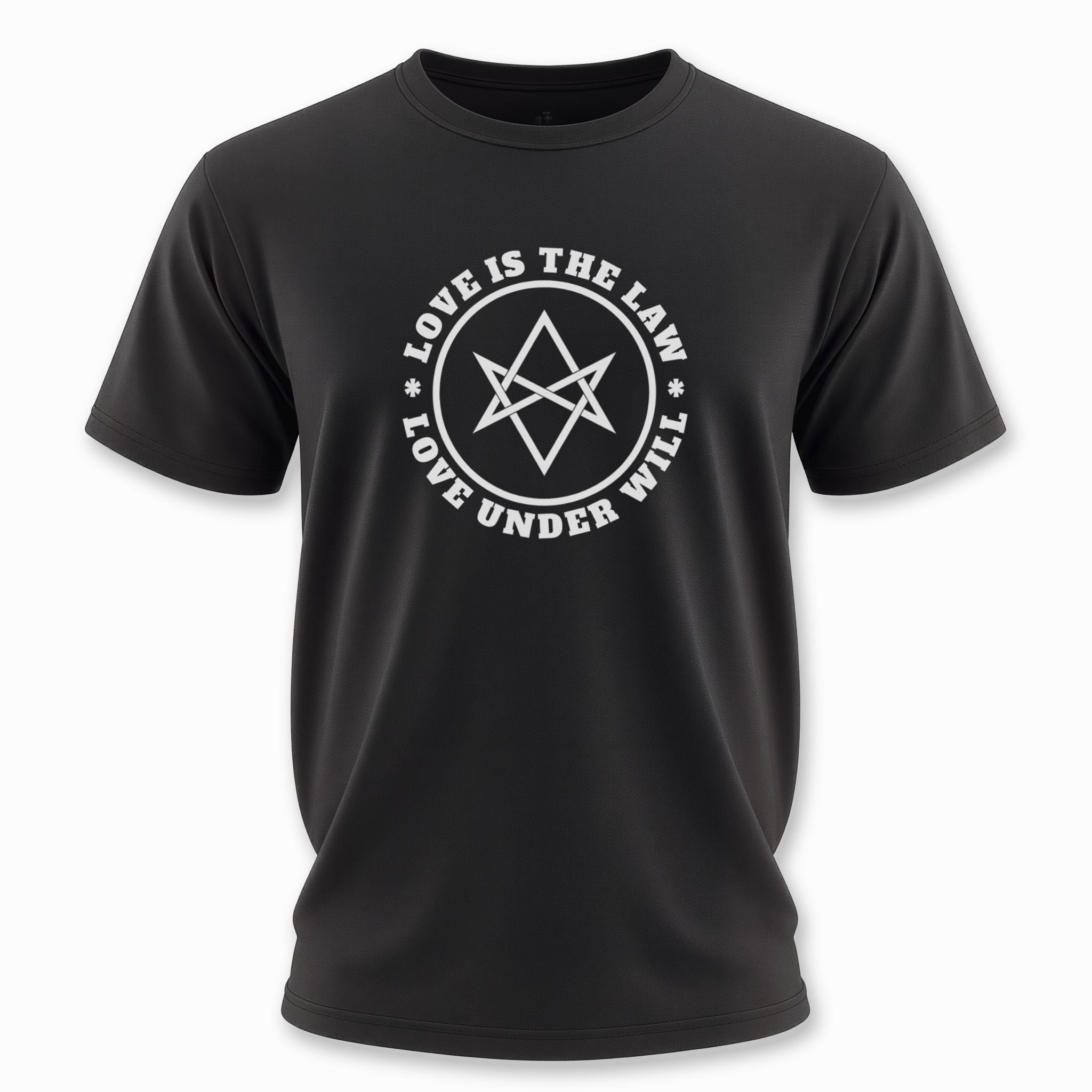 Thelema Love Under Will Text and Graphic T-Shirt | Unicursal Hexagram Tee V4