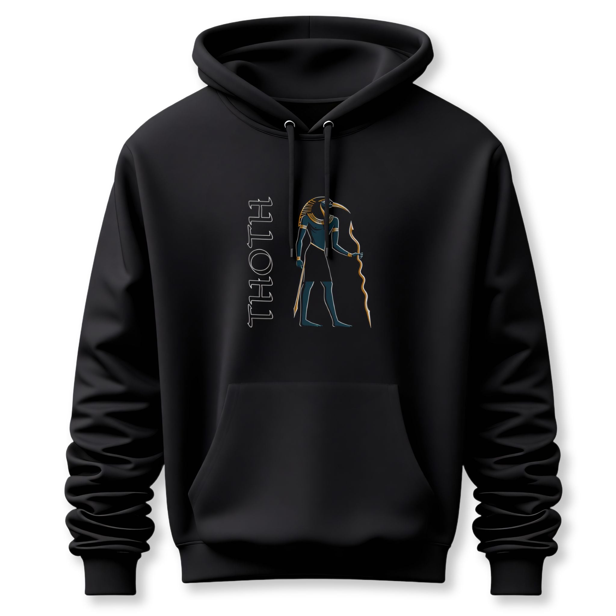 This hoodie features a captivating graphic of Thoth, the revered ancient Egyptian god of wisdom, knowledge, and writing, depicted with his iconic ibis head and regal headdress. Standing beside his name, Thoth embodies intellect, divine order, and the power of communication. This unique design is a profound tribute to ancient Egyptian culture and spiritual symbolism, making it a standout piece for any wardrobe.