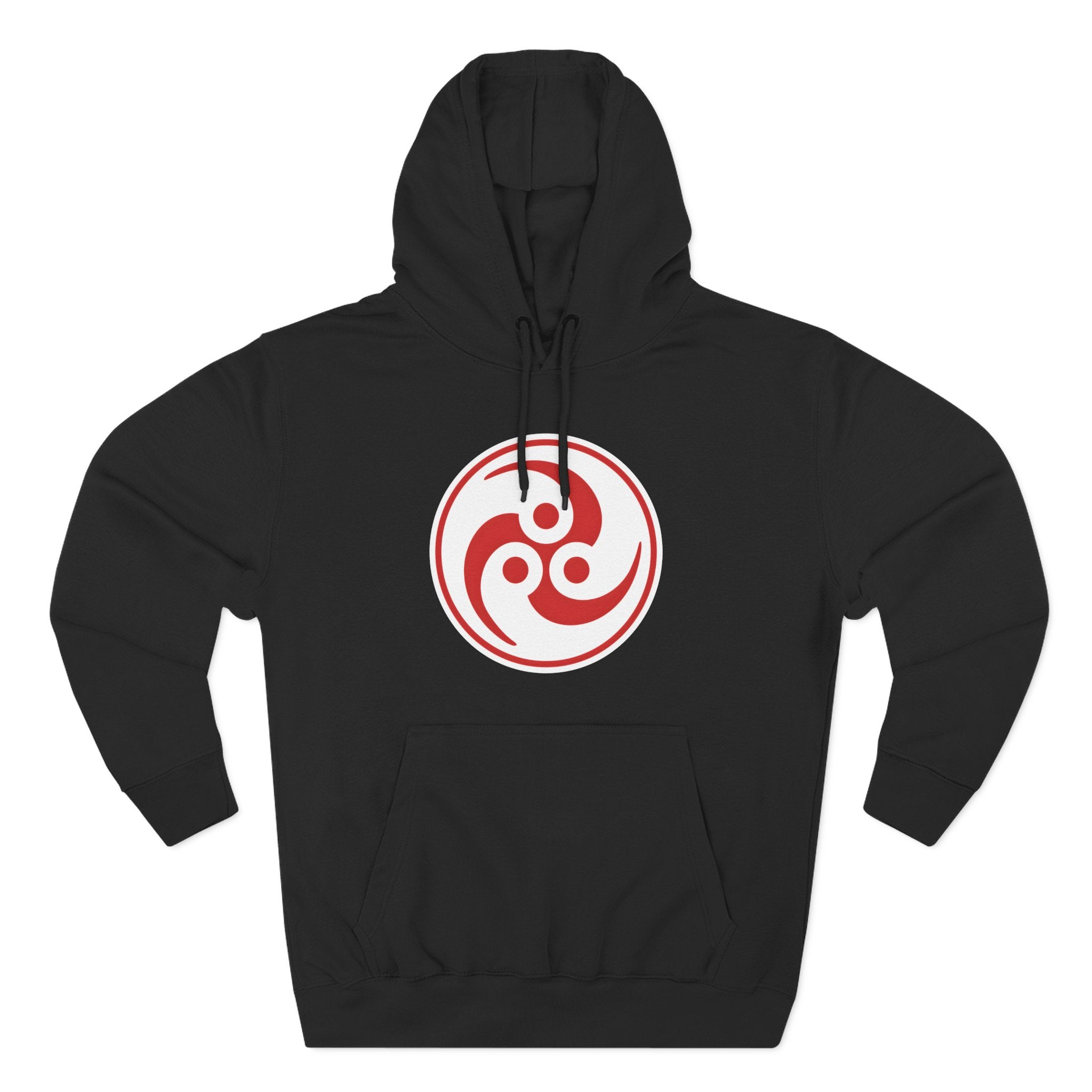 This hoodie features a striking red and white Mitsudomoe symbol, a dynamic graphic composed of three swirling, comma-like shapes enclosed within a bold red circular outline. The Mitsudomoe is a traditional Japanese symbol often associated with Shinto shrines and deities, representing the interplay of forces, the cycle of life, or the three worlds (heaven, earth, and underworld). Its spiraling form evokes continuous motion, energy, and harmony. This ancient and powerful graphic offers a blend of cultural depth and captivating aesthetics, making it a unique and meaningful statement piece for those who appreciate Eastern symbolism and timeless design.