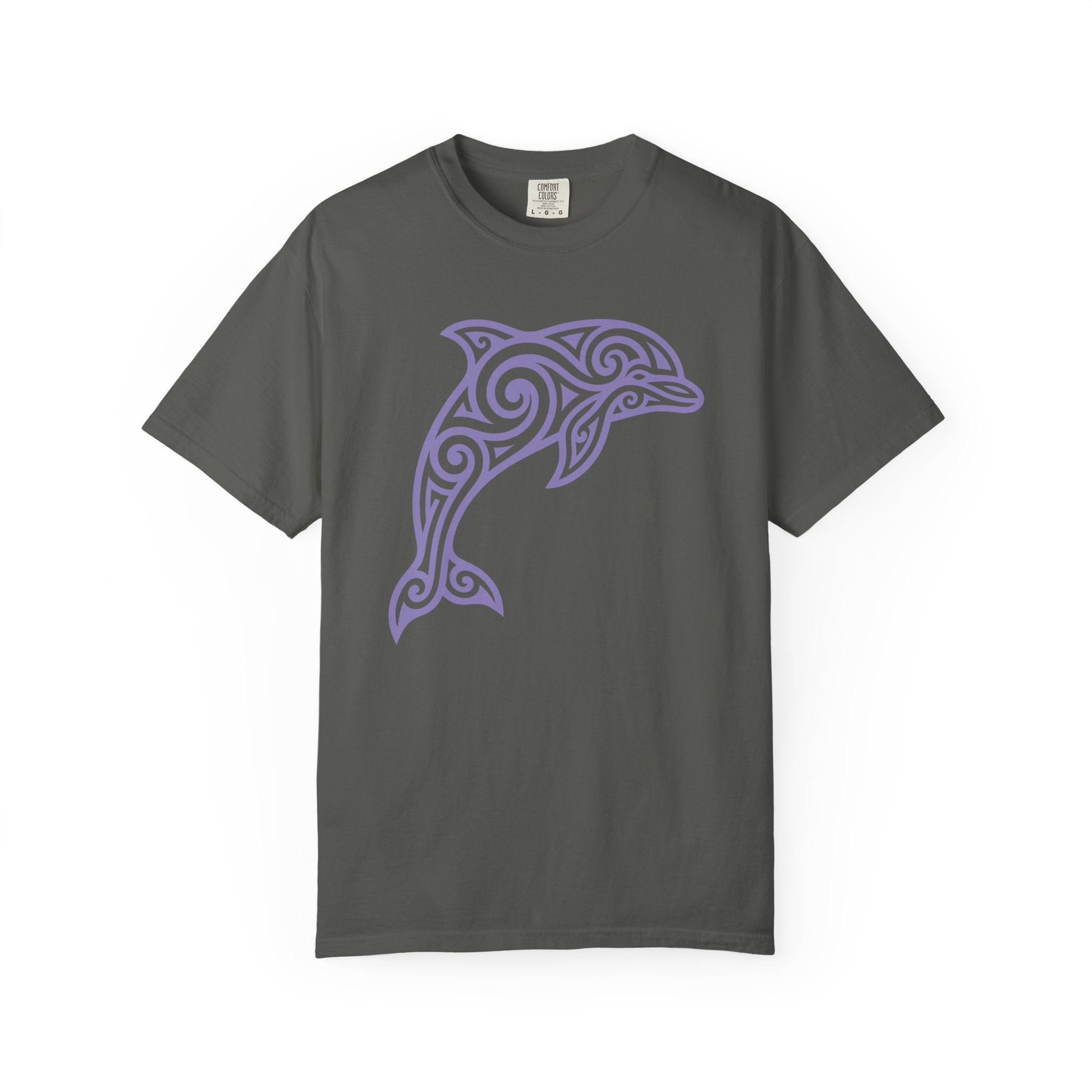 This t-shirt showcases an intricately designed dolphin graphic, rendered in a mesmerizing swirling tribal pattern. Dolphins symbolize grace, intelligence, freedom, and harmony, often regarded as guides and protectors of the sea. The elegant, interconnected swirls and curves in the design evoke ancient artistry, reflecting the fluid movement of the ocean and the dolphin's mystical connection to its depths. This unique graphic is perfect for ocean lovers, those who appreciate intricate art, and seekers of meaningful symbols. Its detailed artistry makes it a captivating and stylish addition to any wardrobe.