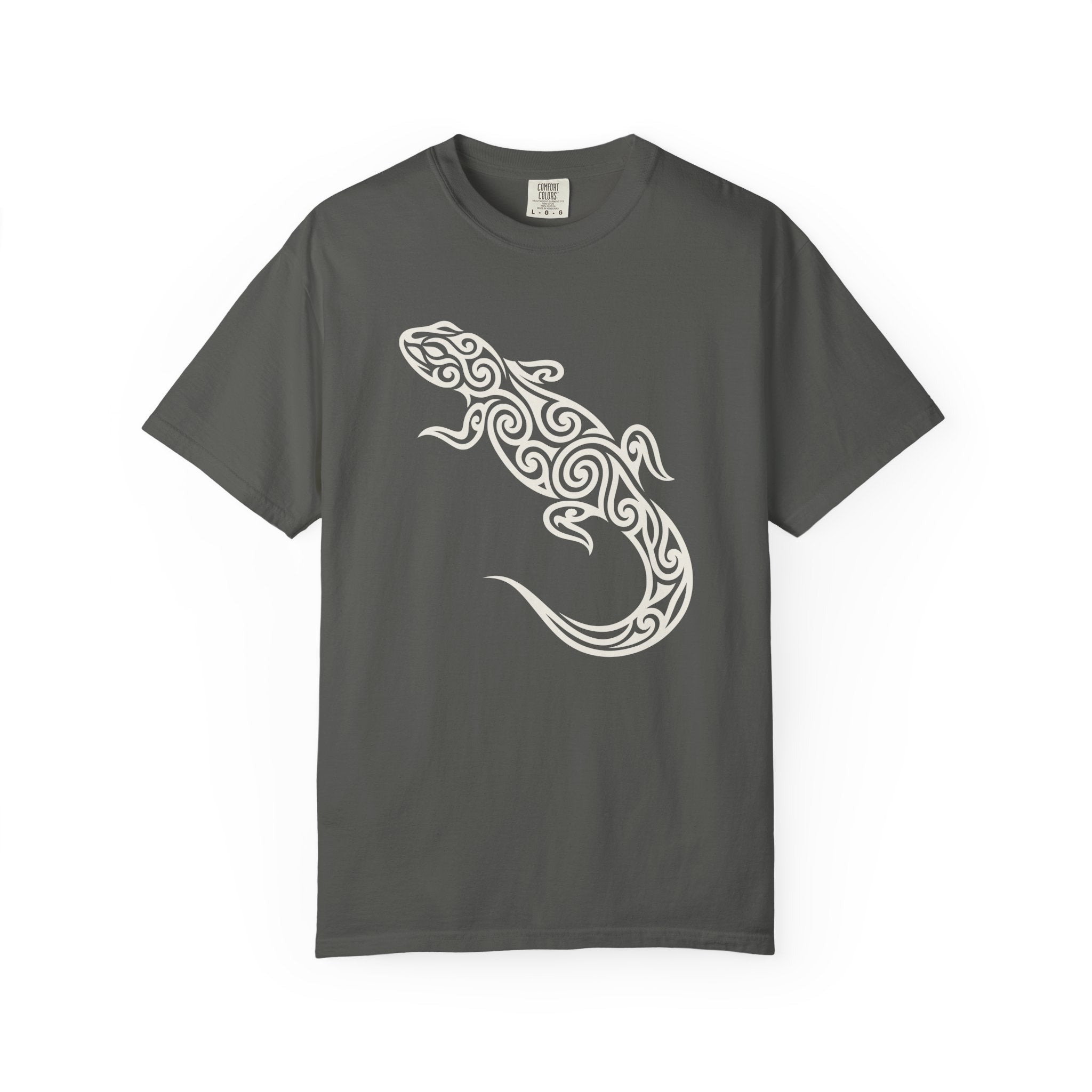 This t-shirt features an intricately designed lizard graphic, brought to life with mesmerizing swirling patterns in a tribal art style. The lizard, a symbol of adaptability, regeneration, and ancient wisdom across many cultures, is depicted with patterns reminiscent of traditional Polynesian artistry. This unique graphic is perfect for those who appreciate cultural symbolism, intricate details, and the mystique of nature. Its striking design makes it a standout piece for any wardrobe, inviting conversation and admiration.