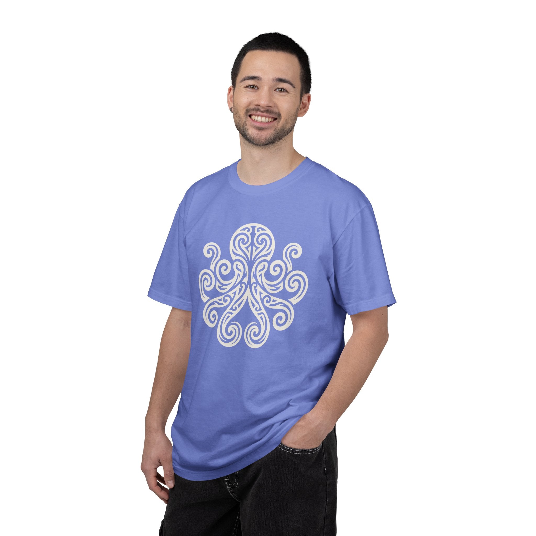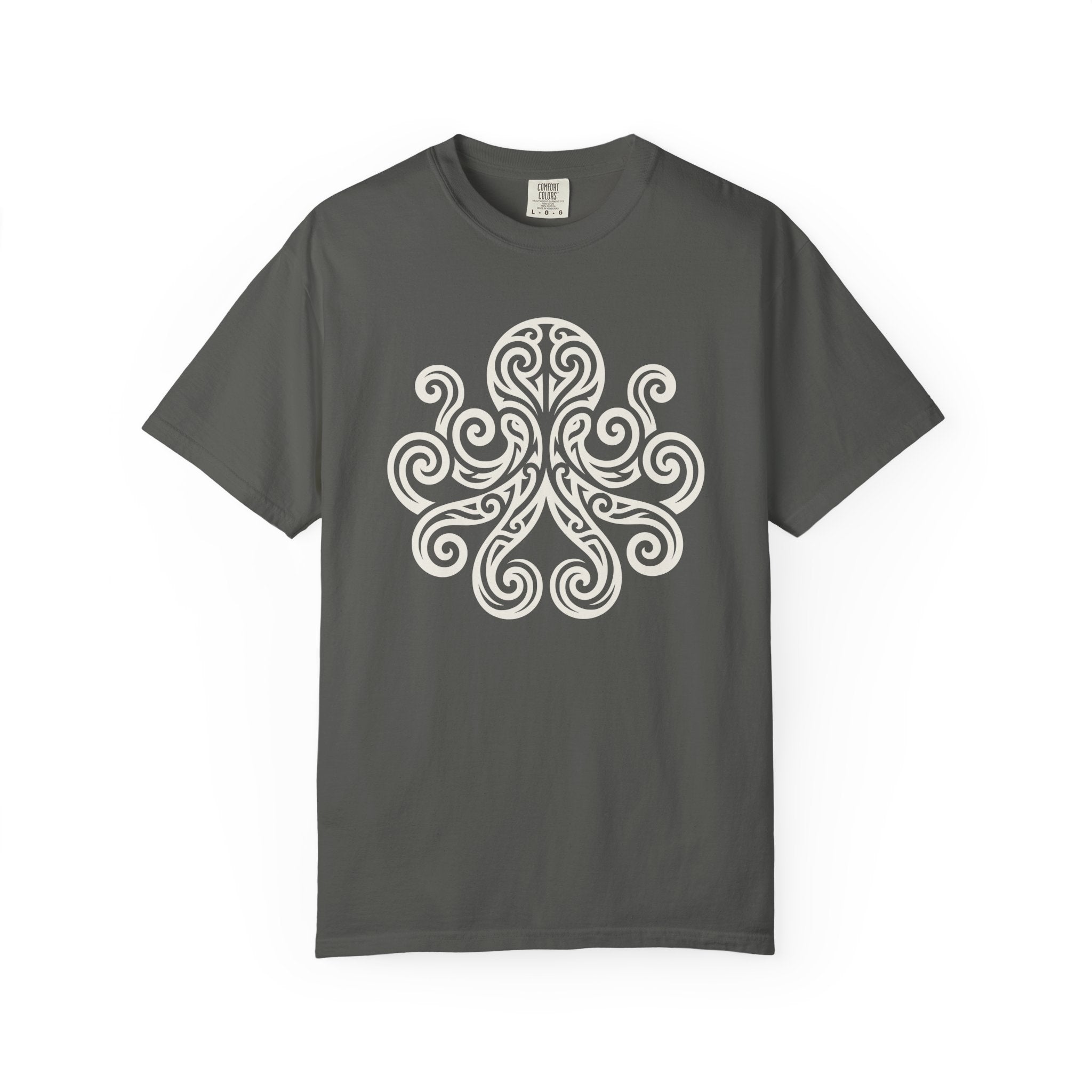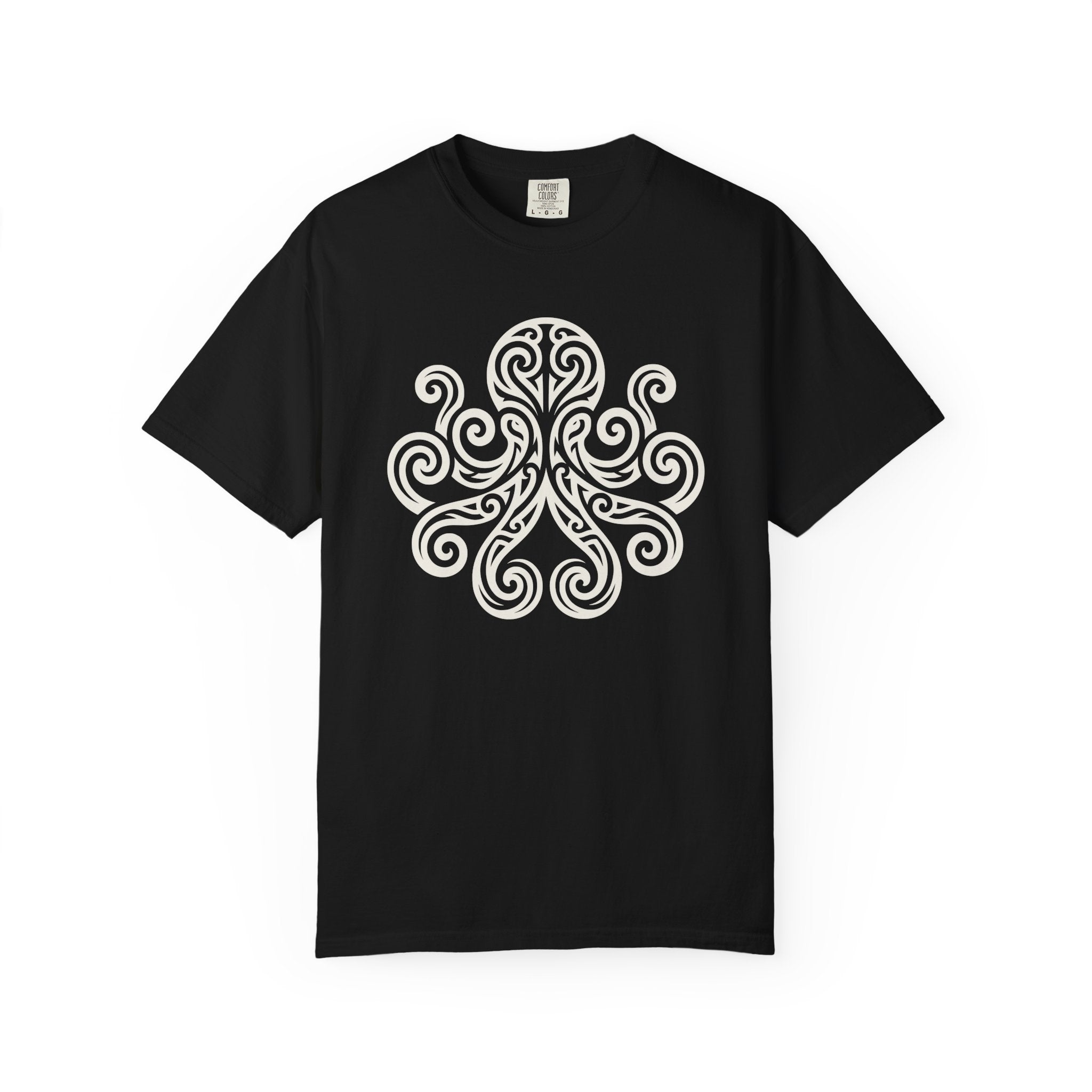 This t-shirt showcases a stunning, highly stylized octopus design, rendered with captivating swirling patterns and elegant, interconnected lines that create a sense of movement and depth. Often associated with intelligence, adaptability, and mystery, the octopus in this design evokes the profound depths of the ocean and the intricate pathways of creativity. Its aesthetic draws inspiration from ancient symbols, giving it a timeless and spiritual quality. This captivating graphic is perfect for those who are drawn to marine symbolism, appreciate intricate artistry, and seek a unique statement piece.