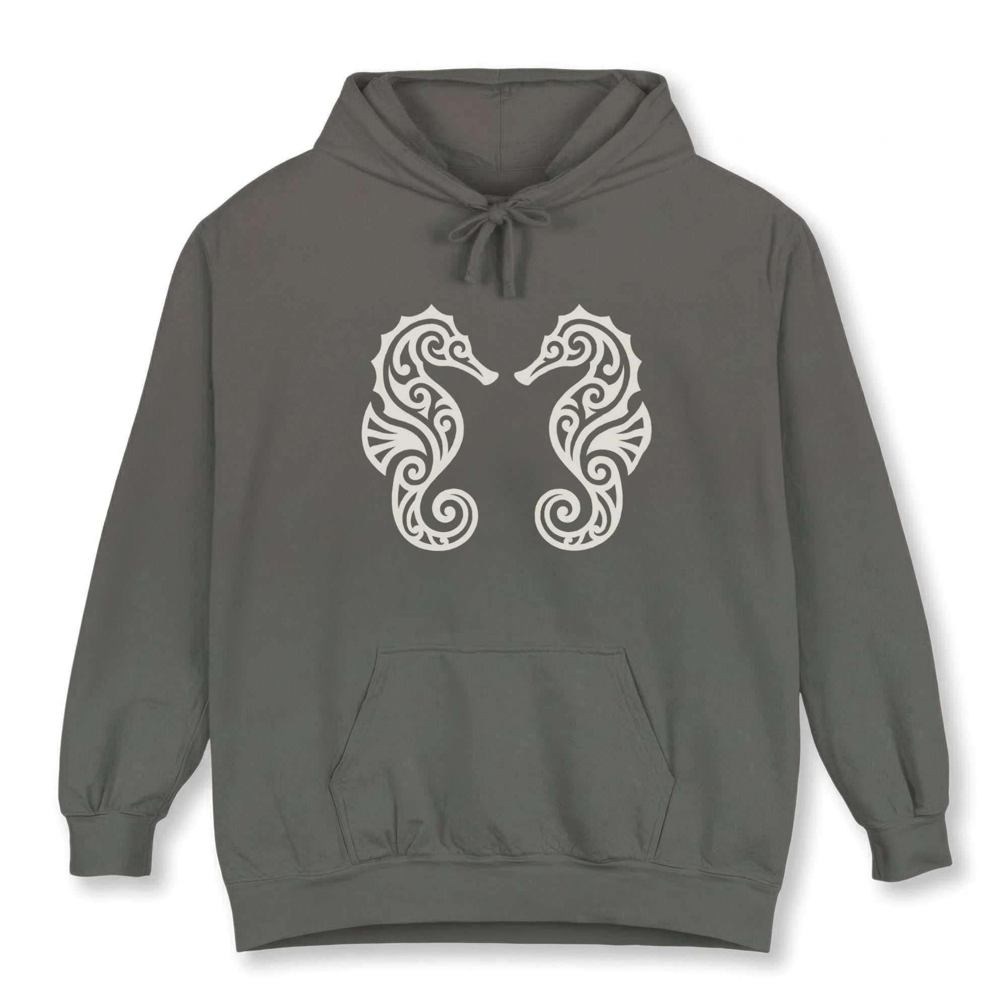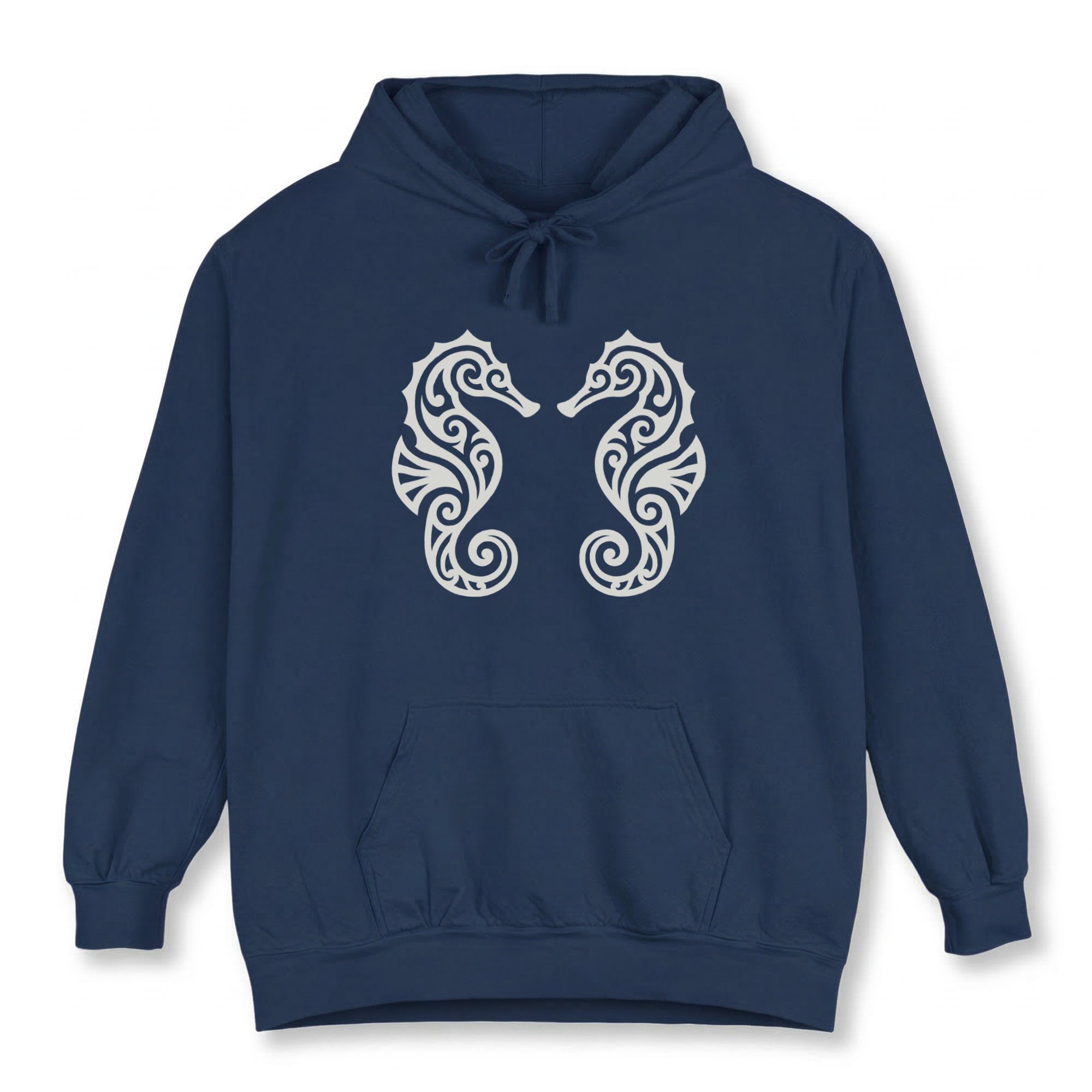 This hoodie features a captivating design of two intricately detailed seahorses, mirrored and facing each other, adorned with elegant swirling patterns. Seahorses are renowned symbols of patience, contentment, and unique charm. When presented as a pair in a graceful embrace, they beautifully represent deep connection, harmony, and loyalty, reminiscent of an oceanic dance. This unique graphic is a celebration of marine beauty and profound partnership, perfect for those who appreciate detailed artistry and symbolic depth. The design is both elegant and captivating, making it a subtle yet powerful statement piece for any wardrobe.