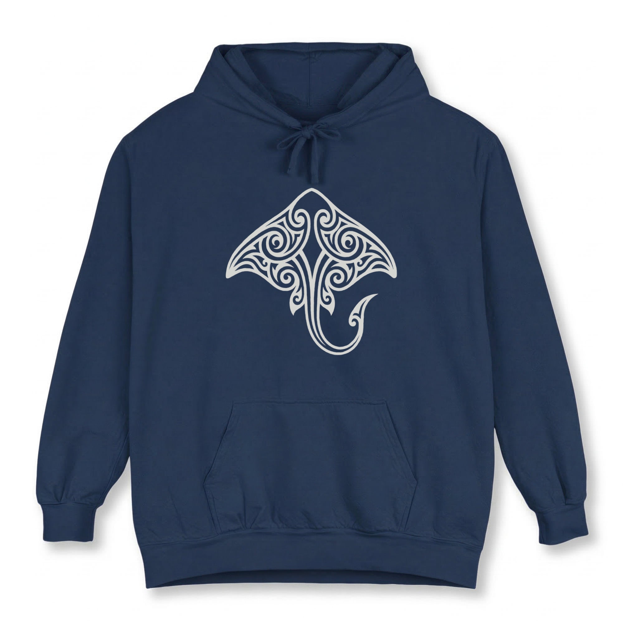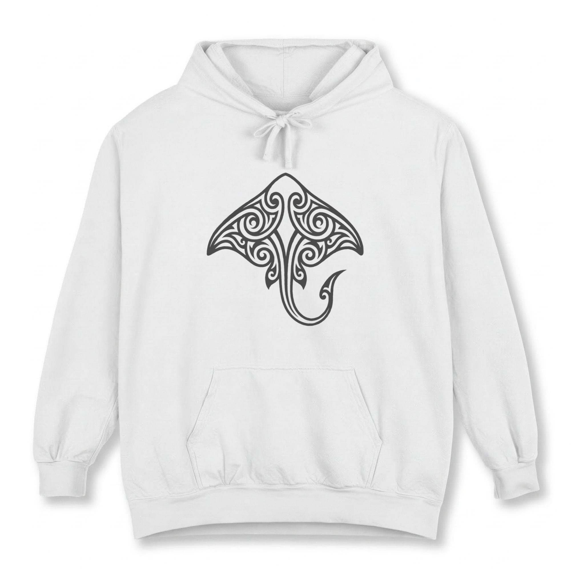 This hoodie features an intricately designed white graphic of a manta ray, rendered in a captivating tribal art style. Manta rays are powerful symbols of grace, adaptability, and protection in the ocean. The flowing, intricate patterns evoke a sense of ancient wisdom and a deep connection to nature and marine life. This unique design is both eye-catching and meaningful, perfect for those who appreciate oceanic symbolism, tribal aesthetics, or unique cultural artistry.