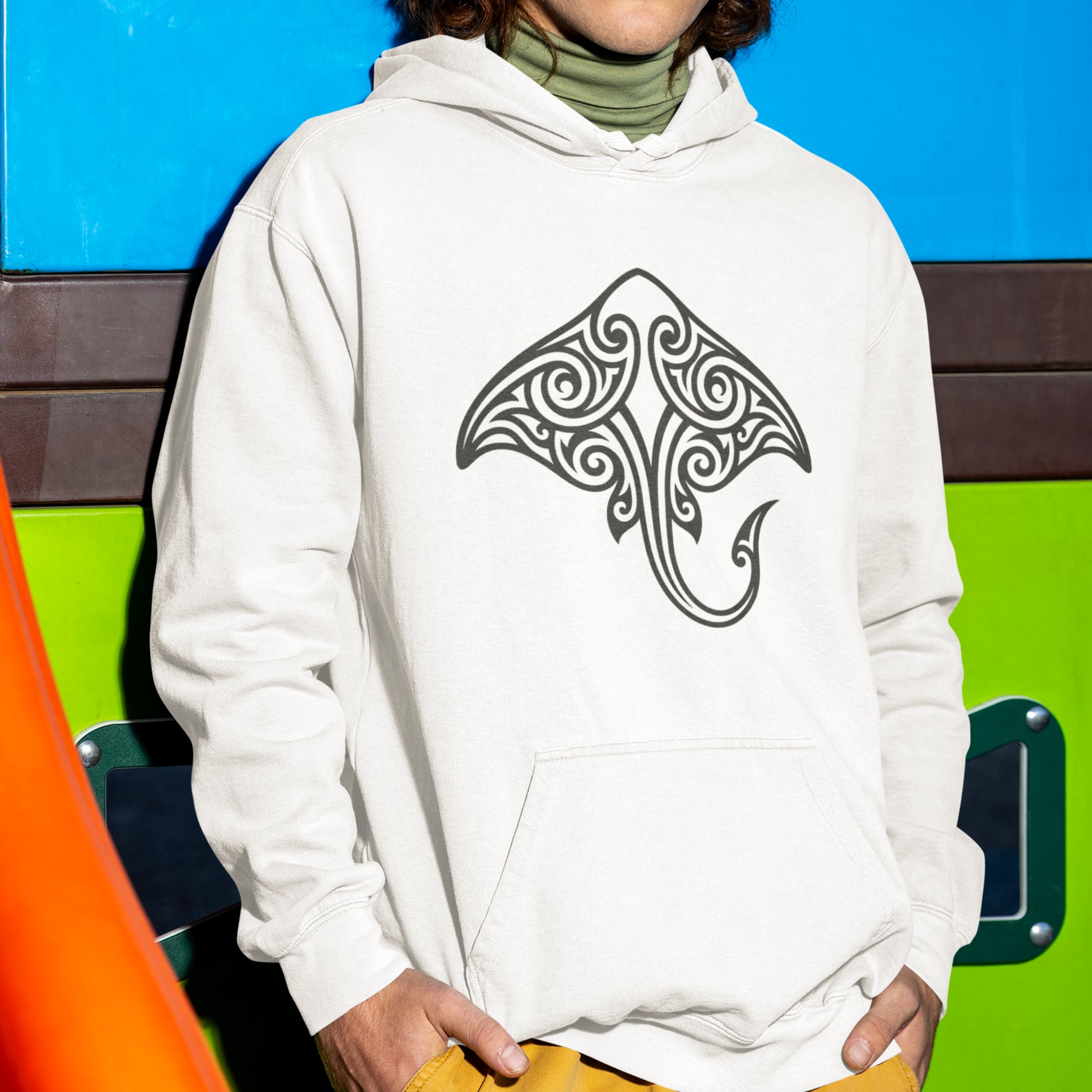 Pair this striking hoodie with your favorite jeans, shorts, or beachwear for a distinctive look. The design is versatile, allowing for various styling options. Embrace the power and beauty of the manta ray with this stylish and deeply symbolic hoodie.