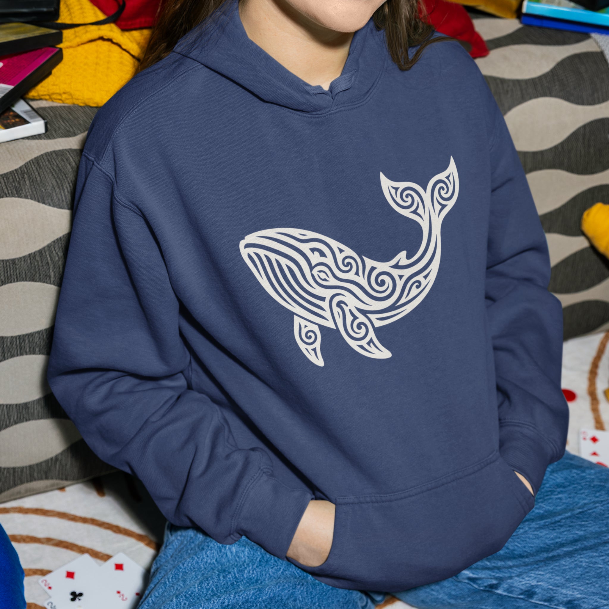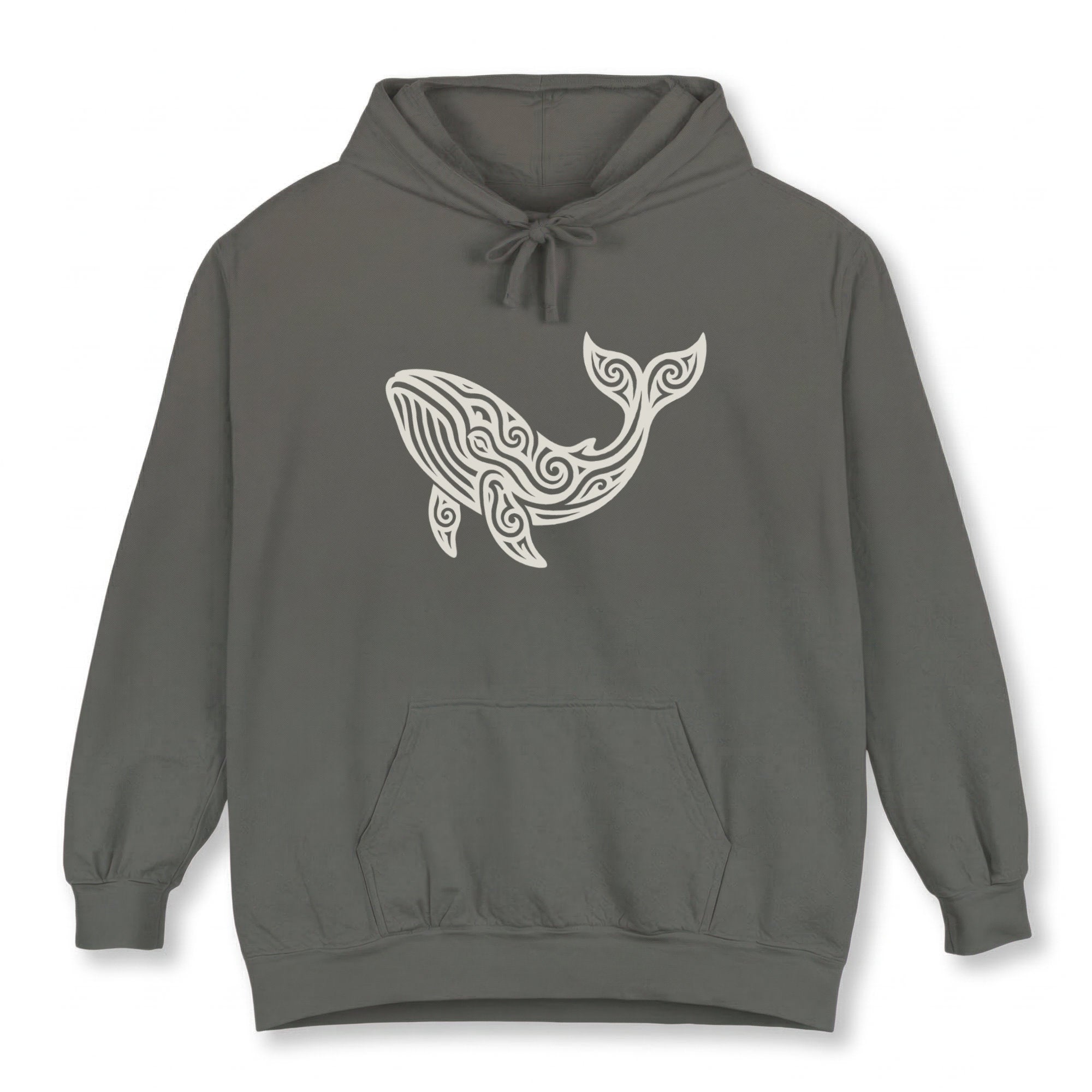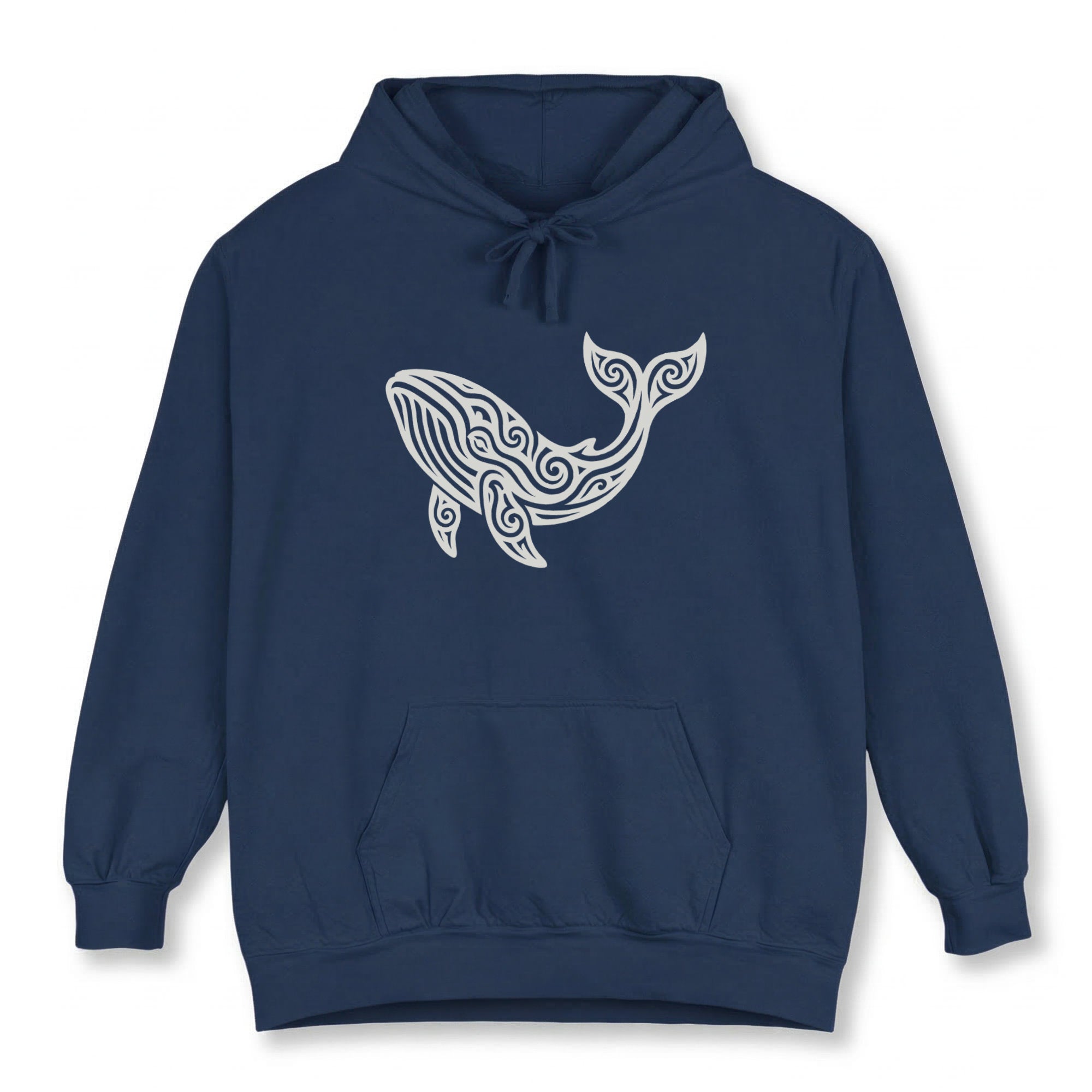This hoodie showcases a magnificent whale graphic, brought to life with intricate, flowing patterns reminiscent of tribal art and Celtic knotwork. The stylized design gives the majestic creature a mythical and elegant presence, evoking a sense of ancient wisdom and oceanic mystery. Whales symbolize wisdom, protection, emotional depth, and the profound mysteries of the ocean. This unique graphic is perfect for those who appreciate marine life, ancient artistry, and powerful symbolism. The design is captivating and unique, making a distinctive statement.