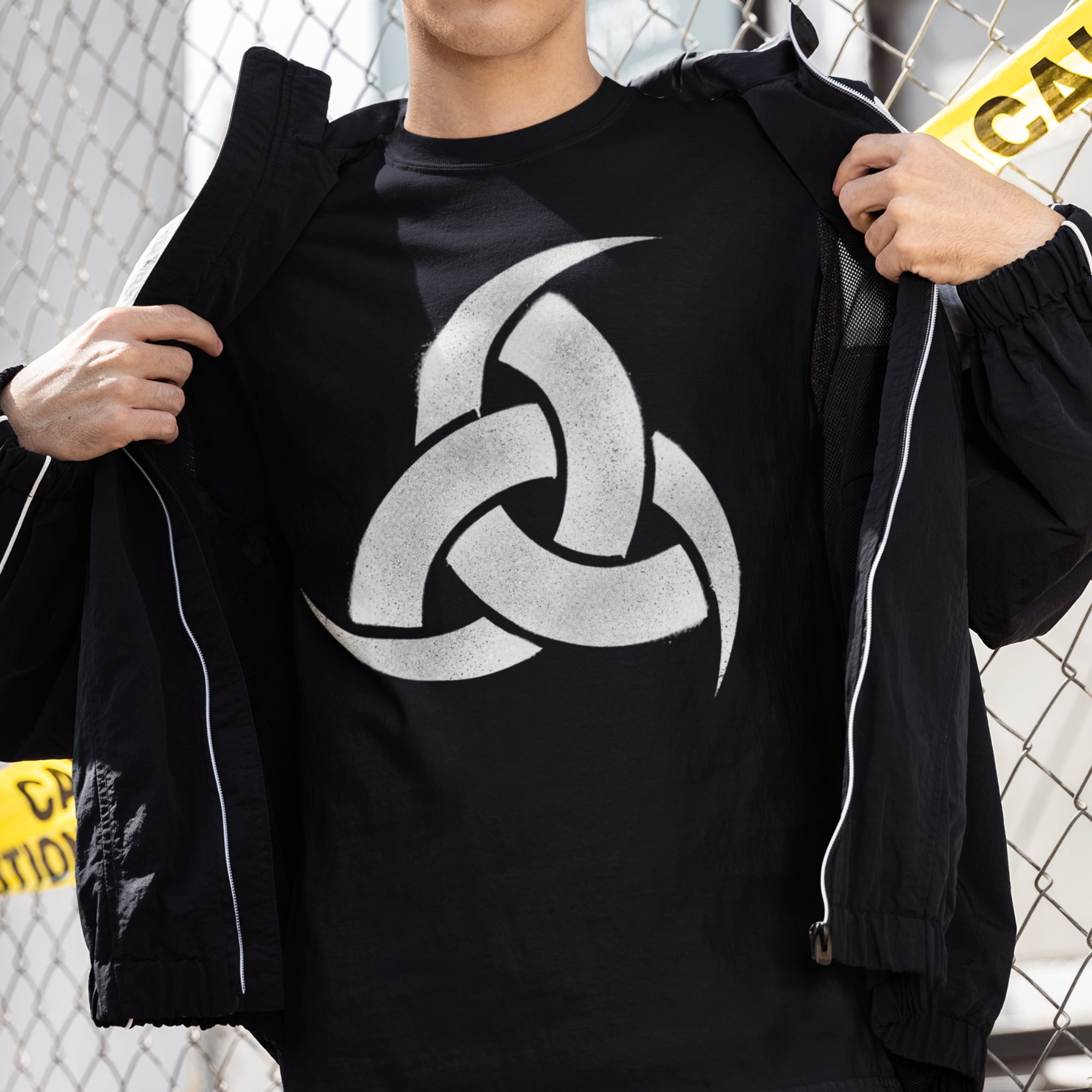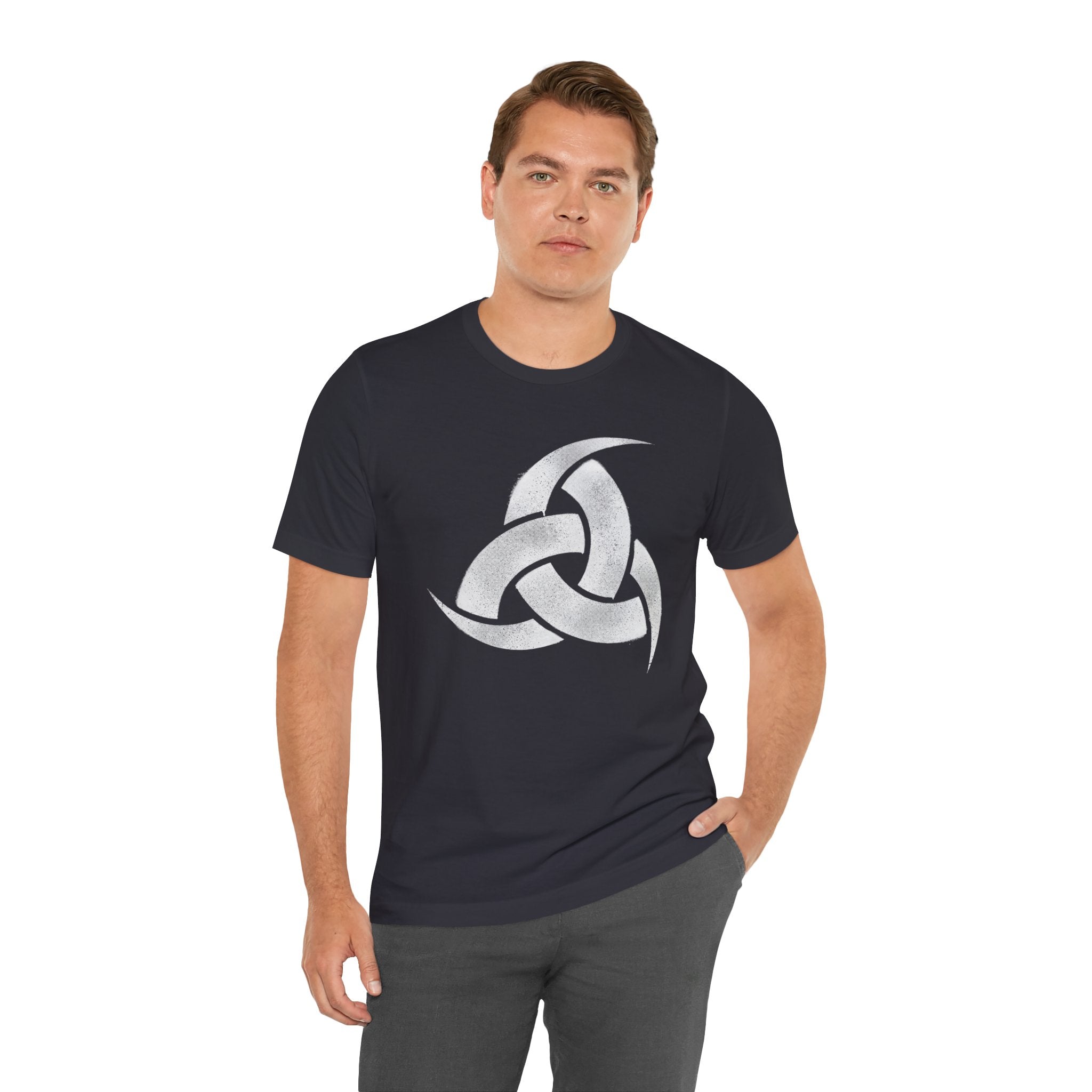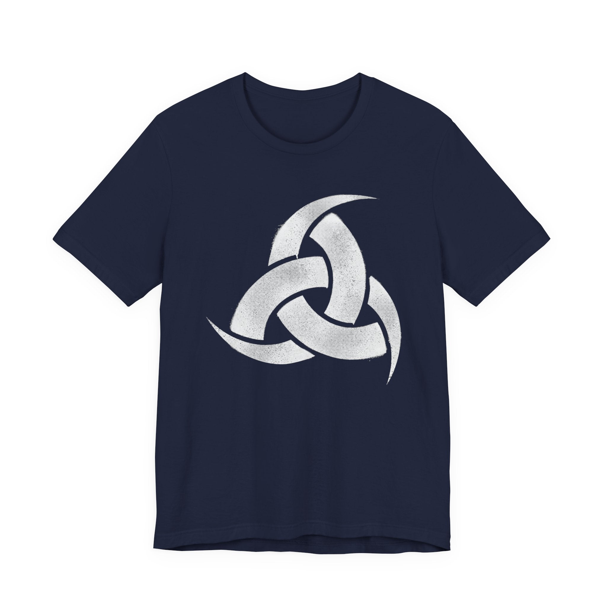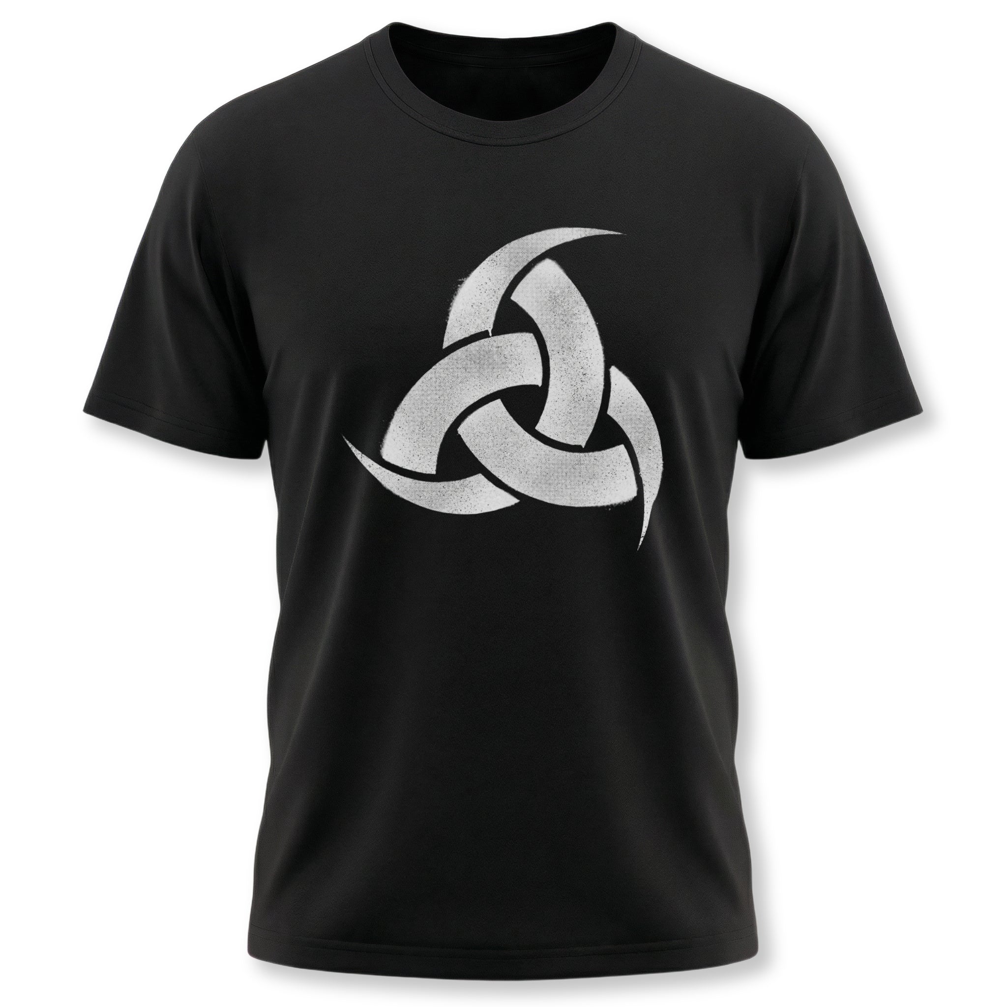 This t-shirt features a striking, distressed white graphic of Odin's Horn, also known as the Horn Triskelion. The design showcases three interlocking drinking horns, a powerful and ancient symbol rooted in Norse mythology. It evokes a deep connection to Viking lore, wisdom, and the sacred Mead of Poetry.