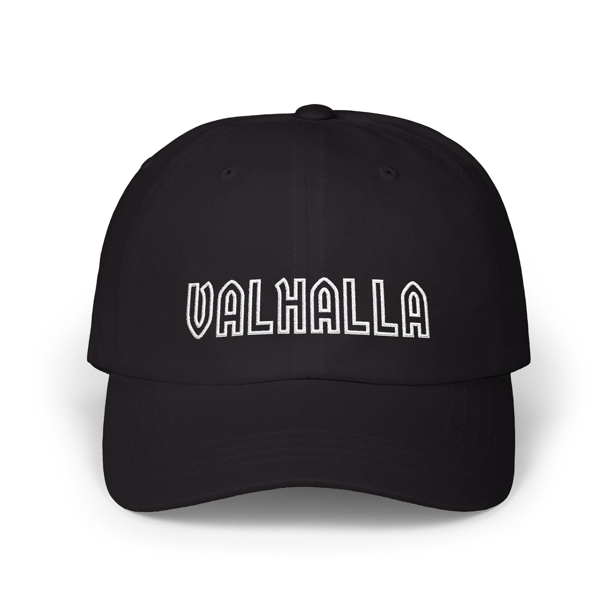 This hat features the word 'VALLHALLA' prominently embroidered in crisp white, utilizing a bold and stylized font that hints at ancient runes and Nordic artistry. Valhalla, in Norse mythology, is the majestic hall ruled by Odin, where brave warriors slain in battle are received to feast and prepare for Ragnarök. This design powerfully evokes themes of courage, honor, strength, and a legendary afterlife. It's a striking statement piece for those who resonate with Viking culture, epic sagas, or simply a bold, meaningful aesthetic, making it a standout addition for any wardrobe.