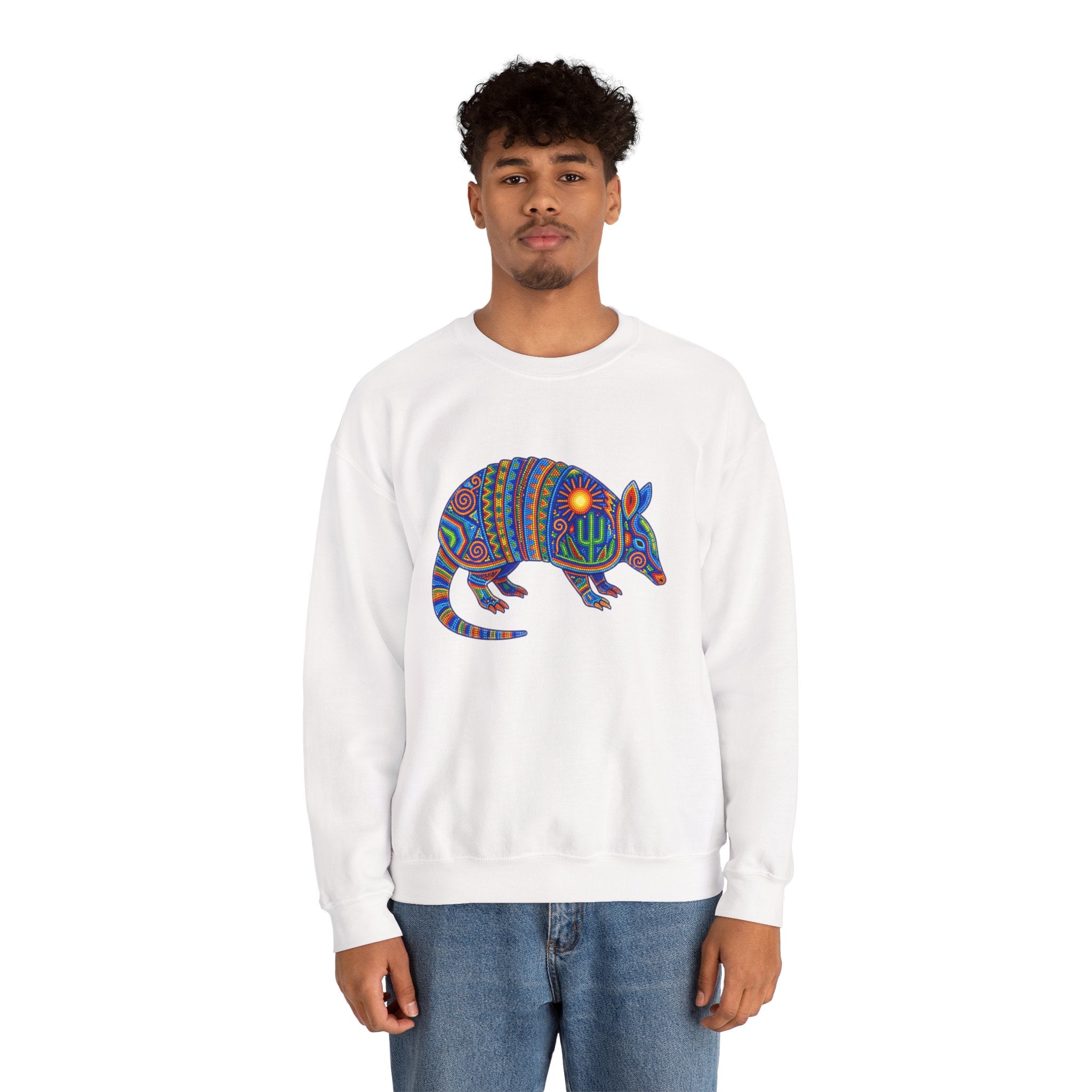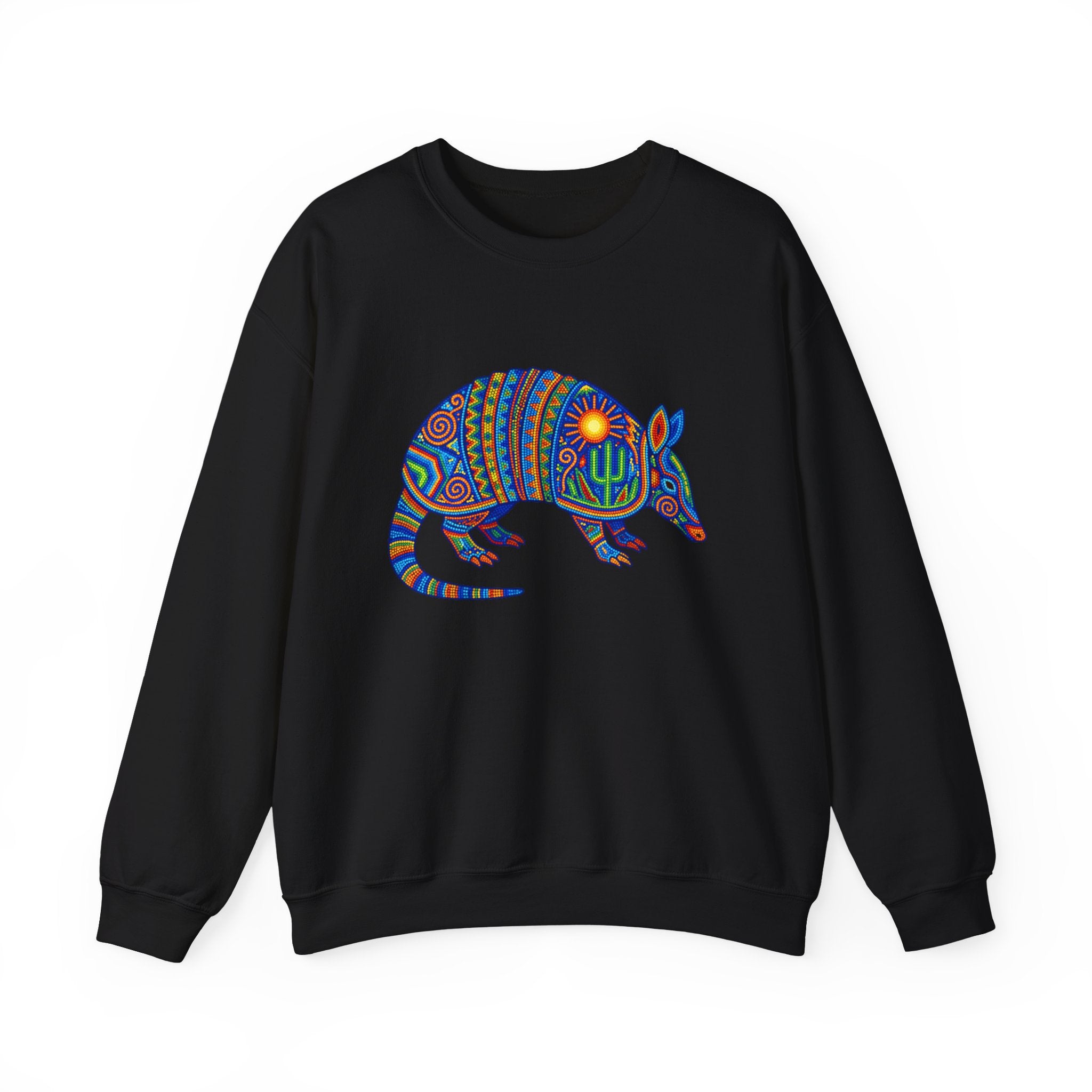 This sweatshirt showcases a mesmerizing armadillo design, rendered in a vibrant, intricate style reminiscent of traditional Huichol beadwork or yarn painting. Adorned with a radiant sun representing life and energy, and a resilient cactus symbolizing endurance, the armadillo itself is a powerful symbol of protection, grounding, and adaptability. Each meticulous dot and swirling pattern tells a story of connection to nature and ancient wisdom. This unique graphic is a celebration of cultural artistry and the spirit of the desert, making it a bold and eye-catching statement piece for any wardrobe.