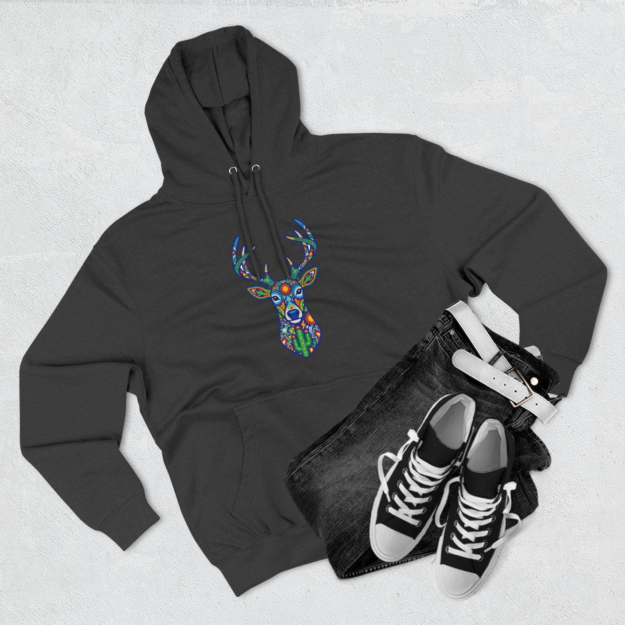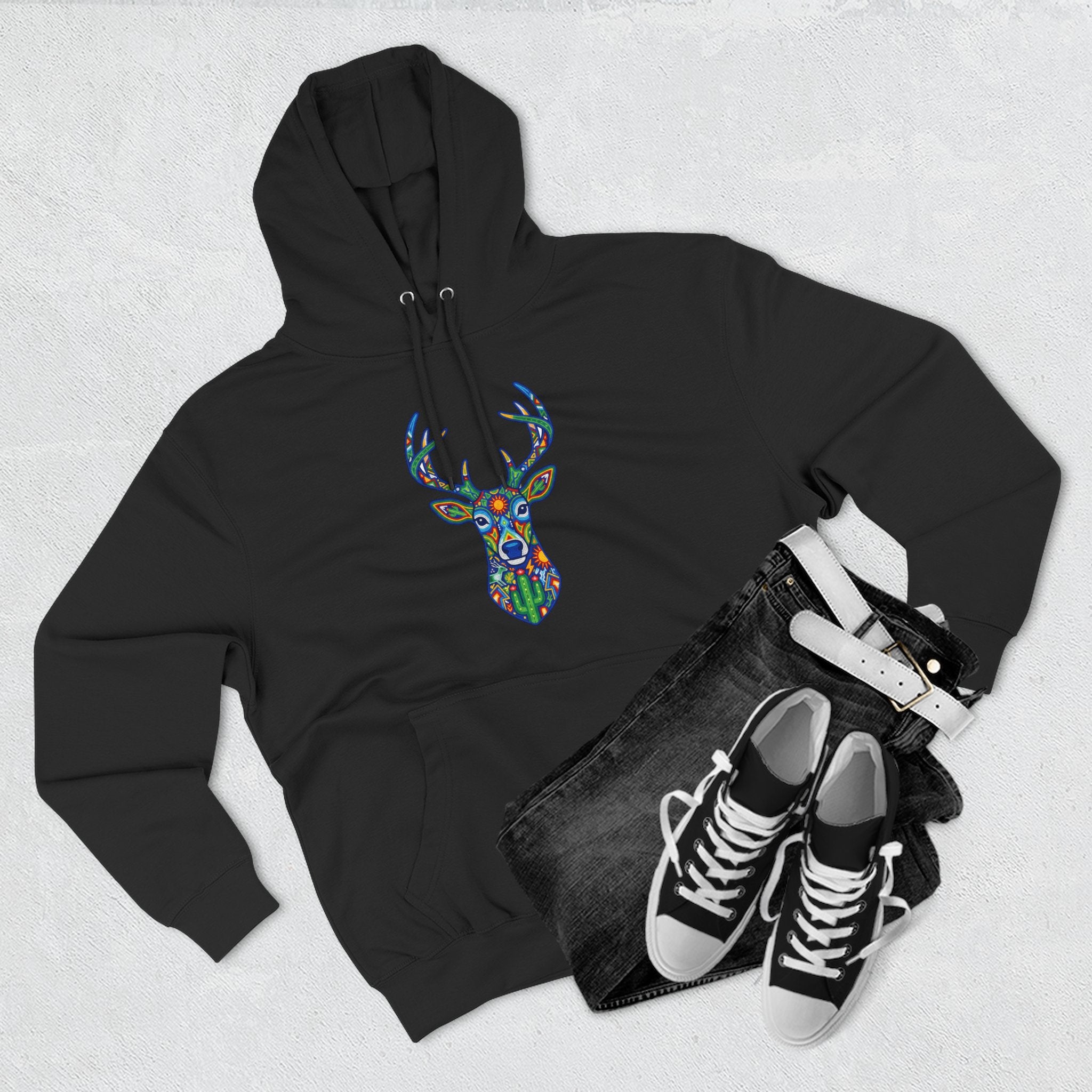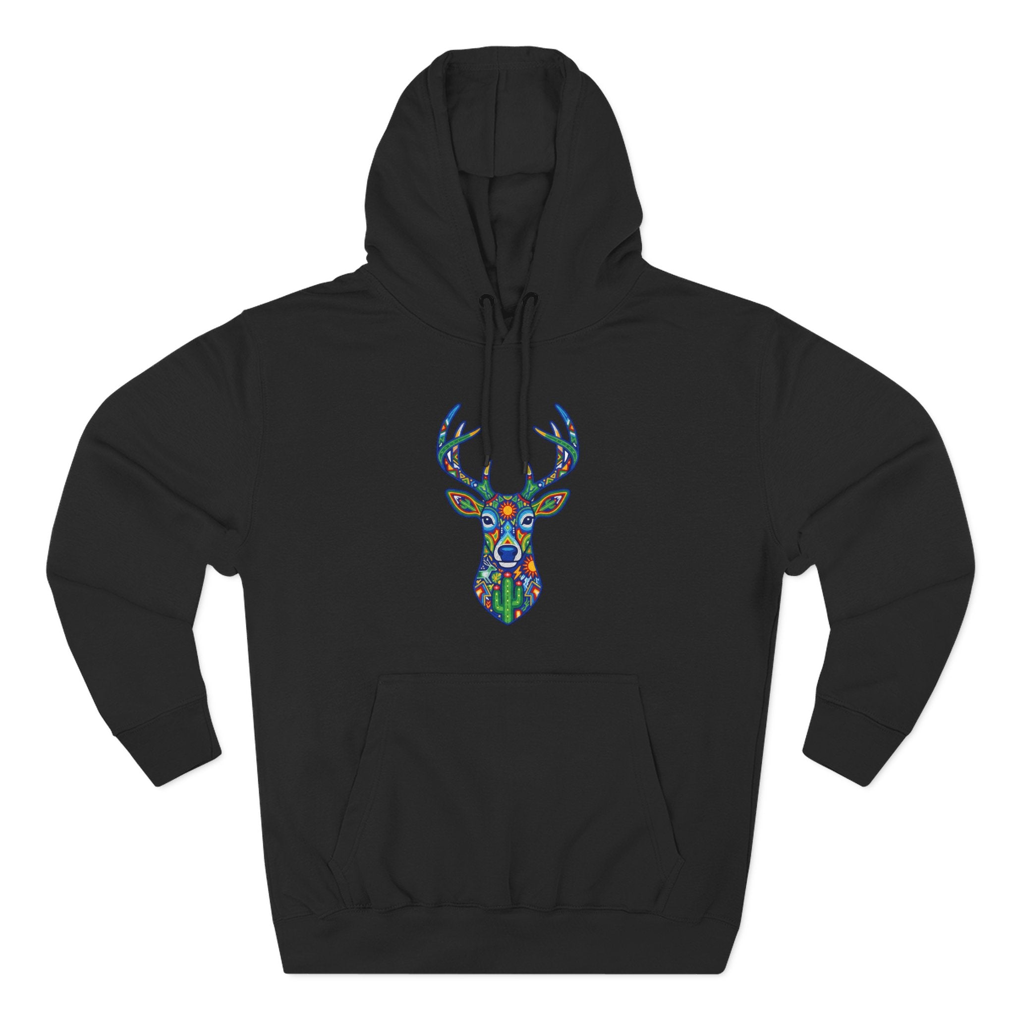This hoodie features a stunning, intricately patterned deer head, rendered in a vibrant mosaic-like style. Inspired by the rich artistry of indigenous cultures, particularly reminiscent of Huichol art, the design showcases a harmonious blend of bold colors and geometric motifs. The majestic deer, a revered symbol of gentleness, spiritual guidance, and a deep connection to nature, is depicted with subtle cactus elements, symbolizing resilience and the spirit of the desert. This unique graphic is a powerful statement piece for those who appreciate cultural depth, spiritual symbolism, and truly eye-catching artistic expression, making it a vibrant ode to the wild and the artistic spirit.